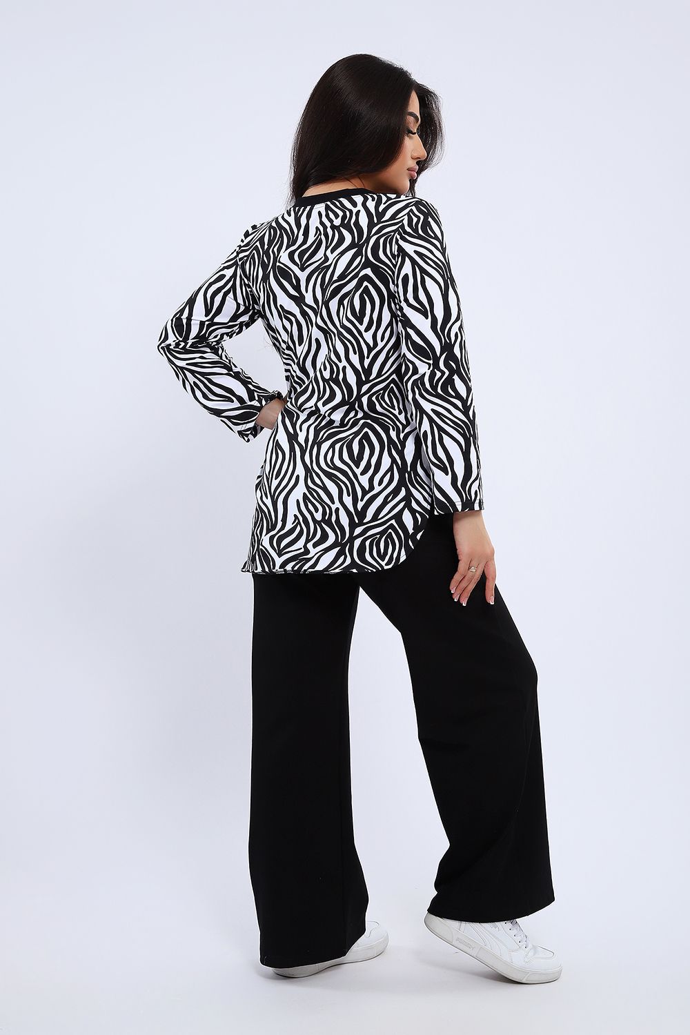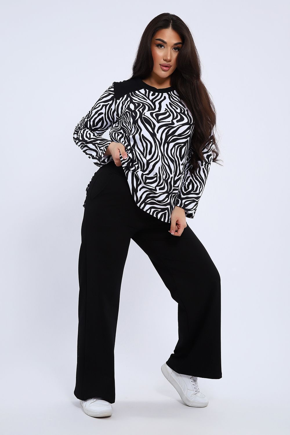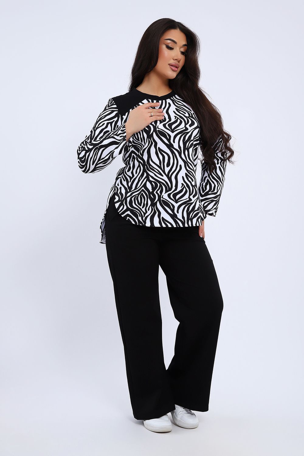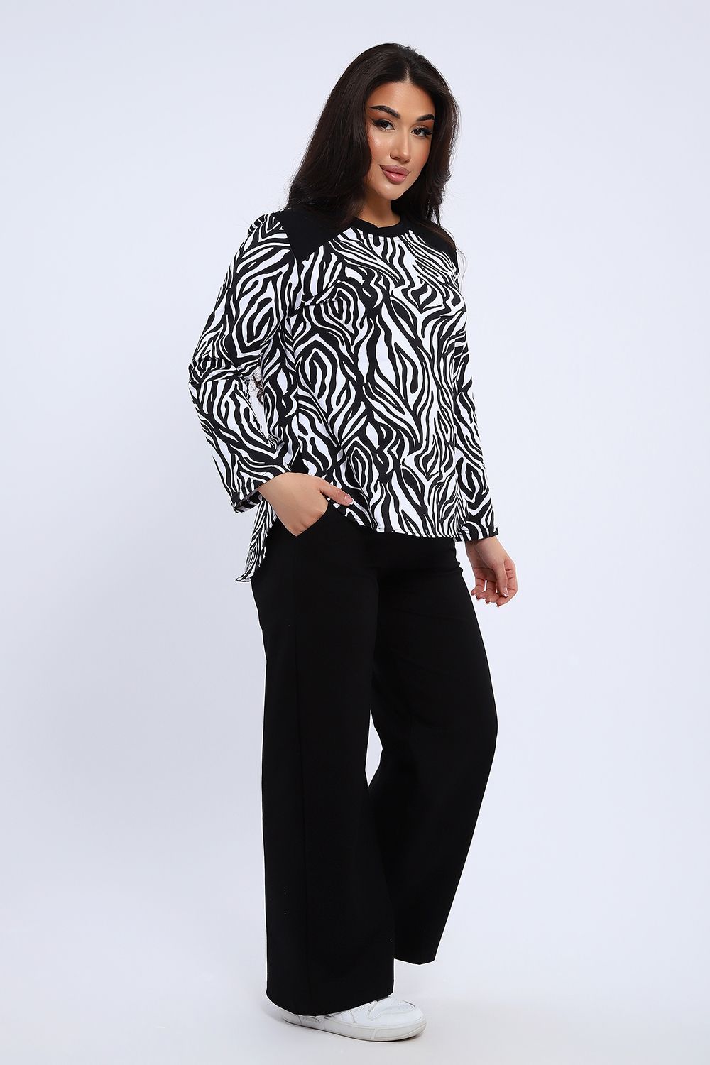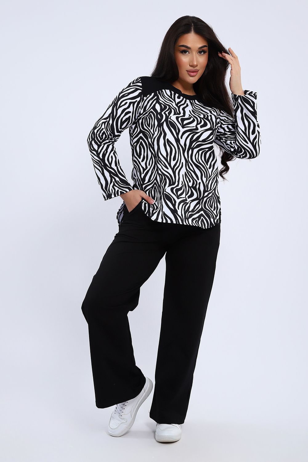 Оригинальный брючный костюм.Трикотажный женский костюм предназначен для девушек, ценящих комфорт, удобство и спортивный стиль. Блузка со вставками, штаны клеш в стиле палаццо с карманами имеют завышенную посадку и визуально вытягивают фигуру, что особенно актуально для невысоких и полных девушек. Модель подчеркивает фигуру и скрывает все недостатки. Подойдет для прогулок в кино с друзьями, путешествий, работы в офисе, праздника, а также как вечерний модный образ на свидание.
