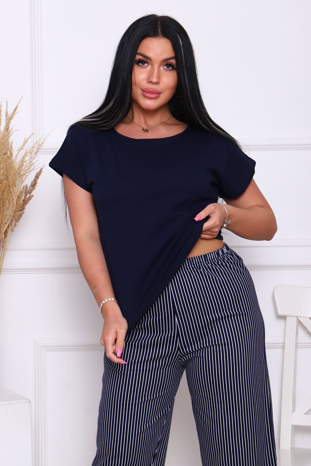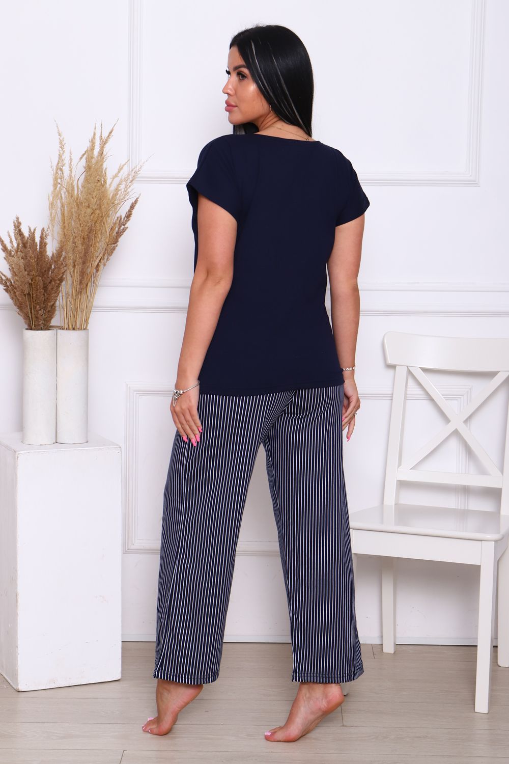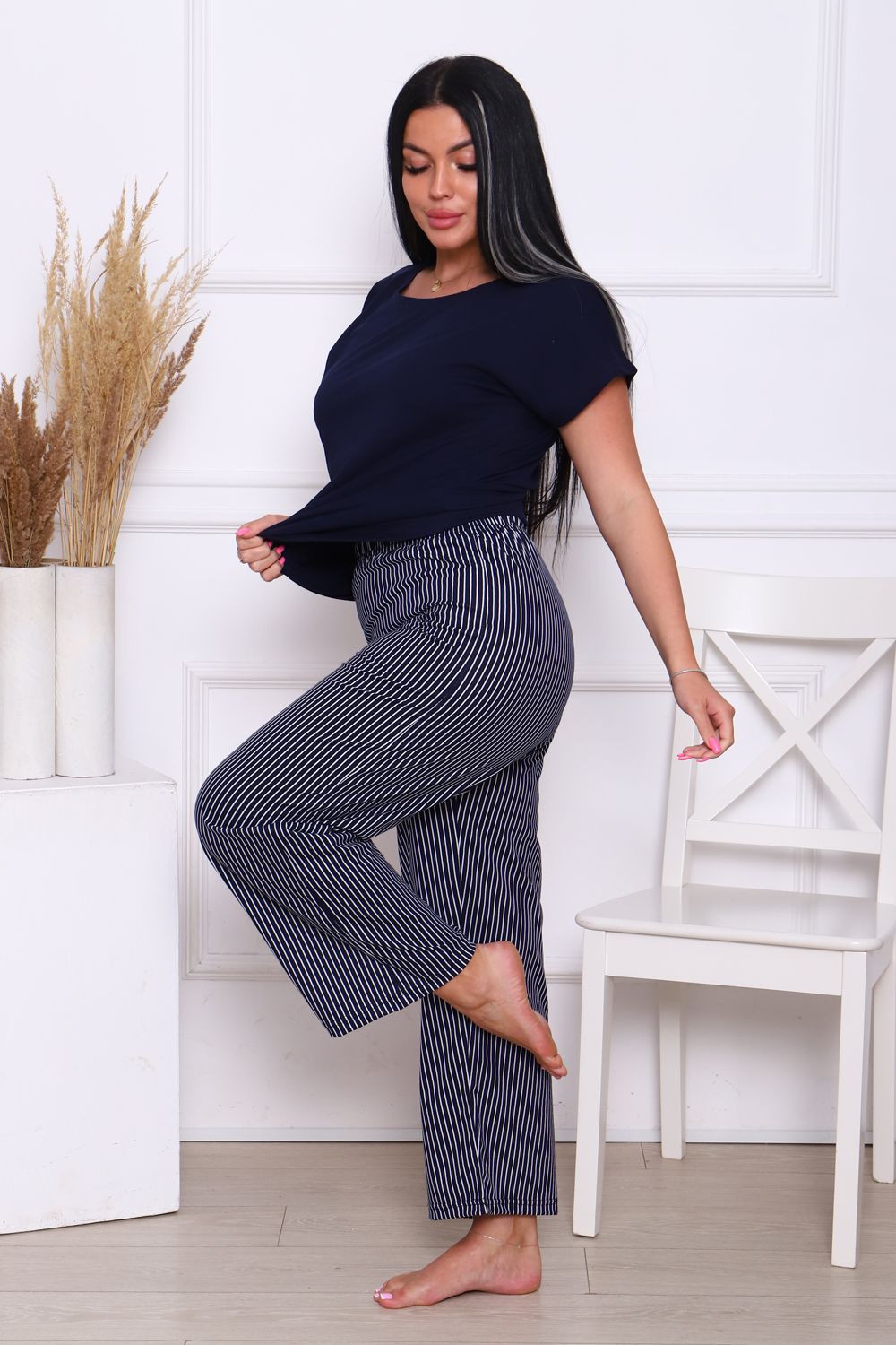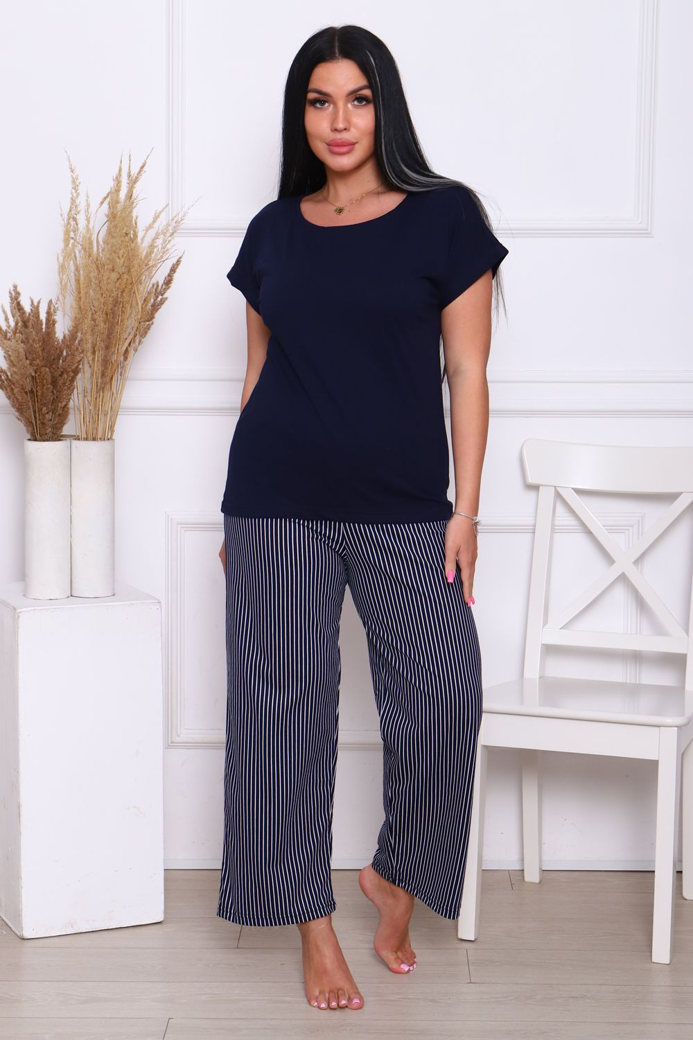 Комплект со штанами и кофтой – идеальный выбор для вас! Этот костюм выполнен из натурального хлопка, который позволят вашей коже дышать в любое время года. Домашний костюм состоящий из штанов и футболки дизайн подчеркнет ваш стиль и подойдет для любого настроения – будь то классический или молодежный. Популярный полосатый дизайн позволят подобрать костюм для любой женщины – от пышных до маленьких размеров. Этот костюм – отличный выбор для дома, дачи или для ночного отдыха.
