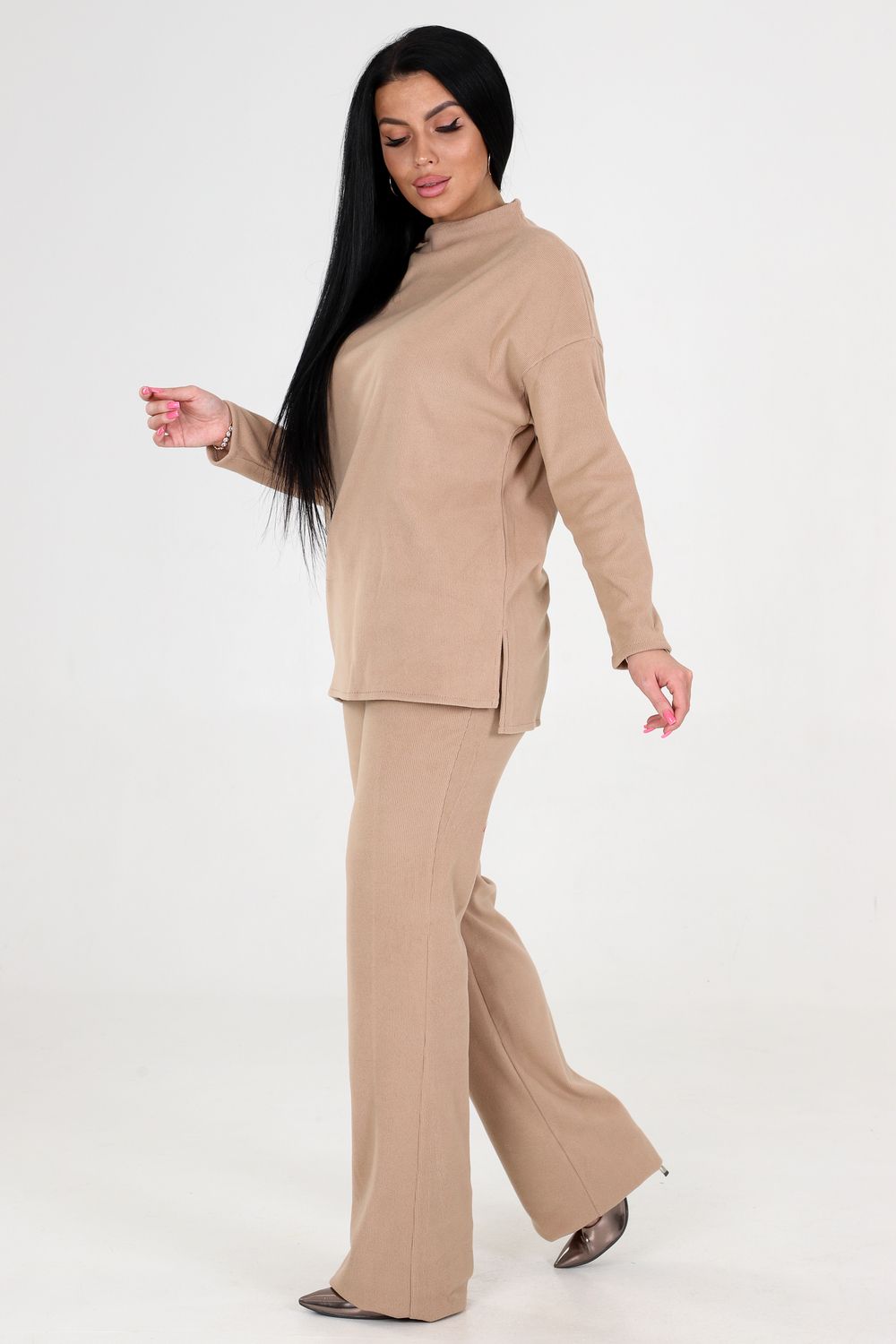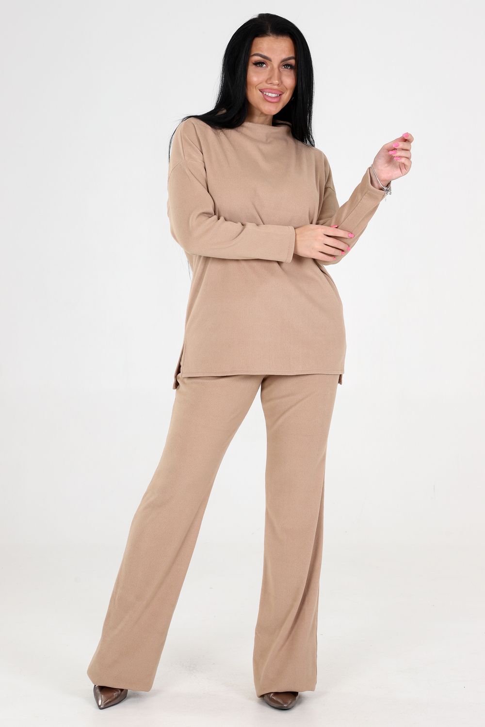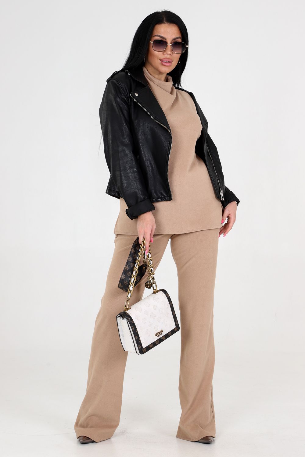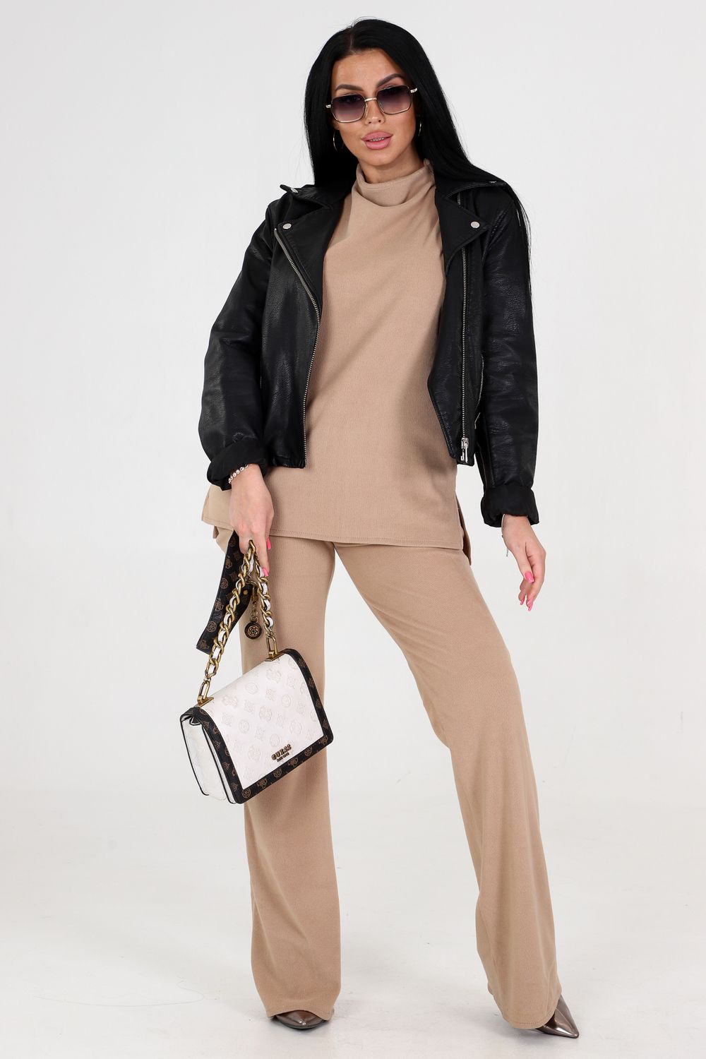 Костюм женский двойка состоит из туники свободного кроя и брюк на резинке. Туника имеет стойку на горловине и рукава длиной до запястья, обеспечивая теплую защиту для вашего верхнего тела. А брюки в стиле палаццо добавляют дополнительный комфорт и свободу движений.