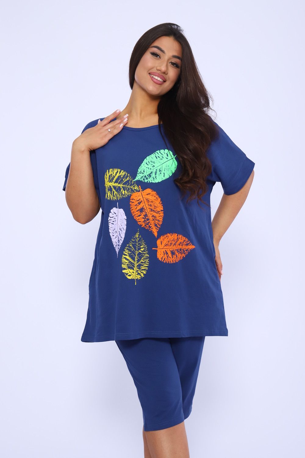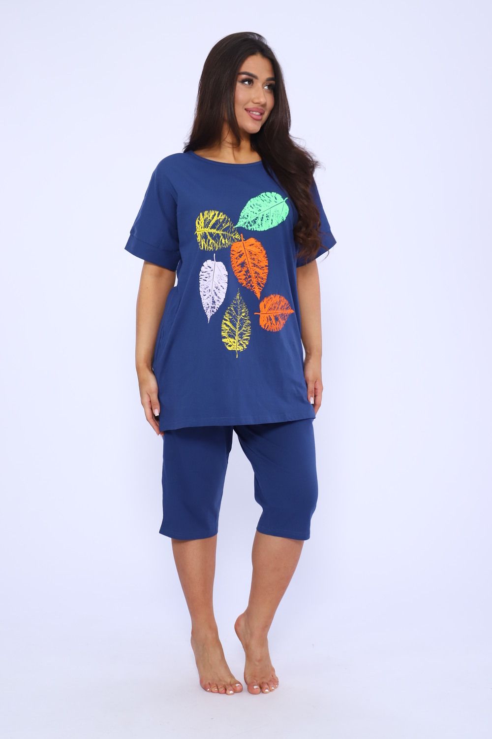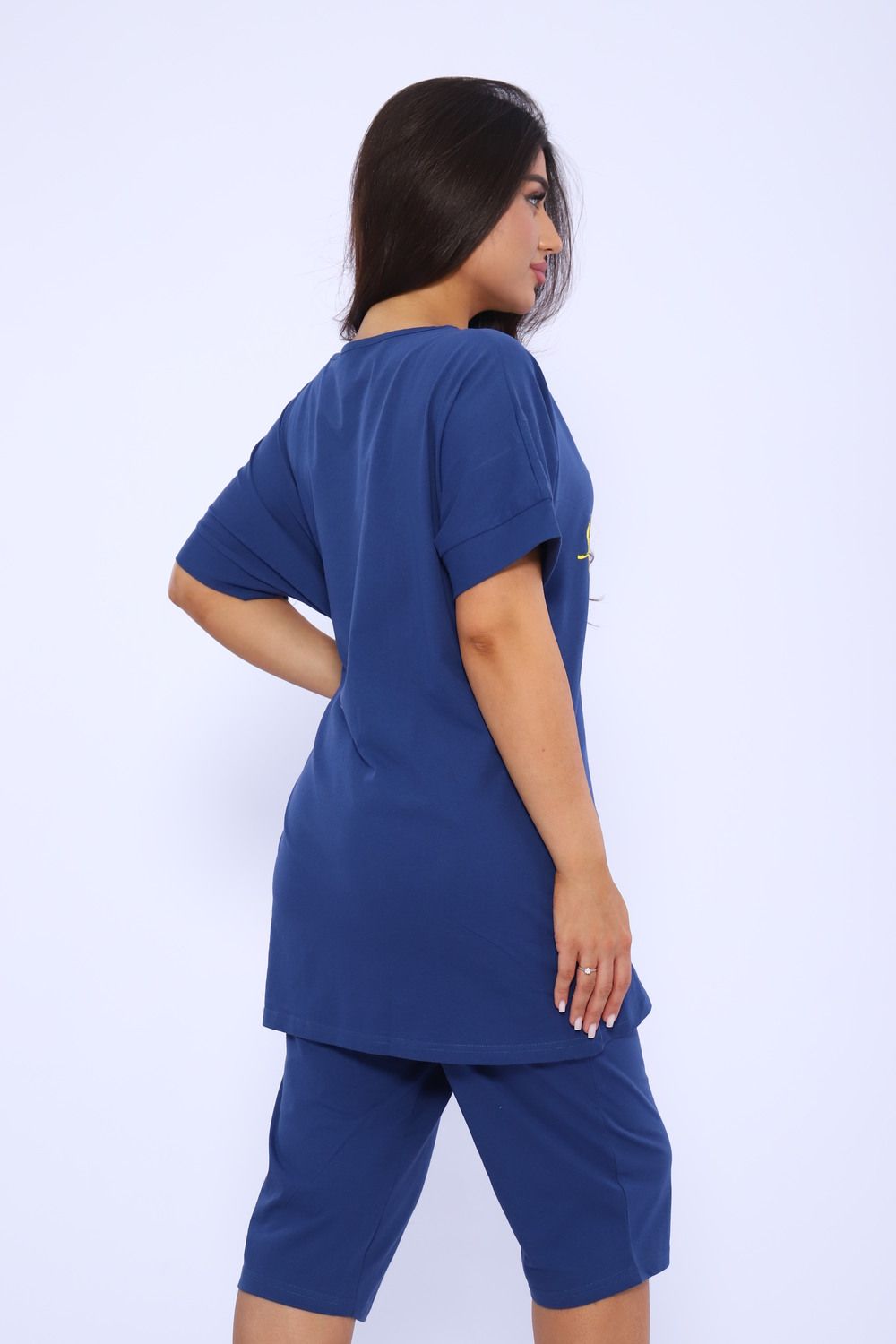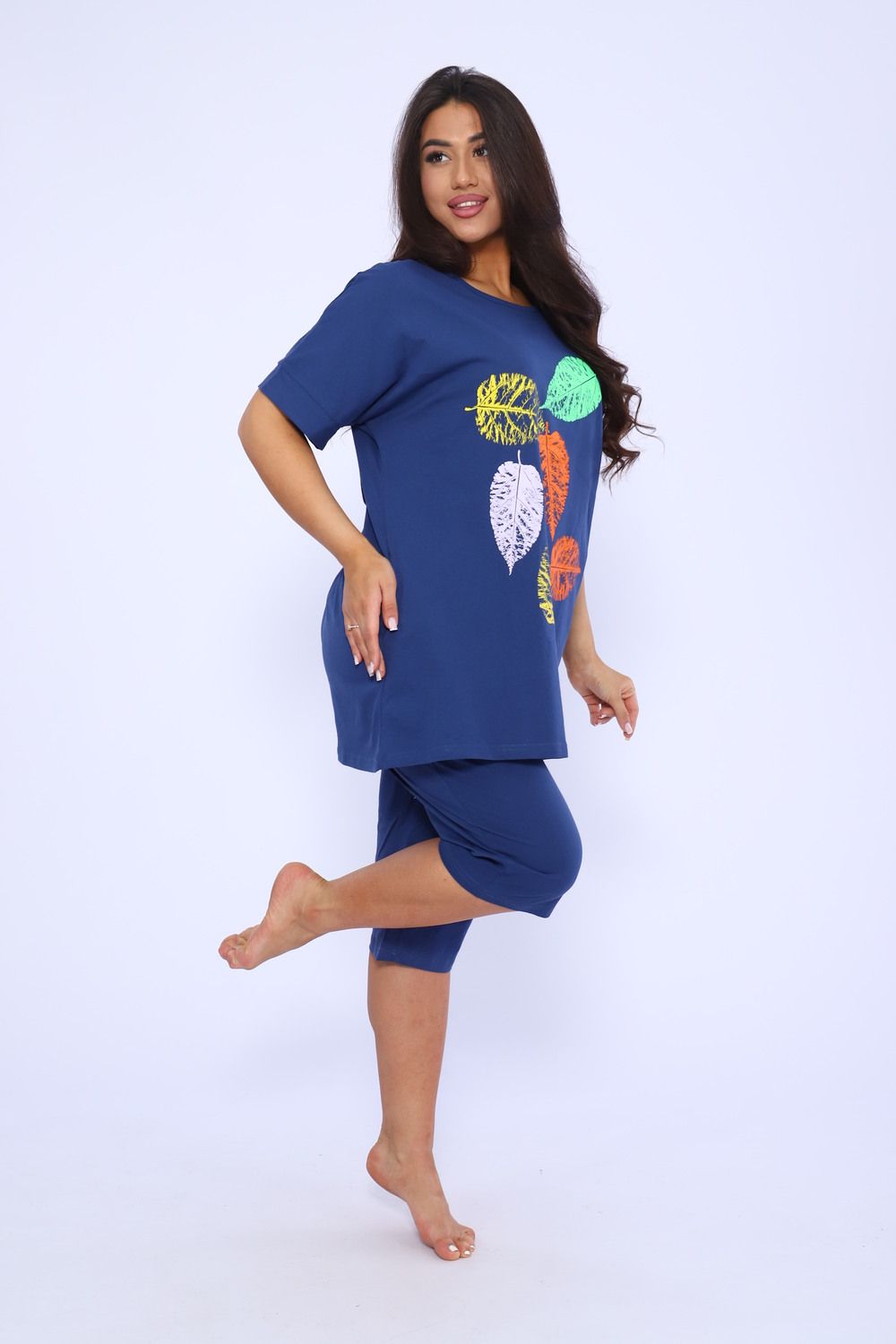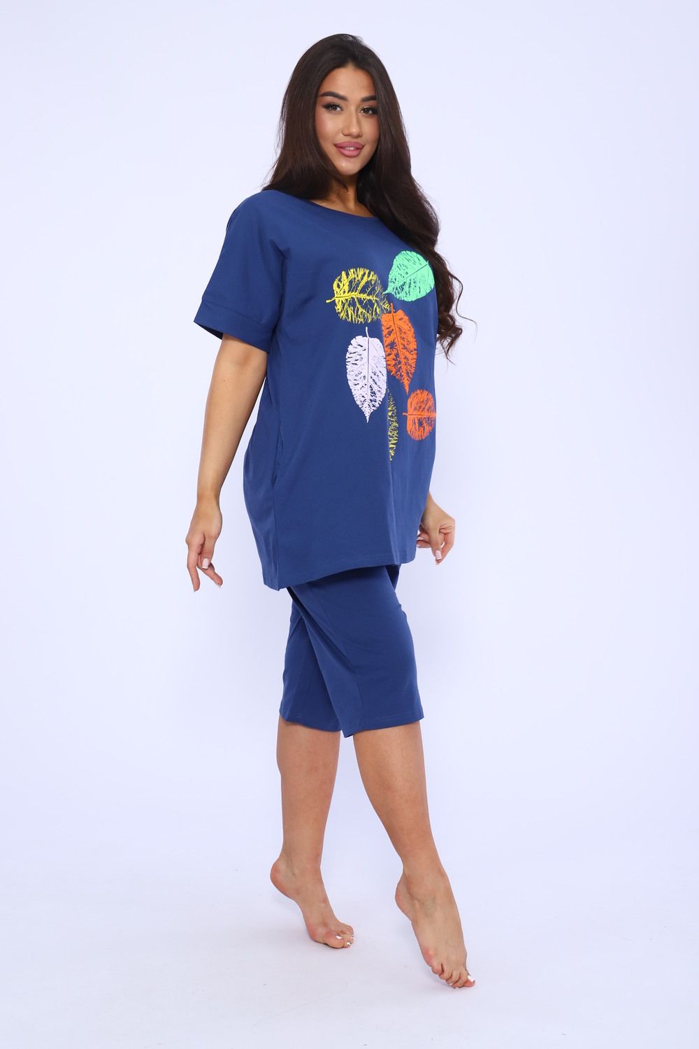 Домашний костюм женский изготовлен из ткани кулирка - мягкого и гладкого трикотажного полотна из хлопка. Костюм женский для дома и отдыха состоит из удлиненной футболки и бридж. Футболка прямого кроя, горловина круглая, обработана окантовкой, по бокам карманы. Рукав короткий. На полочке выполнен принт. За счет свободного кроя, брюки очень удобны и комфортны в эксплуатации. Состав: 100% хлопок.