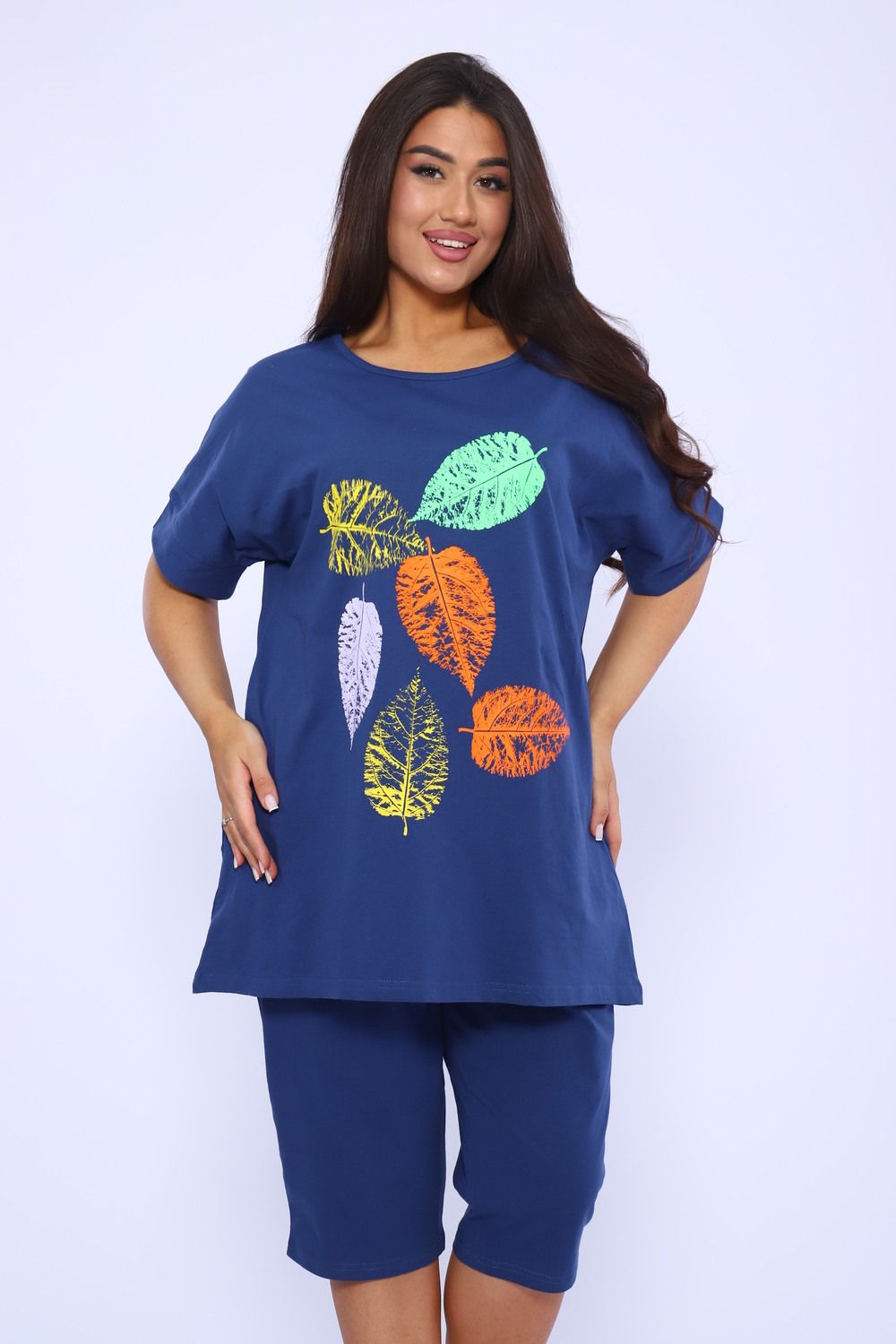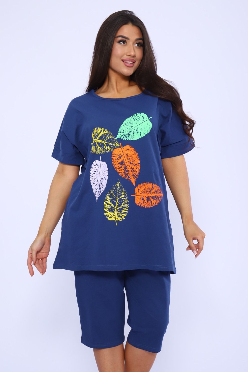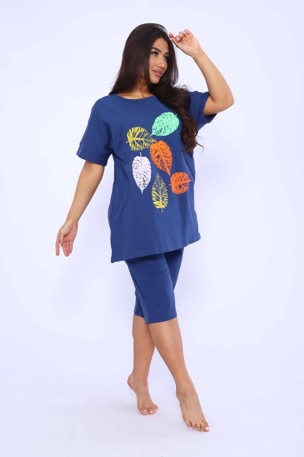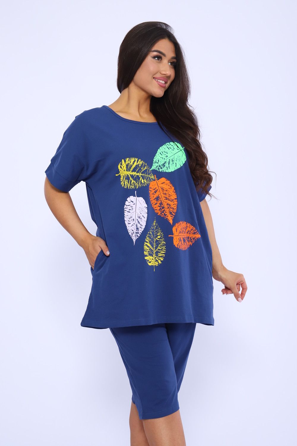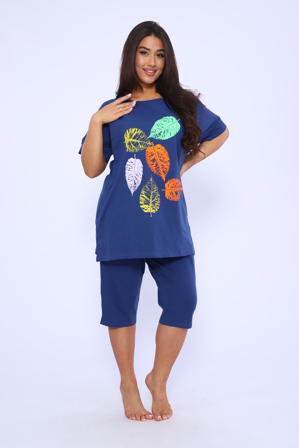 Домашний костюм женский изготовлен из ткани кулирка - мягкого и гладкого трикотажного полотна из хлопка. Костюм женский для дома и отдыха состоит из удлиненной футболки и бридж. Футболка прямого кроя, горловина круглая, обработана окантовкой, по бокам карманы. Рукав короткий. На полочке выполнен принт. За счет свободного кроя, брюки очень удобны и комфортны в эксплуатации. Состав: 100% хлопок.