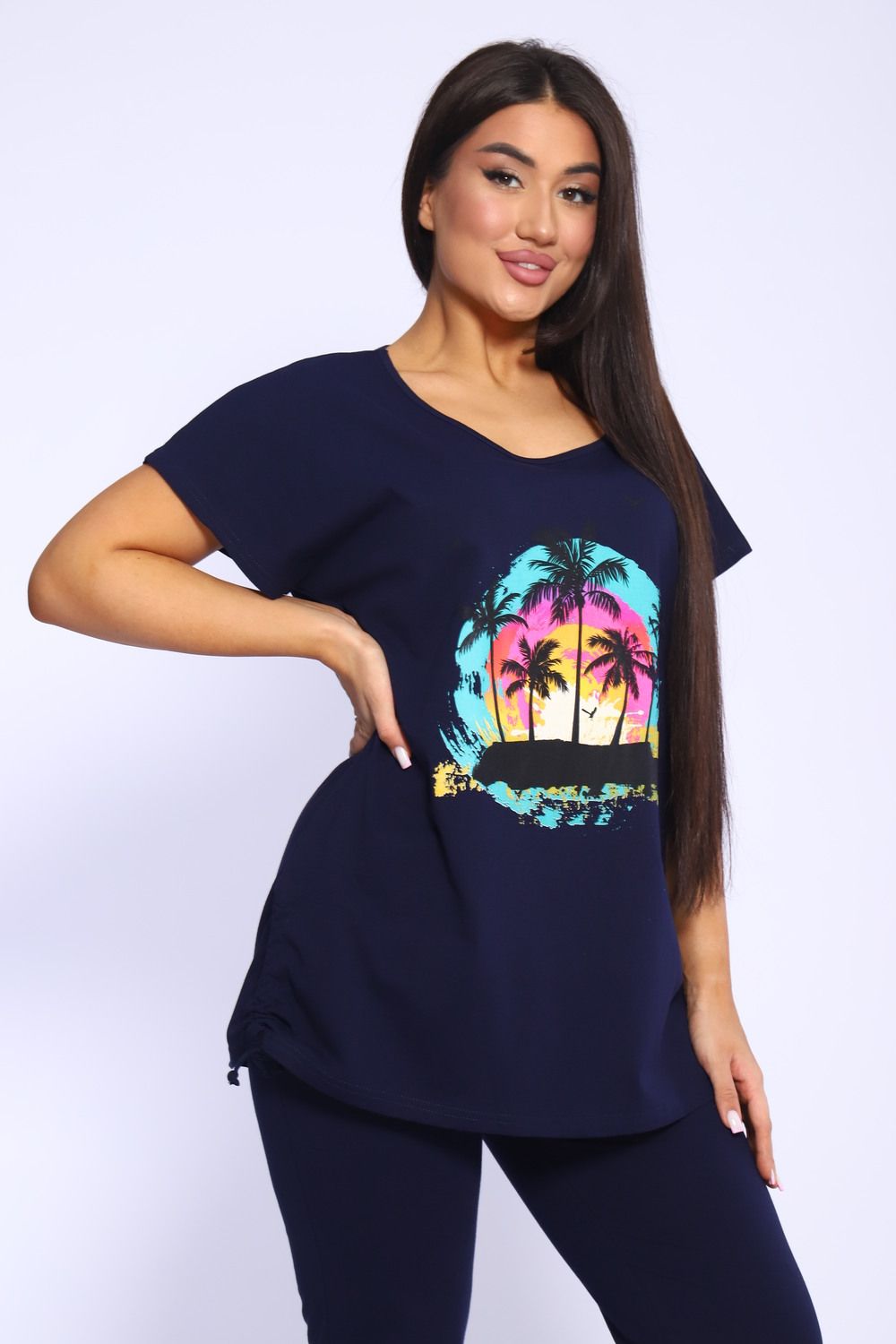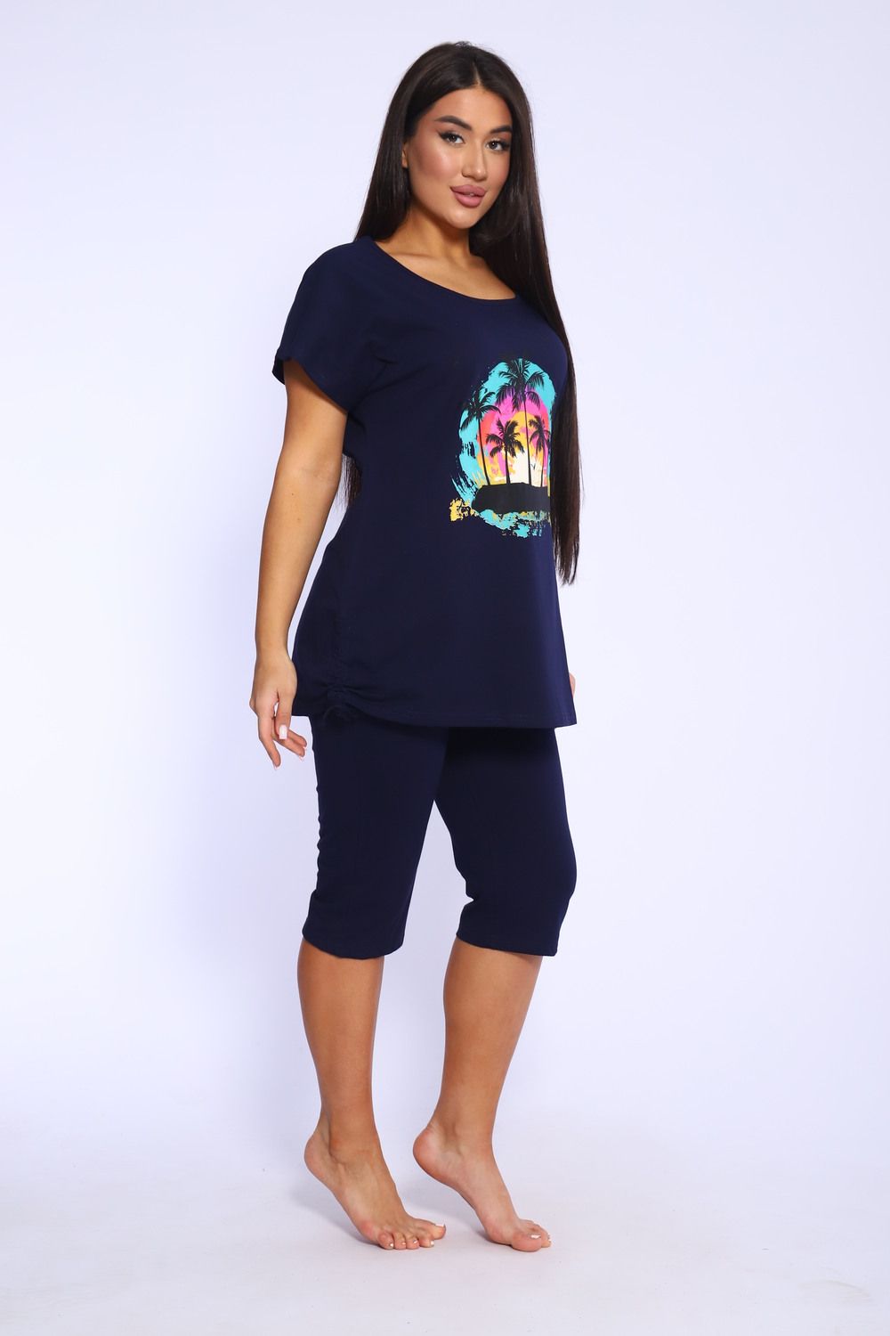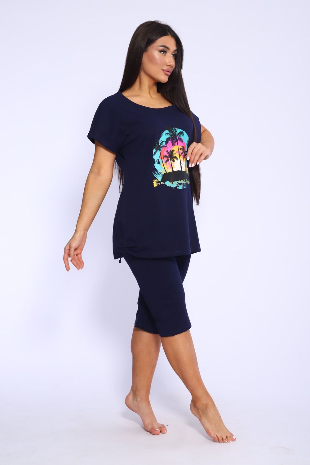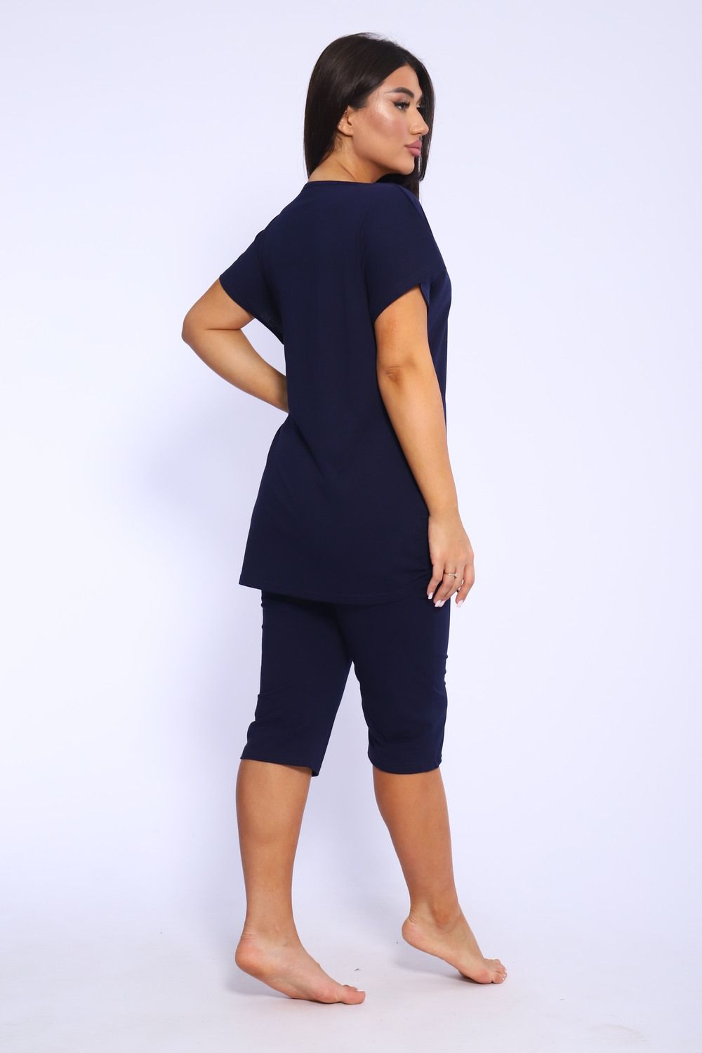 Представляем вашему вниманию женский домашний спортивный костюм, который идеально подходит для комфортного времяпрепровождения дома и на даче. Этот комплект включает в себя удобную футболку и стильные бриджи, которые глубоко заботятся о вашем комфорте. Изготовленный из мягкого и дышащего материала, он отлично подходит для расслабления и активного отдыха. Футболка обладает лаконичным дизайном, что добавляет универсальности, а бриджи прекрасно сочетаются с ней, создавая непринужденный ансамбль. Такой набор станет идеальным выбором в качестве домашней пижамы, позволяя вам чувствовать себя уютно и привлекательно.