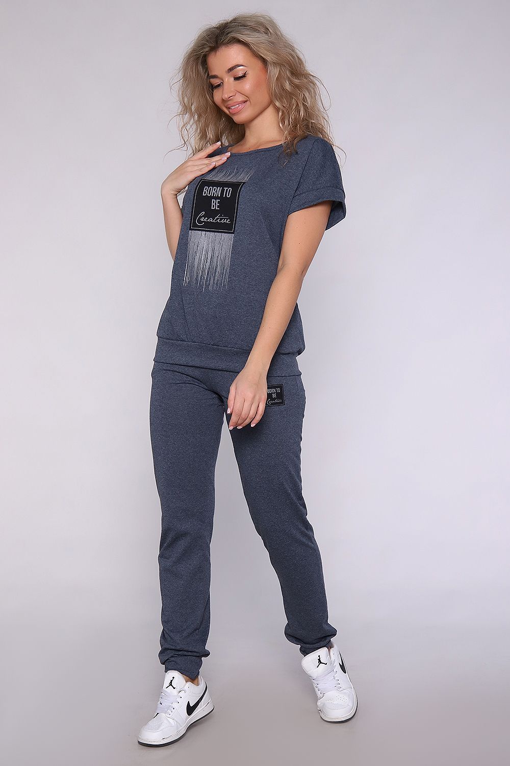 Костюм из меланжированной кулирки, смесового состава. Футболка на поясе , плечо спущено, брюки на манжетах и с карманами. Принт на футболке с блестящим глиттером.