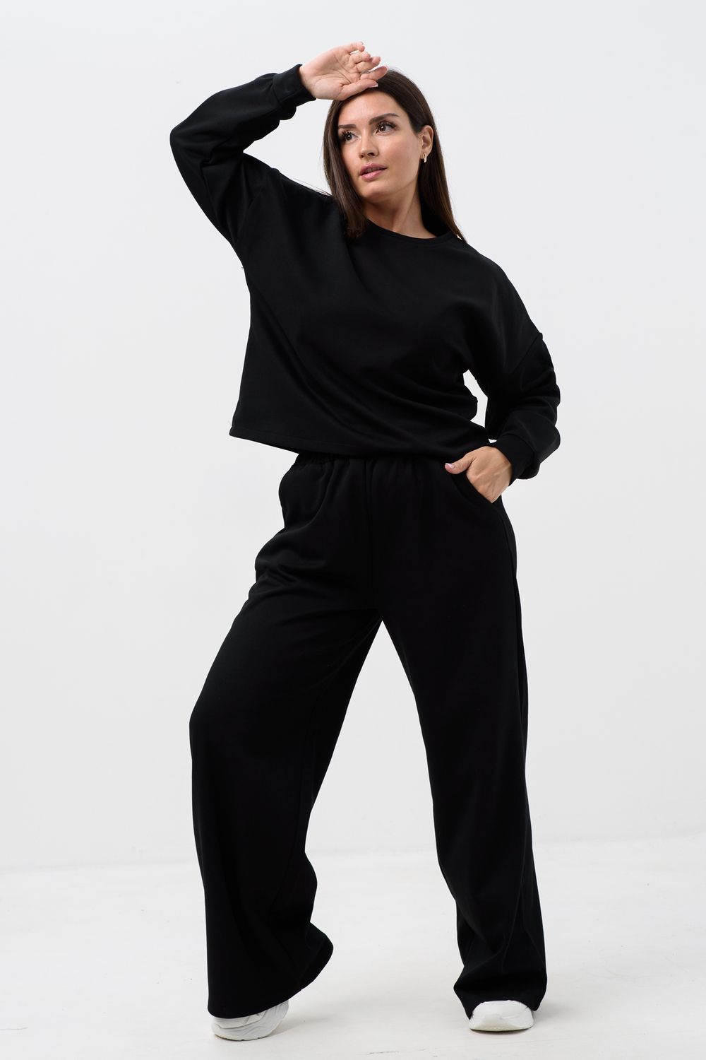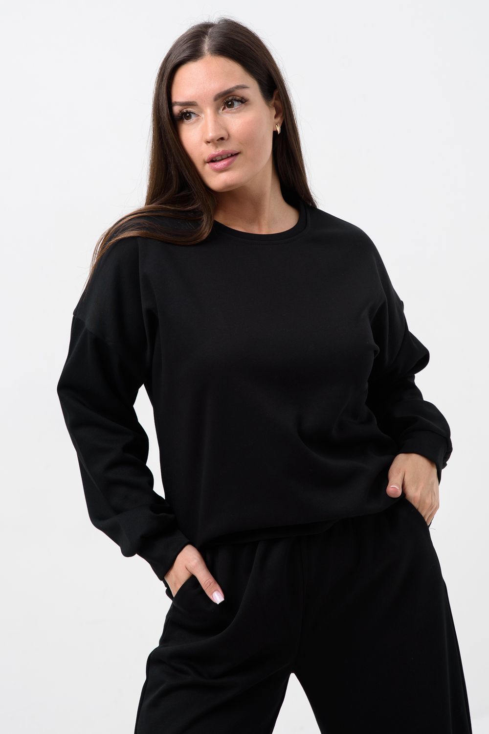 Костюм спортивный женский двойка штаны + кофта выполнен из плотной ткани без начеса. Брюки с карманами и поясом на резинке, у кофты округлый воротник и длинный рукав на манжете. Комплект прямого свободного силуэта, Идеального подходит для повседневной носки.