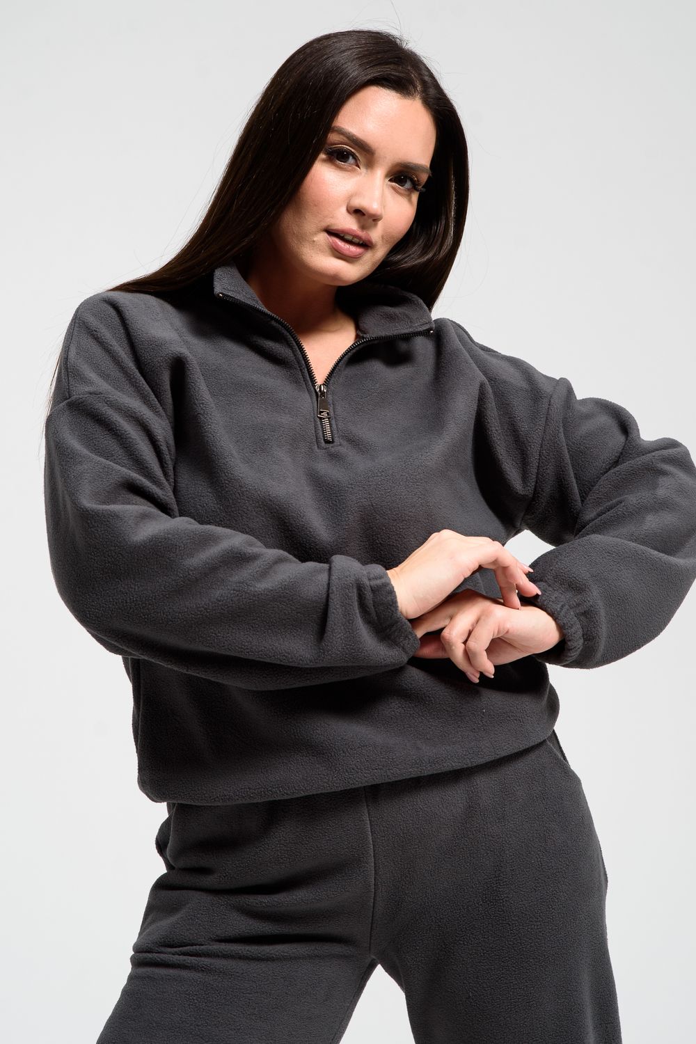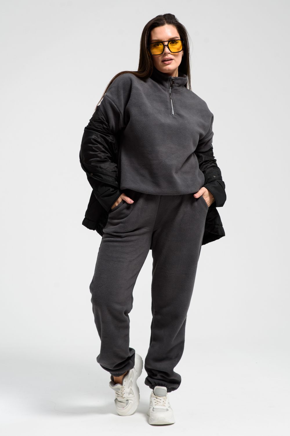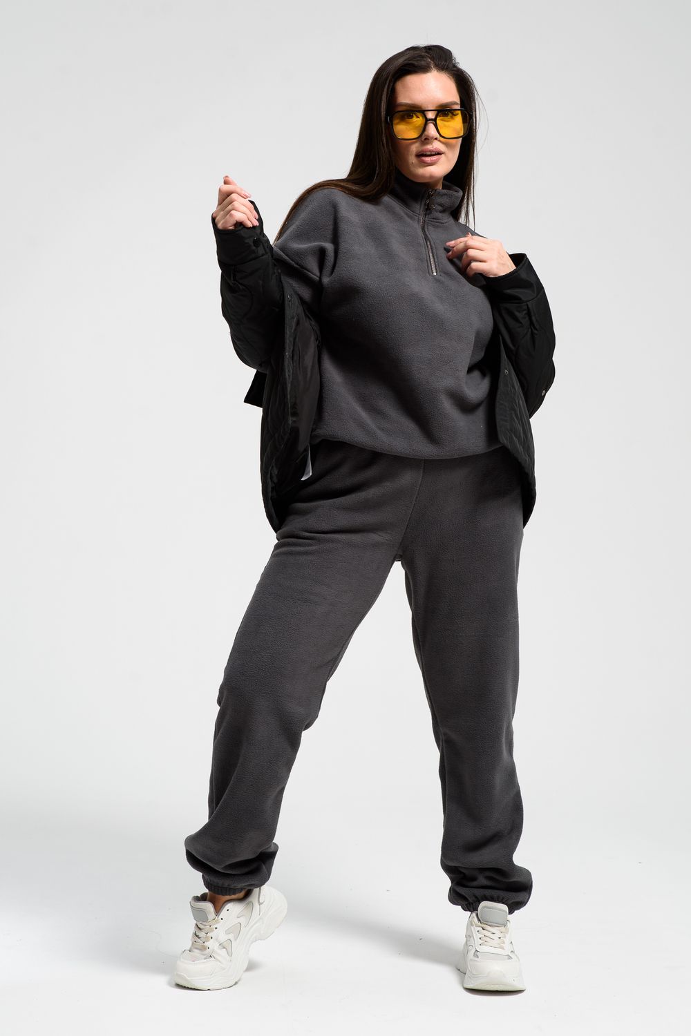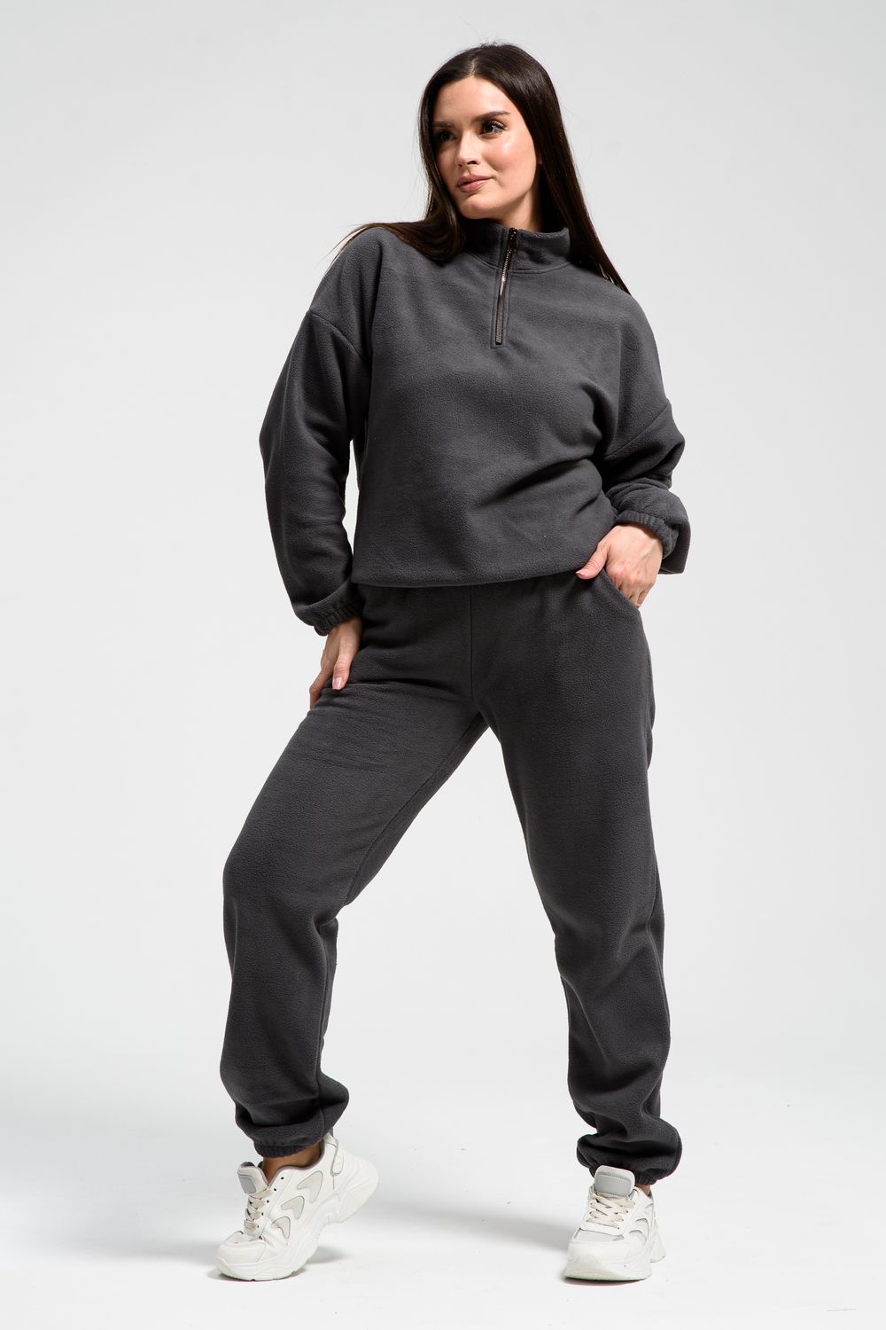 Женский спортивный костюм из теплой ткани - флис, прекрасный выбор на прохладную погоду, Верх - толстовка с горлом-стойкой и короткой молнией, понизу и на манжетах резинка, низ - брюки с карманами, пояс и низ штанов на резинке. Двойка подойдет для прогулок и дома.