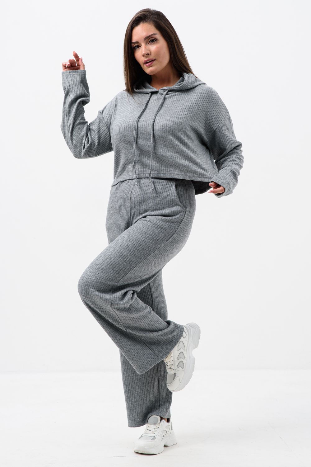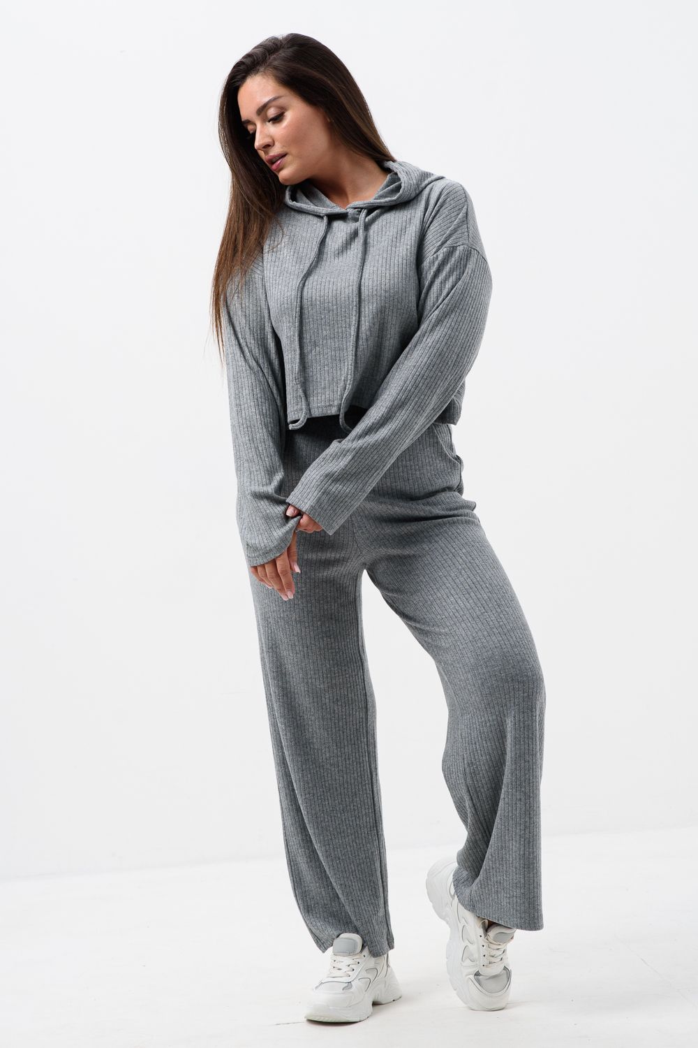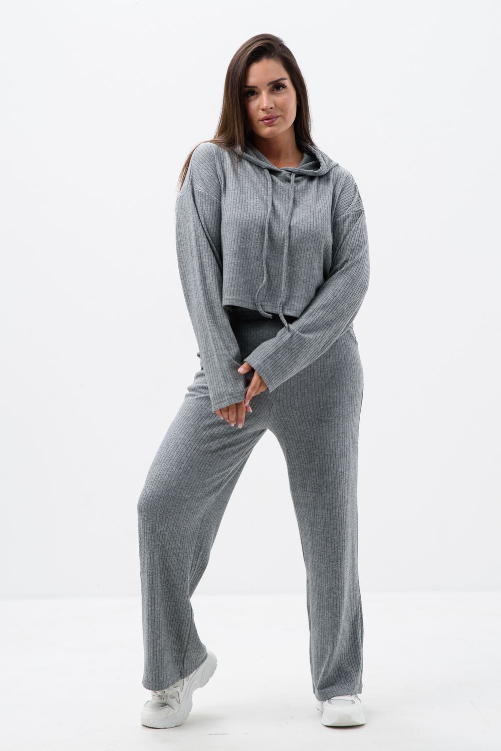 Женская двойка, изготовленная из приятной и плотной ткани - ангорка-лапша. Кофта костюма с капюшоном на шнурках, и длинным спущенным рукавом, свободные брюки палаццо с высокой посадкой и мягкой резинкой на поясе. Данная модель подойдет для прогулок и для дома, она достаточно уютная и комфортная, хороший выбор для вашего гардероба.