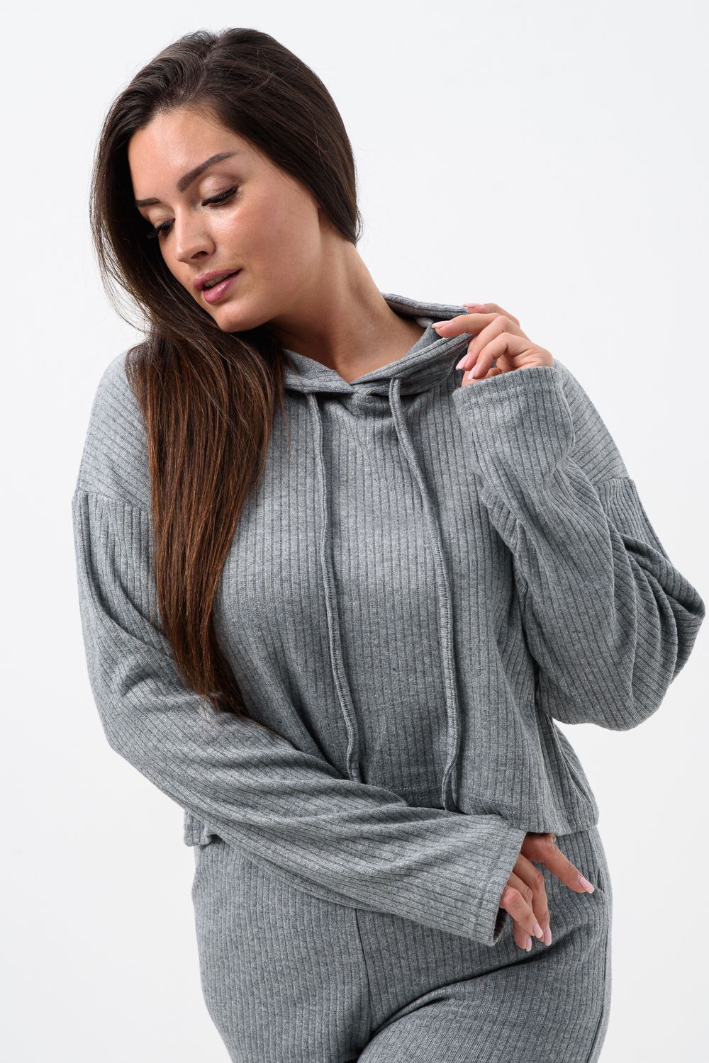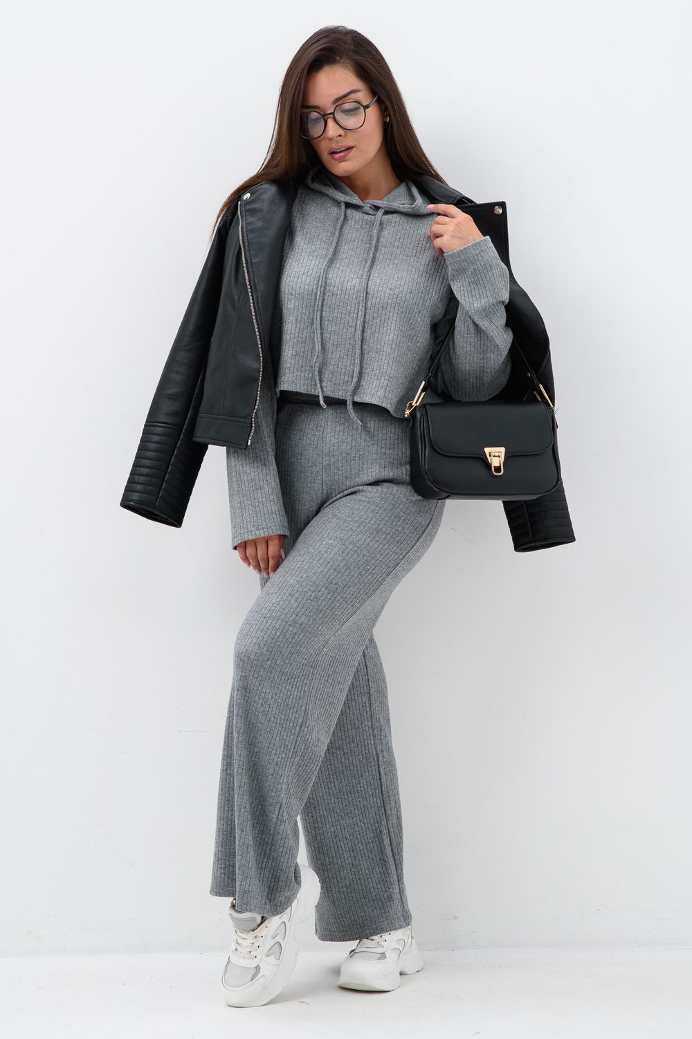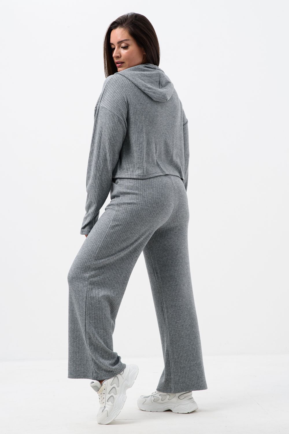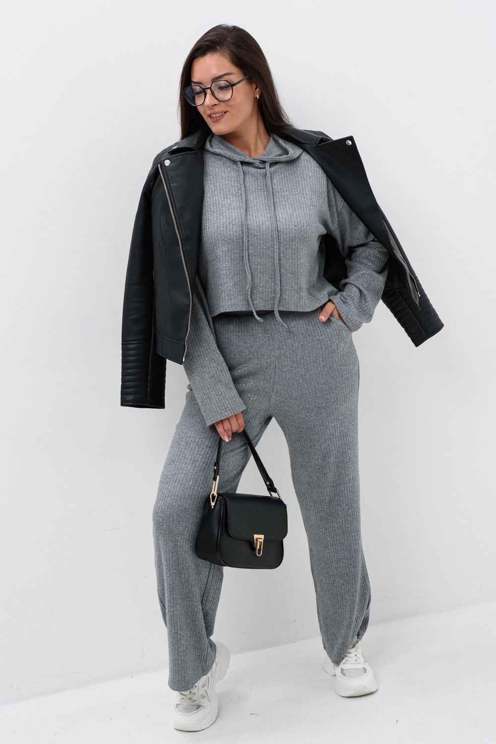 Женская двойка, изготовленная из приятной и плотной ткани - ангорка-лапша. Кофта костюма с капюшоном на шнурках, и длинным спущенным рукавом, свободные брюки палаццо с высокой посадкой и мягкой резинкой на поясе. Данная модель подойдет для прогулок и для дома, она достаточно уютная и комфортная, хороший выбор для вашего гардероба.