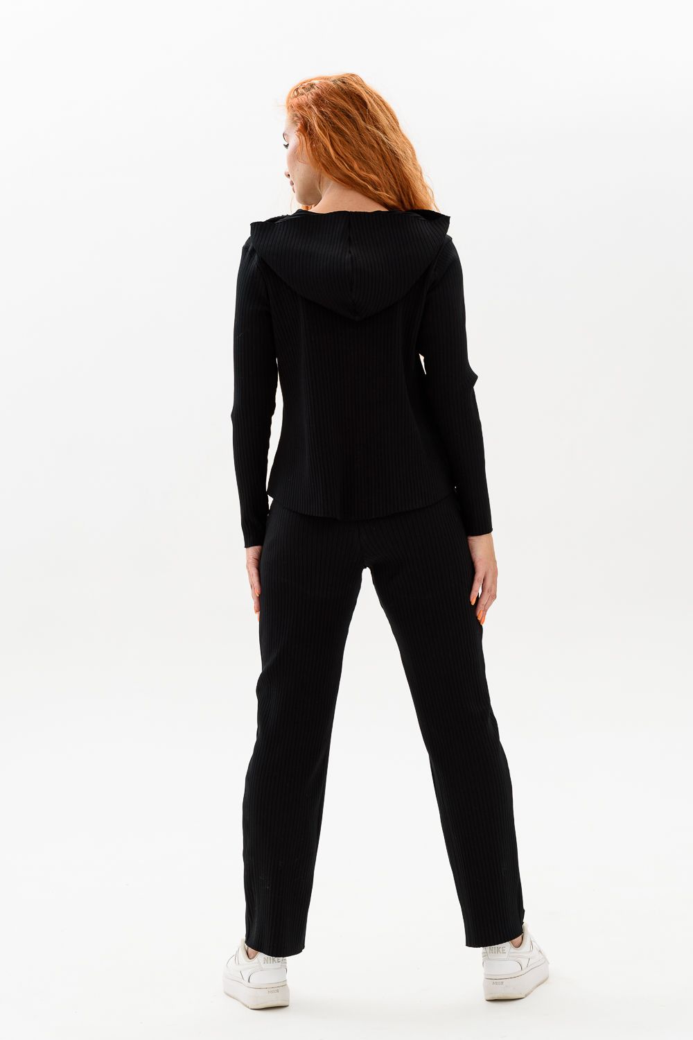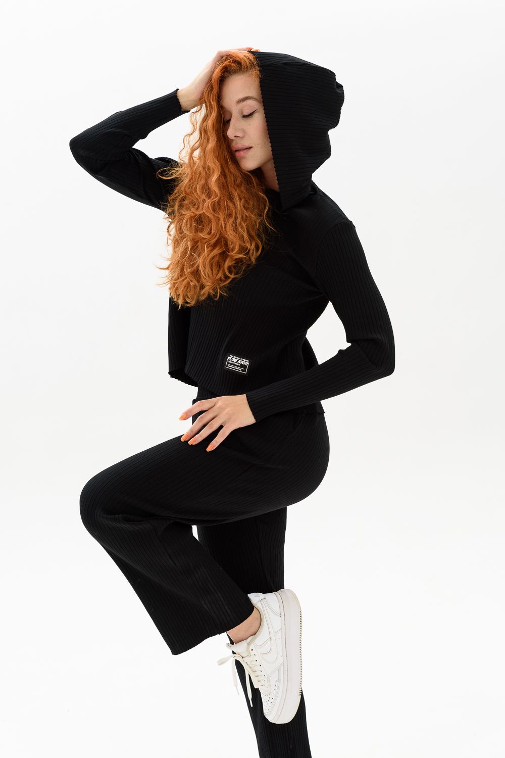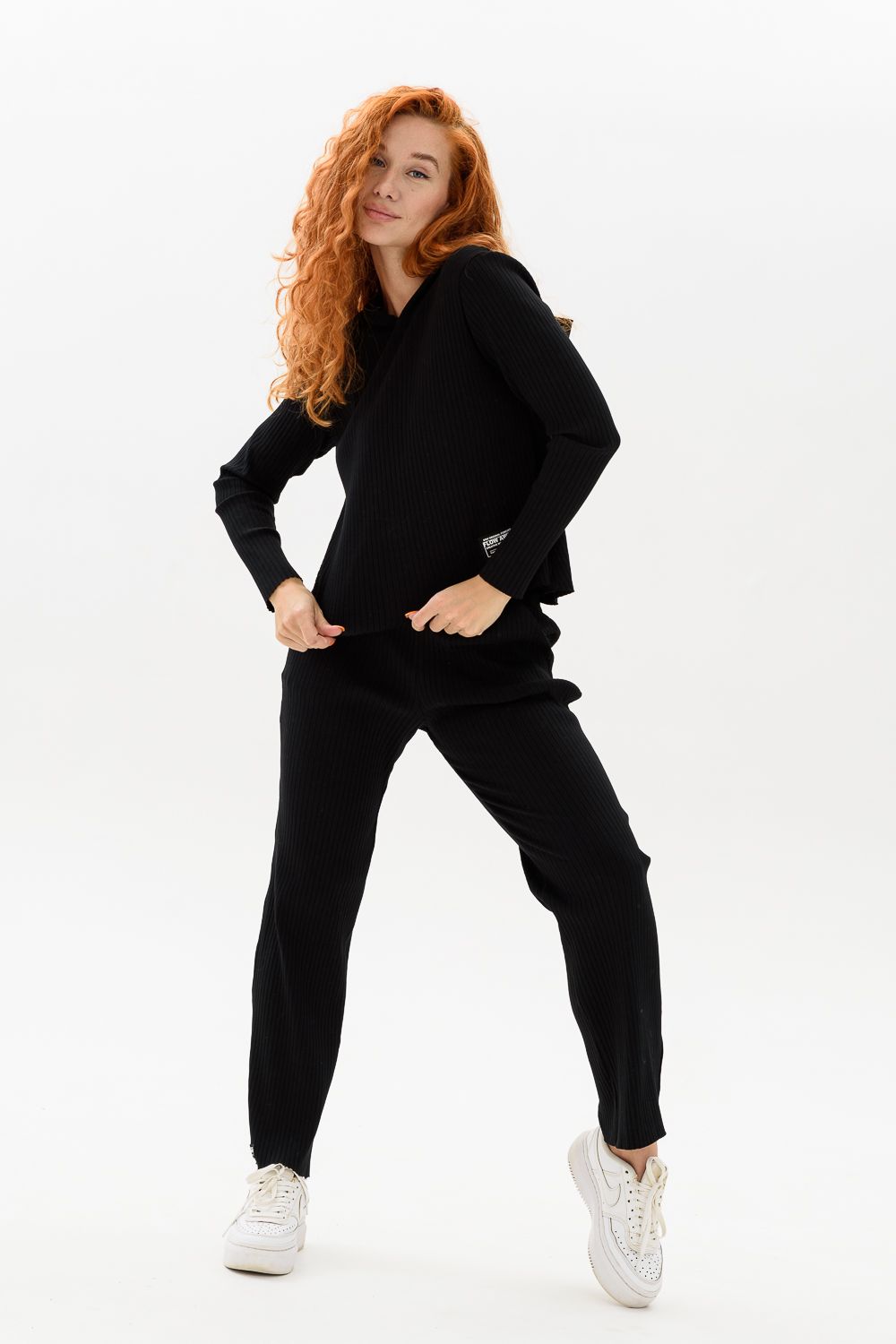 Спортивный женский костюм в рубчик оверсайз из нежной трикотажной ткани "лапша" не колется, не мнется и не вытягивается в коленях. Брючный костюм для женщин комфортный в носке и не прихотлив в уходе. В однотонный костюм лапша входит: широкие брюки палаццо с высокой посадкой, свободная однотонная кофта с длинным рукавом и капюшоном. Костюм идеально подходит для прогулок, путешествий, занятий спортом, встреч с друзьями, в качестве домашней одежды. Ткань обладает хорошей растяжимостью.