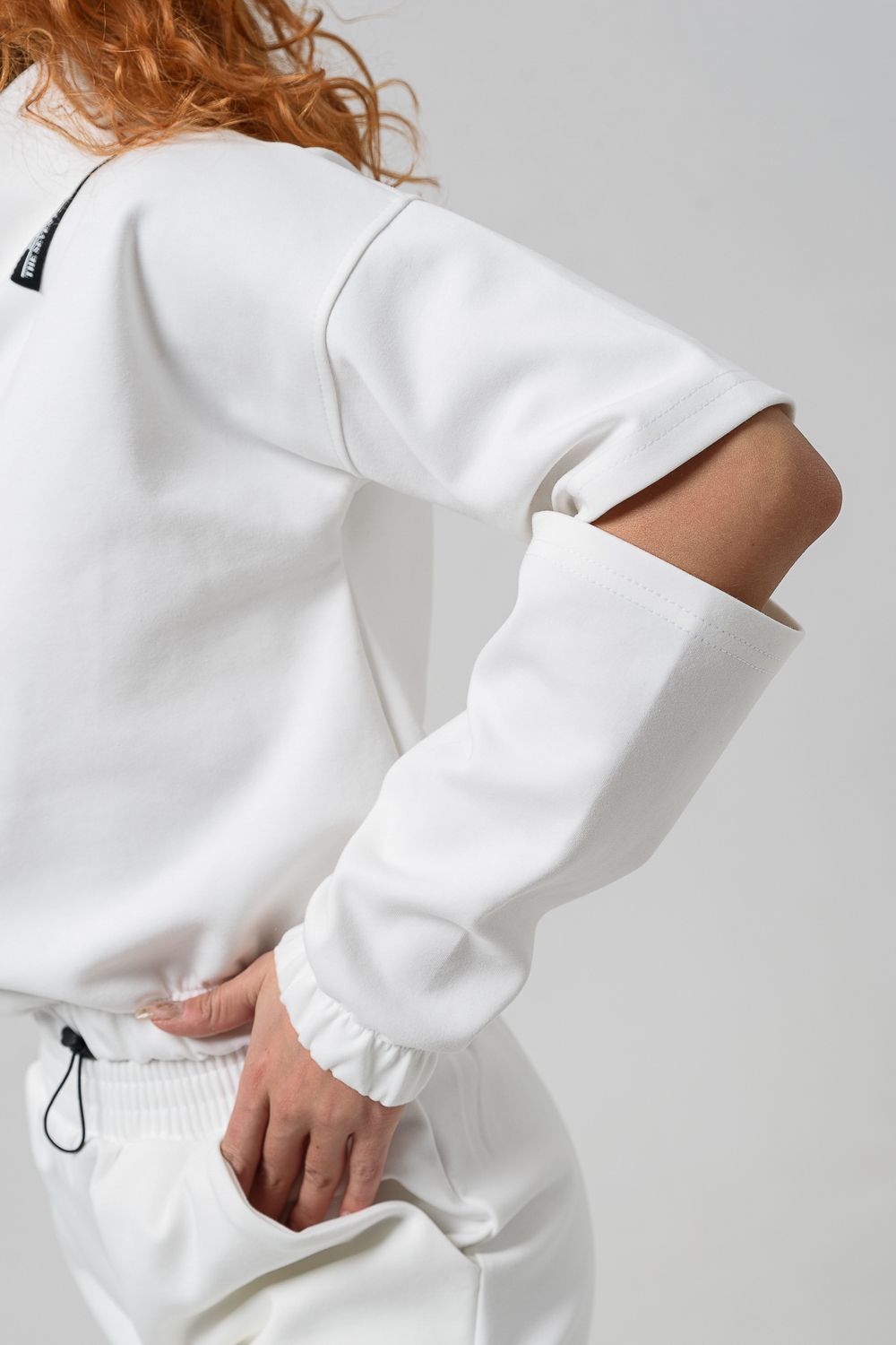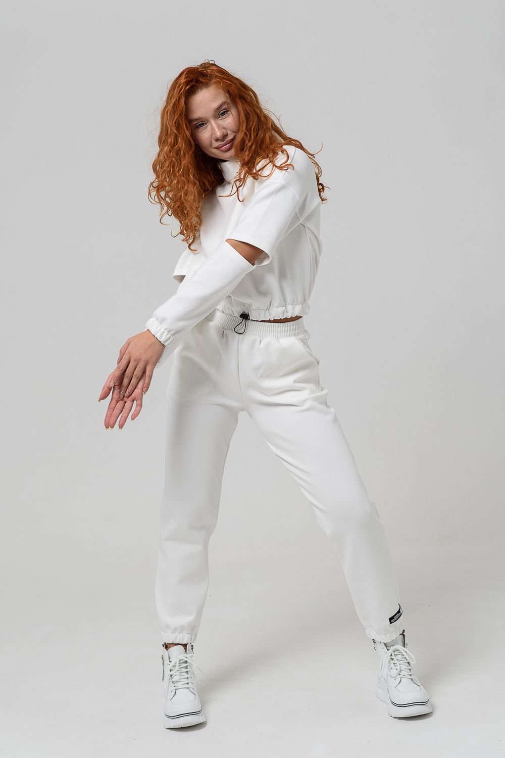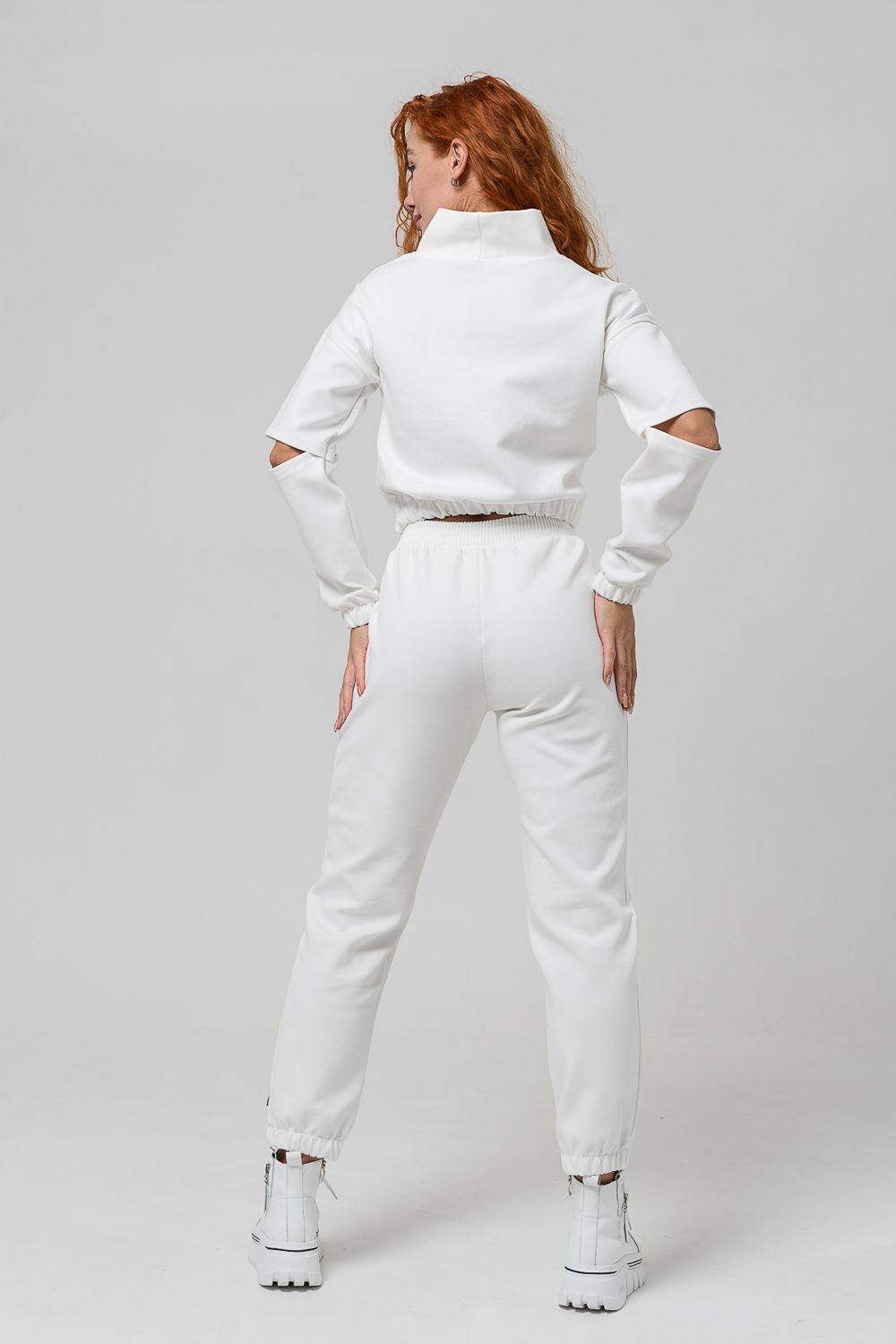Костюм состоит из укороченной толстовки и брюк. У толстовки воротник стойка, на рукавах в районе локтей разрезы, нашивка между шеей и плечом. Низ толстовки стянут на кулиску с фиксатором. На брюках два косых кармана, низ и верх выполнены резинкой.