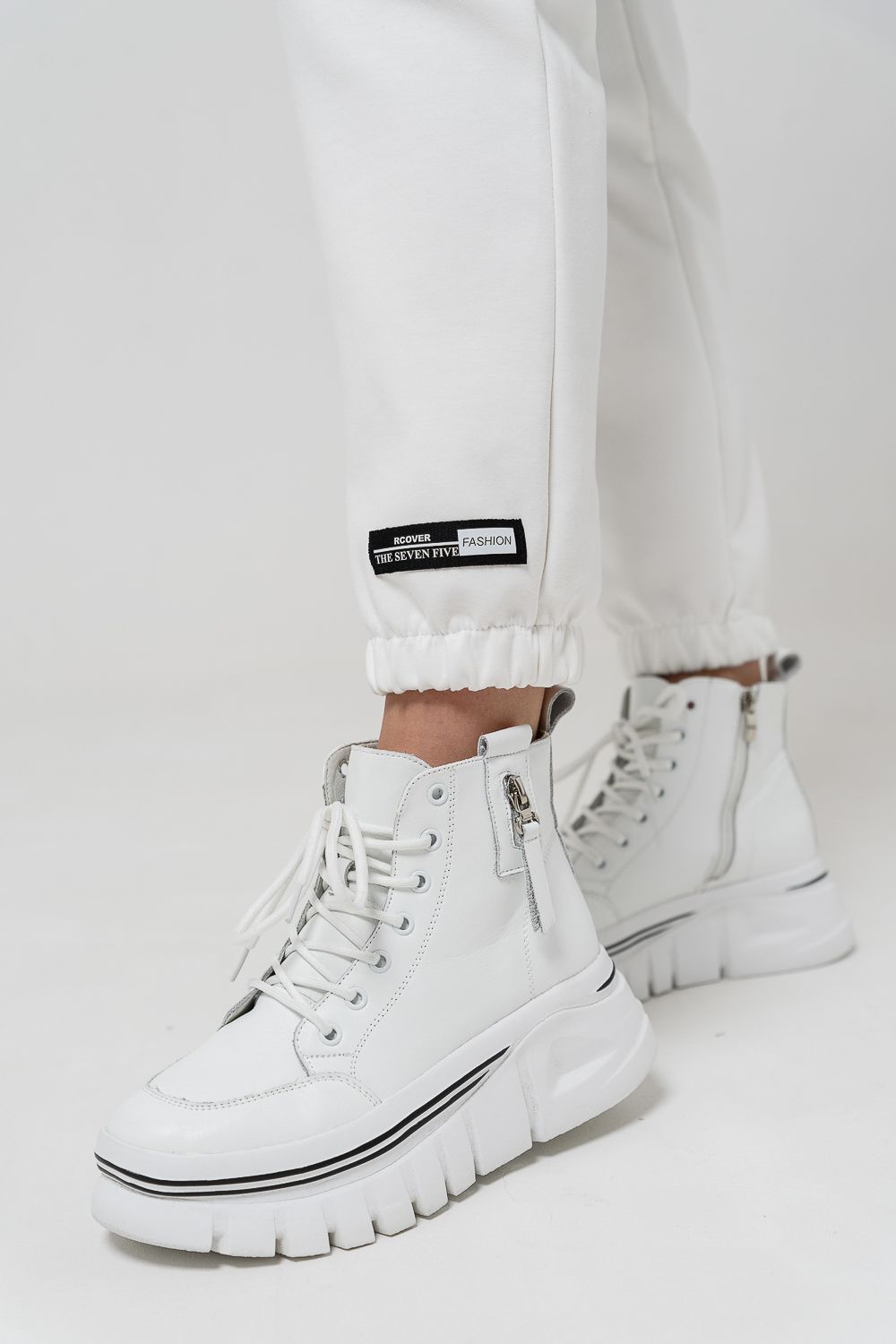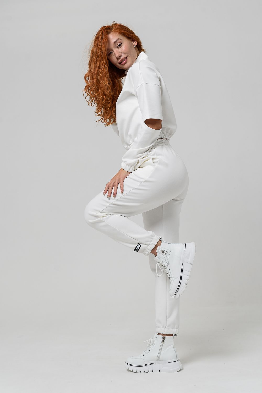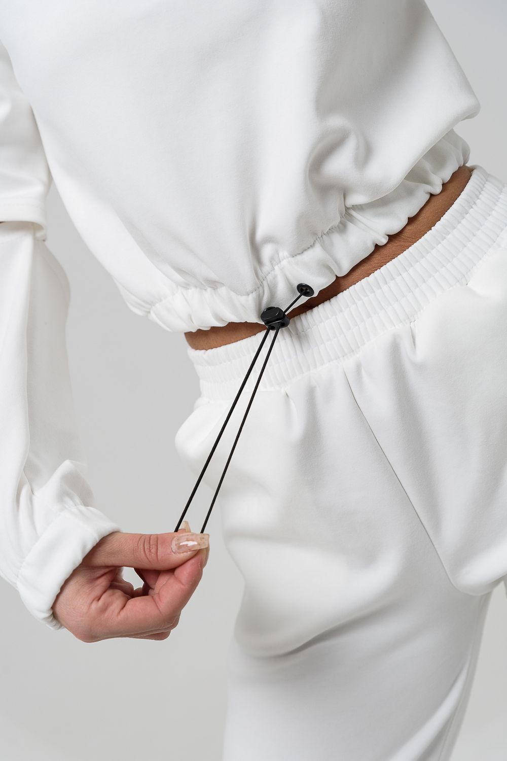 Костюм состоит из укороченной толстовки и брюк. У толстовки воротник стойка, на рукавах в районе локтей разрезы, нашивка между шеей и плечом. Низ толстовки стянут на кулиску с фиксатором. На брюках два косых кармана, низ и верх выполнены резинкой.