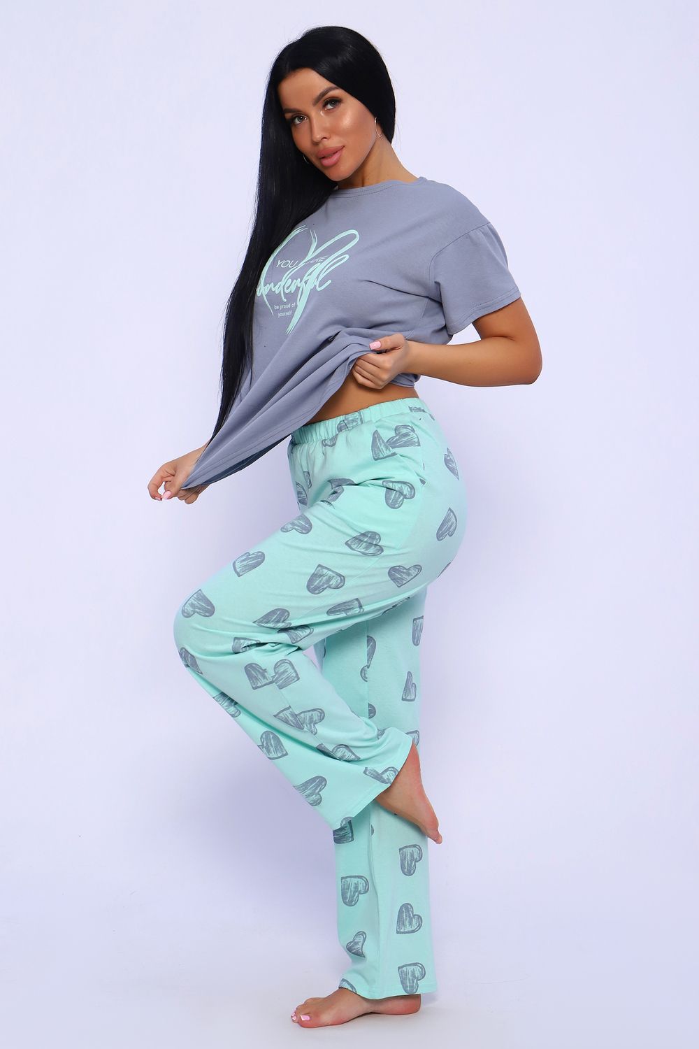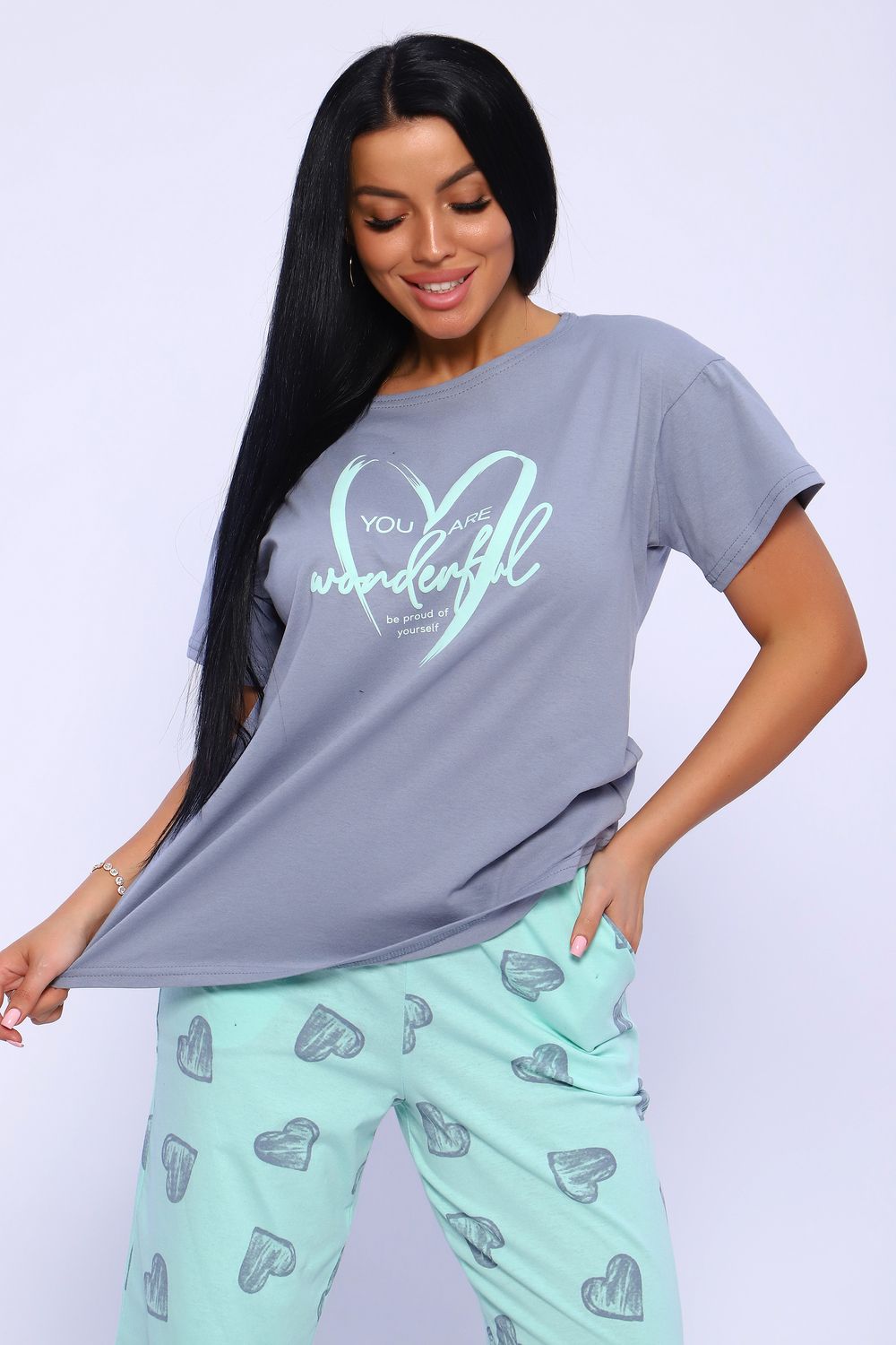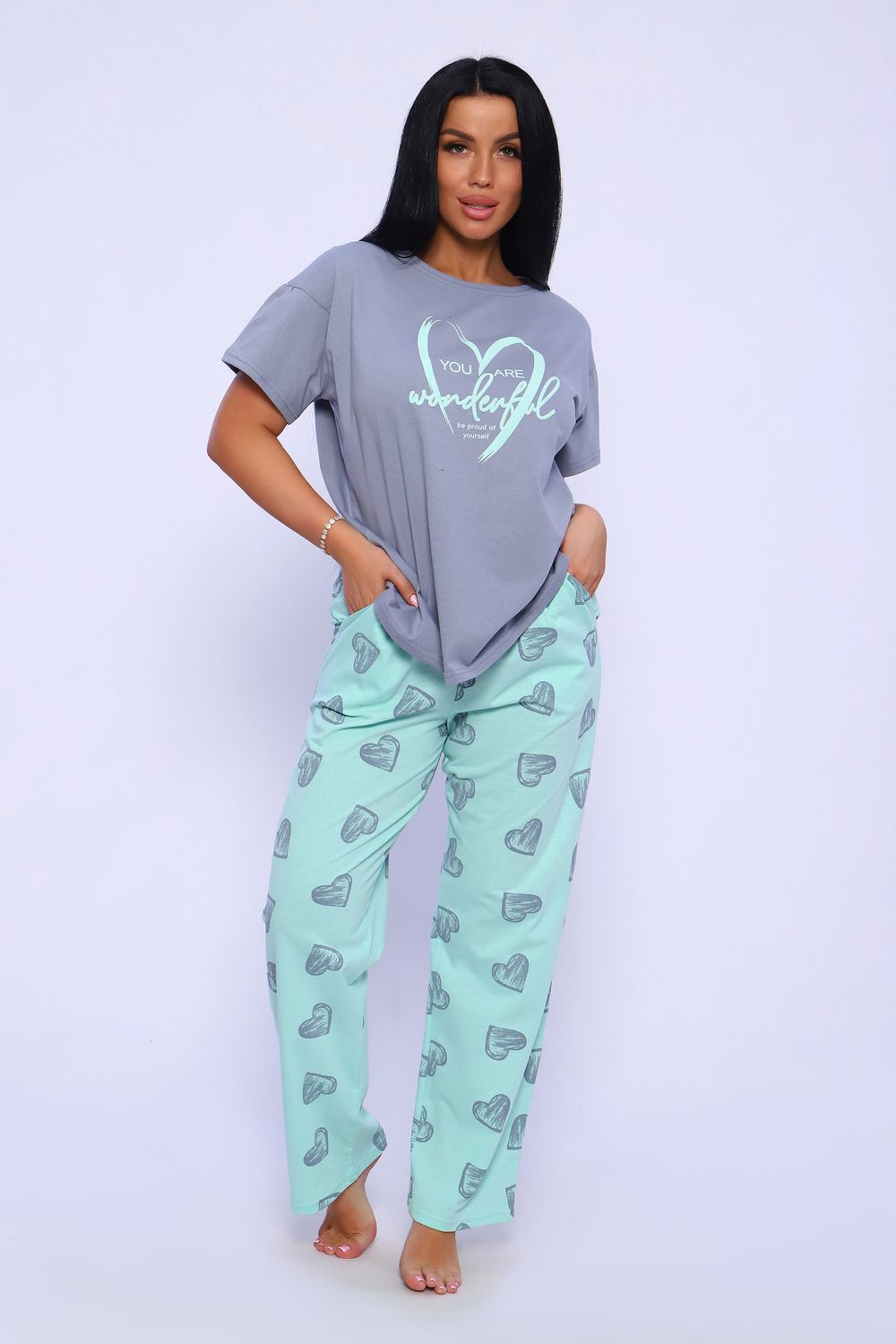 Костюм женский с оригинальным принтом в виде сердечек, из кулирки. Комплект состоит из футболки прямого кроя с рельефным пафф-принтом и прямых брюк на резинке с боковыми карманами. Футболка со спущенной фигурной проймой и свободным, слегка присборенным коротким рукавом. Домашний костюм из дышащего хлопкового трикотажа, комфортный, удобный, необходимая вещь для дома, а так же для сна.
