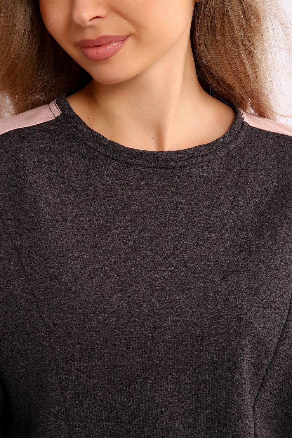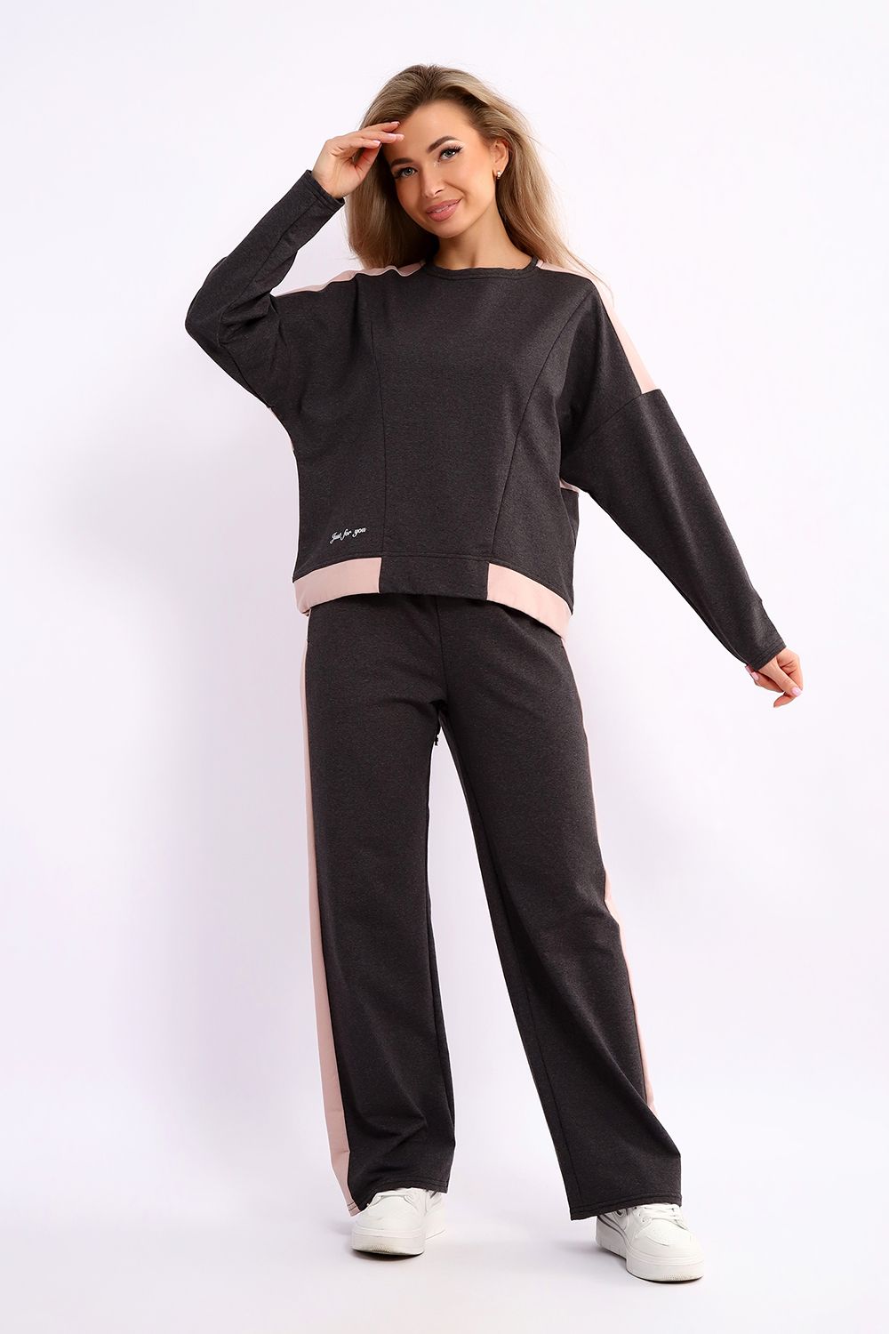 Костюм женский из мягкого, тонкого комбинированного футера . Свитшот с рельефами, в свободном стиле Oversize. Круглая горловина обработана обтачкой, спущенная пройма, длинный рукав, с надписью на передней полочке. На спинке кокетка, низ на широком манжете с декоративным шнуром. Брюки- трубы с лампасами и удобными карманами в боковых швах. Стильный, комфортный костюм идеальный вариант для повседневного гардероба.