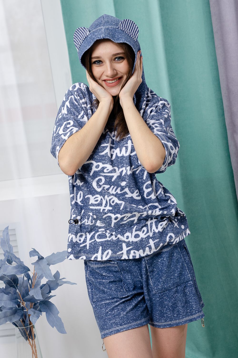 Костюм состоит из туники и шорт. Туника прямая, свободная, с резинкой по талии, с ушками на капюшоне, с разрезами в нижней части боковых швов. Рукав короткий. Шорты прямые, на поясе, с накладными карманами спереди. Вдоль боковых швов расположены молнии.