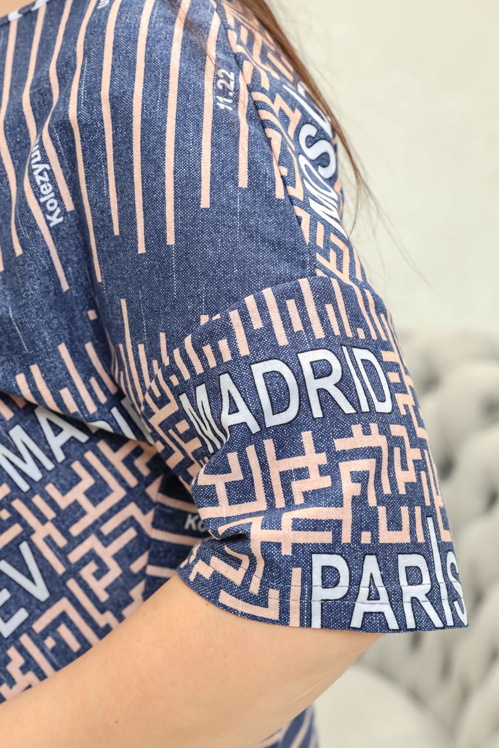 Костюм состоит из туники и брюк. Туника прямого силуэта, с округлой горловиной, длиной до середины бедра. Спинка с кокеткой, удлиненная. В нижней части боковых швов обработаны разрезы. Рукав короткий. Горловина обработана бейкой из основного полотна. Брюки на поясе, с боковыми карманами, с лампасами.