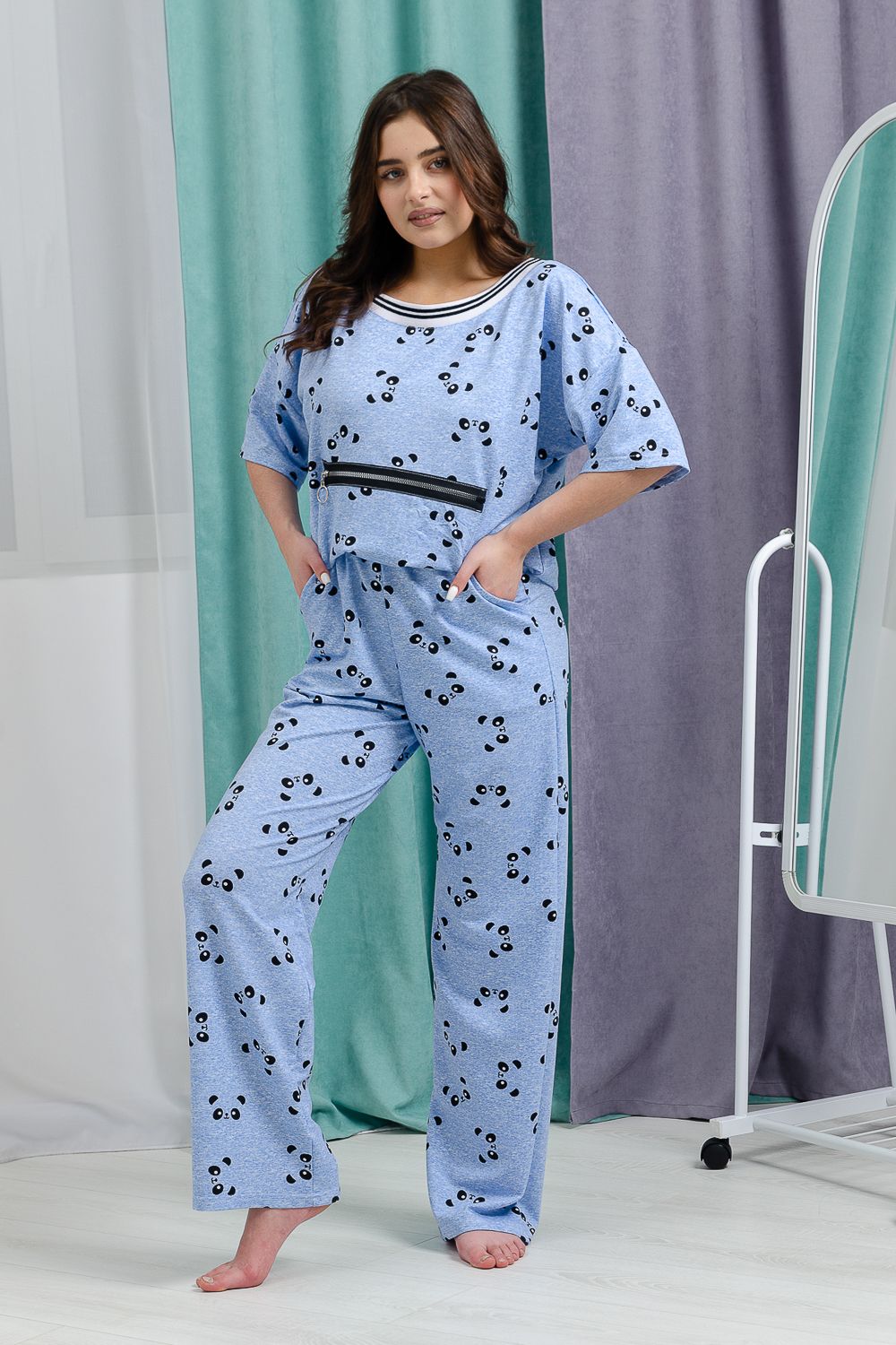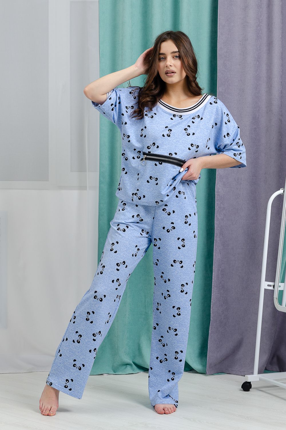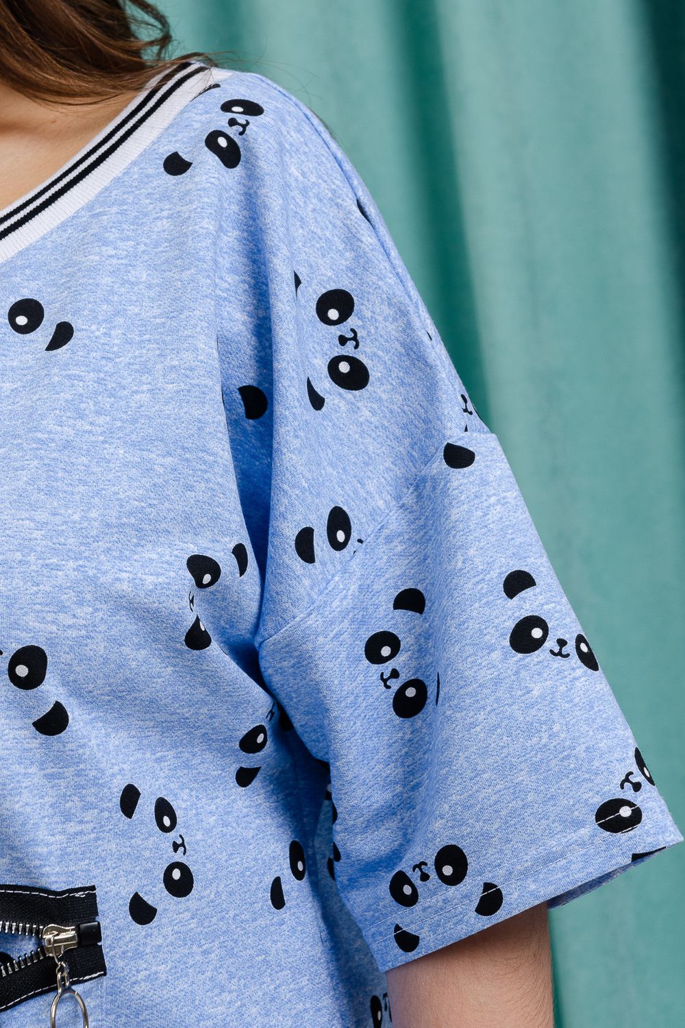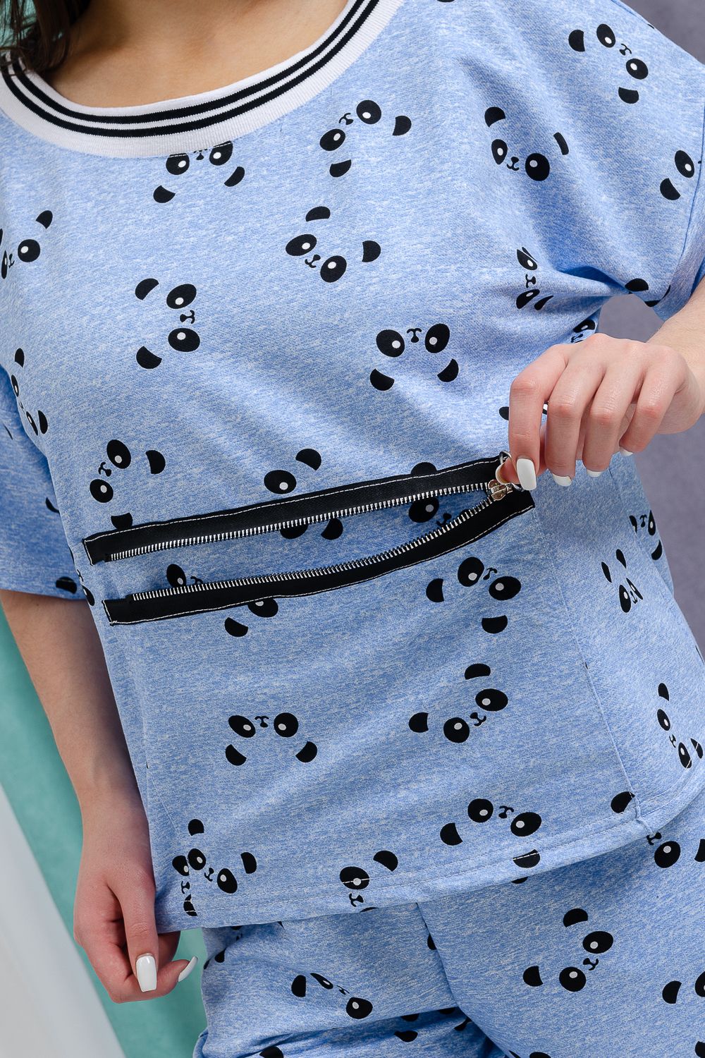 Костюм состоит из туники и брюк. Туника с округлой горловиной, обработанной отделочной рибаной. На полочке расположен декоративный карман с молнией. Рукав короткий. Горловина спинки обработана бейкой из основного полотна. Брюки прямые, на поясе, с боковыми карманами.
