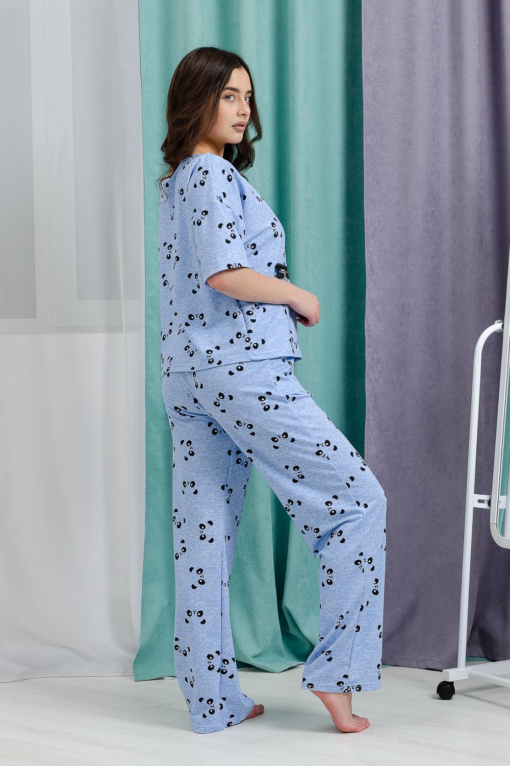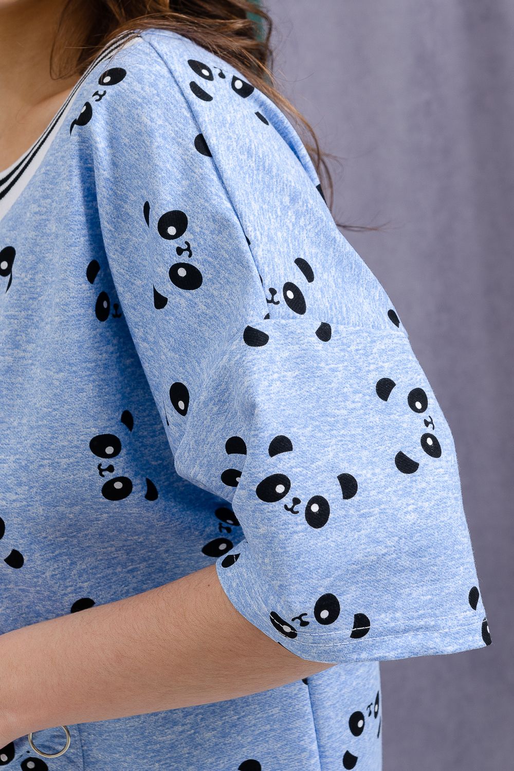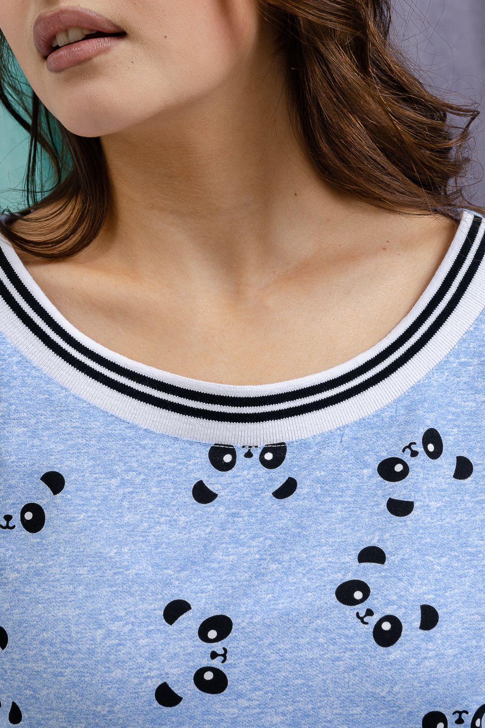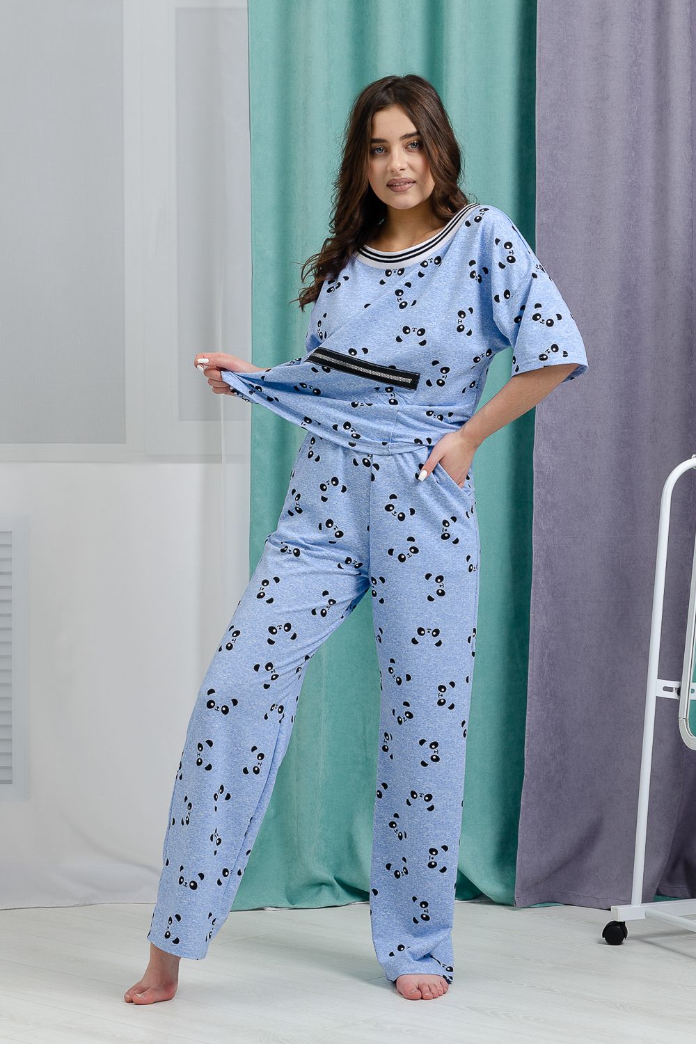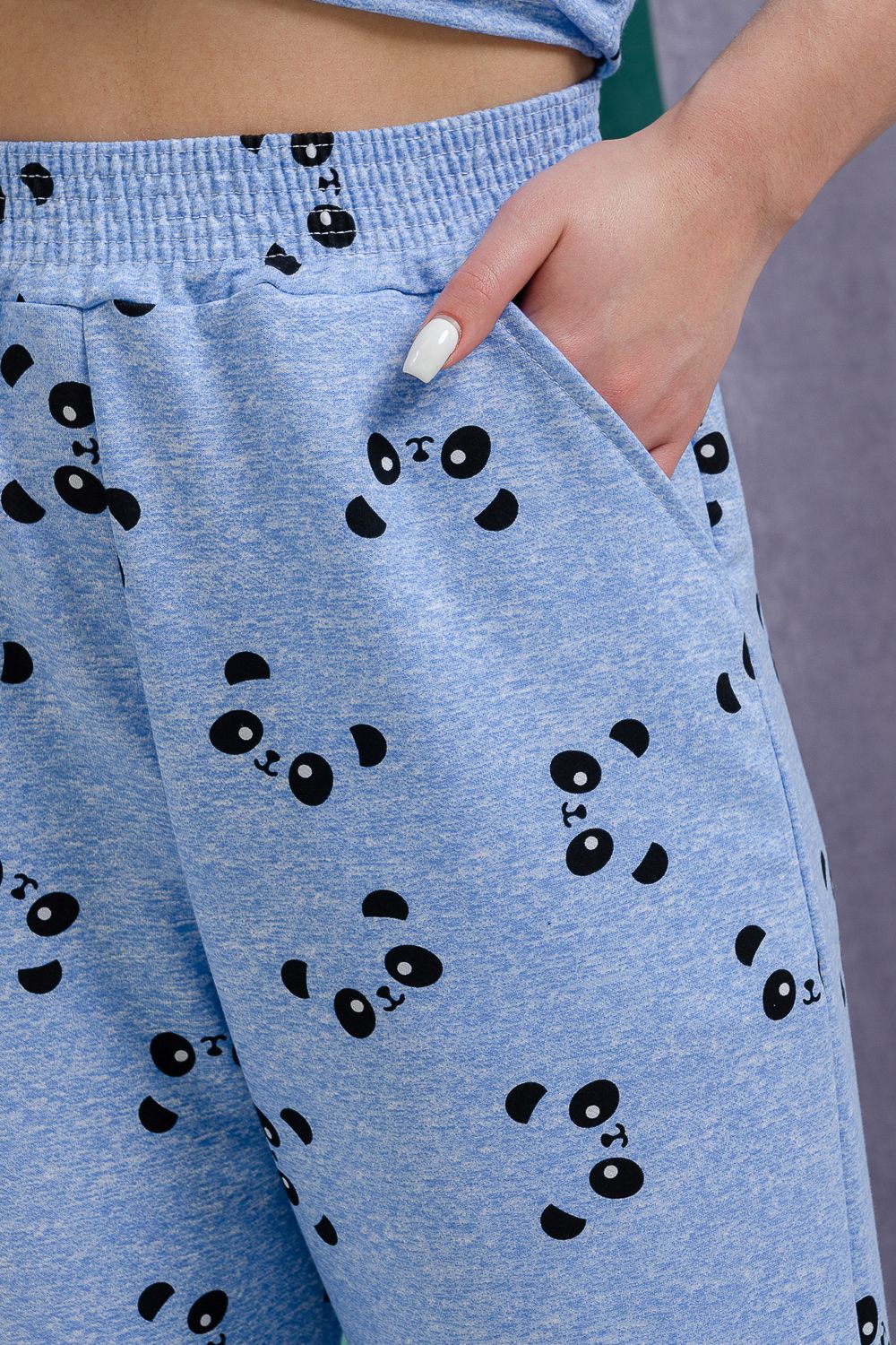 Костюм состоит из туники и брюк. Туника с округлой горловиной, обработанной отделочной рибаной. На полочке расположен декоративный карман с молнией. Рукав короткий. Горловина спинки обработана бейкой из основного полотна. Брюки прямые, на поясе, с боковыми карманами.