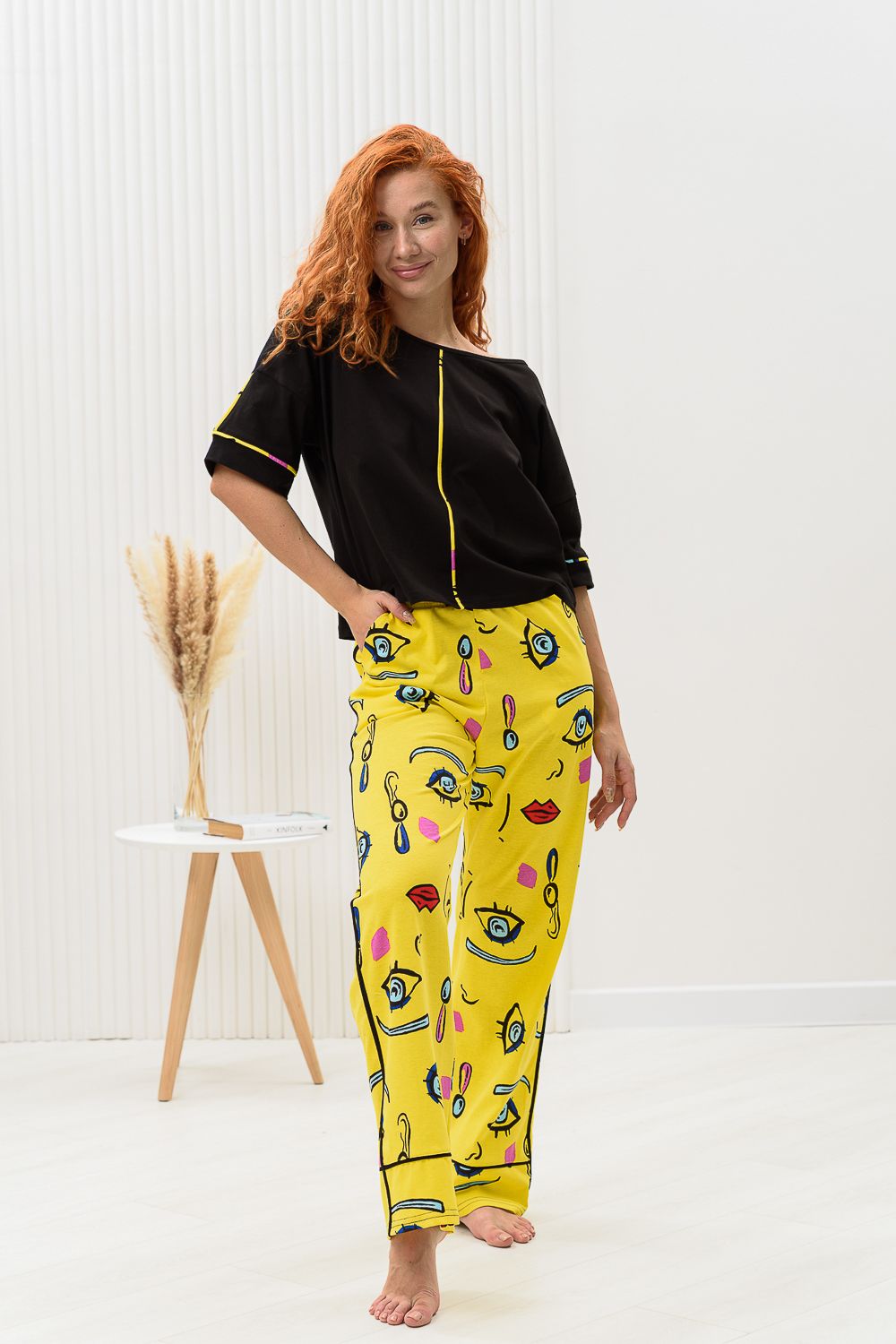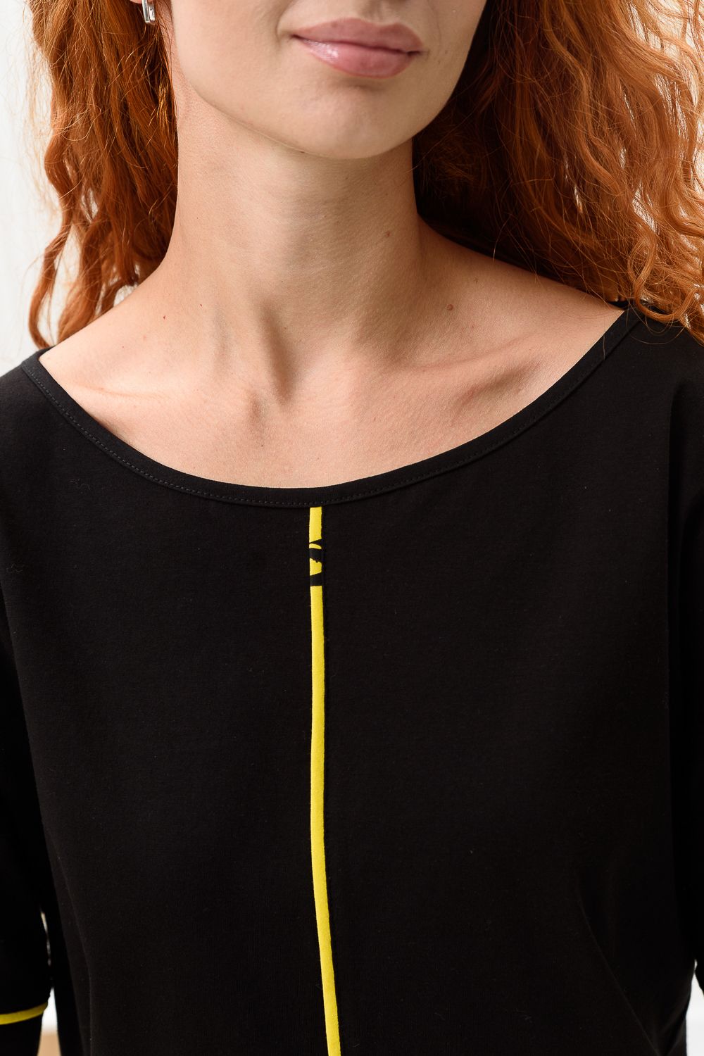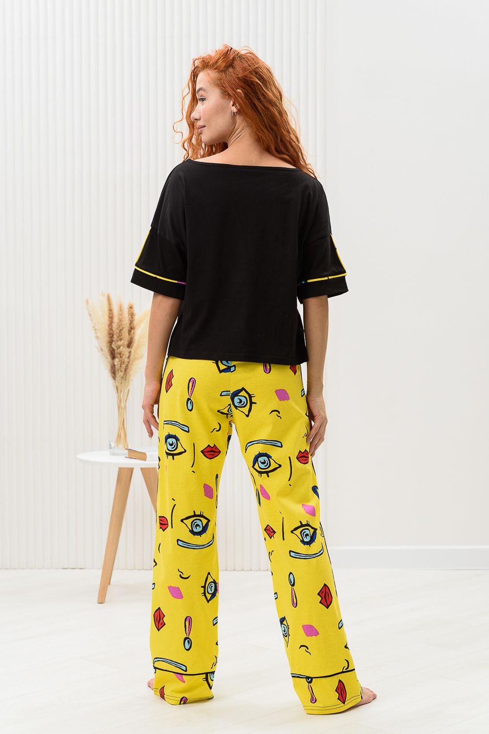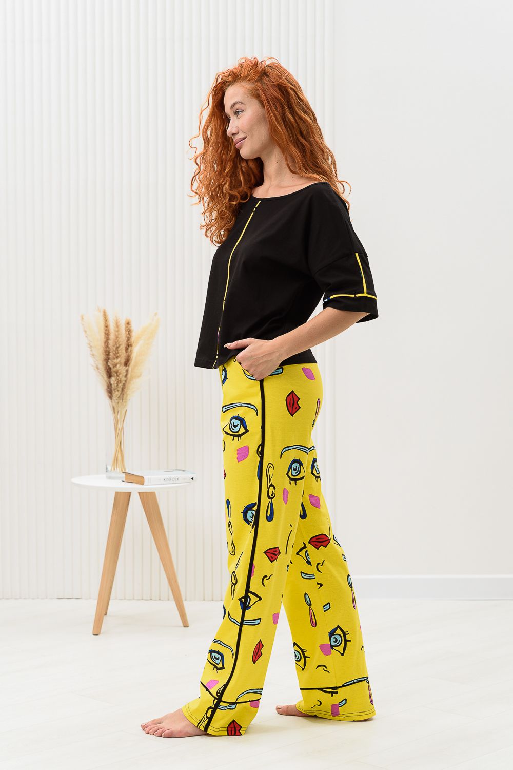 Костюм состоит из туники и брюк. Туника с округлой горловиной, свободная. Рукав короткий, с манжетом. Горловина обработана бейкой из основного полотна. Брюки прямые, на поясе, с боковыми карманами, с отделочным лампасом вдоль боковых швов.