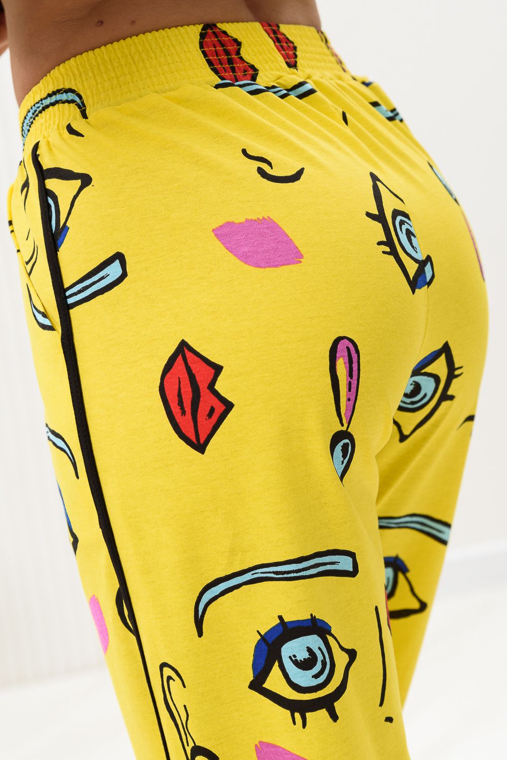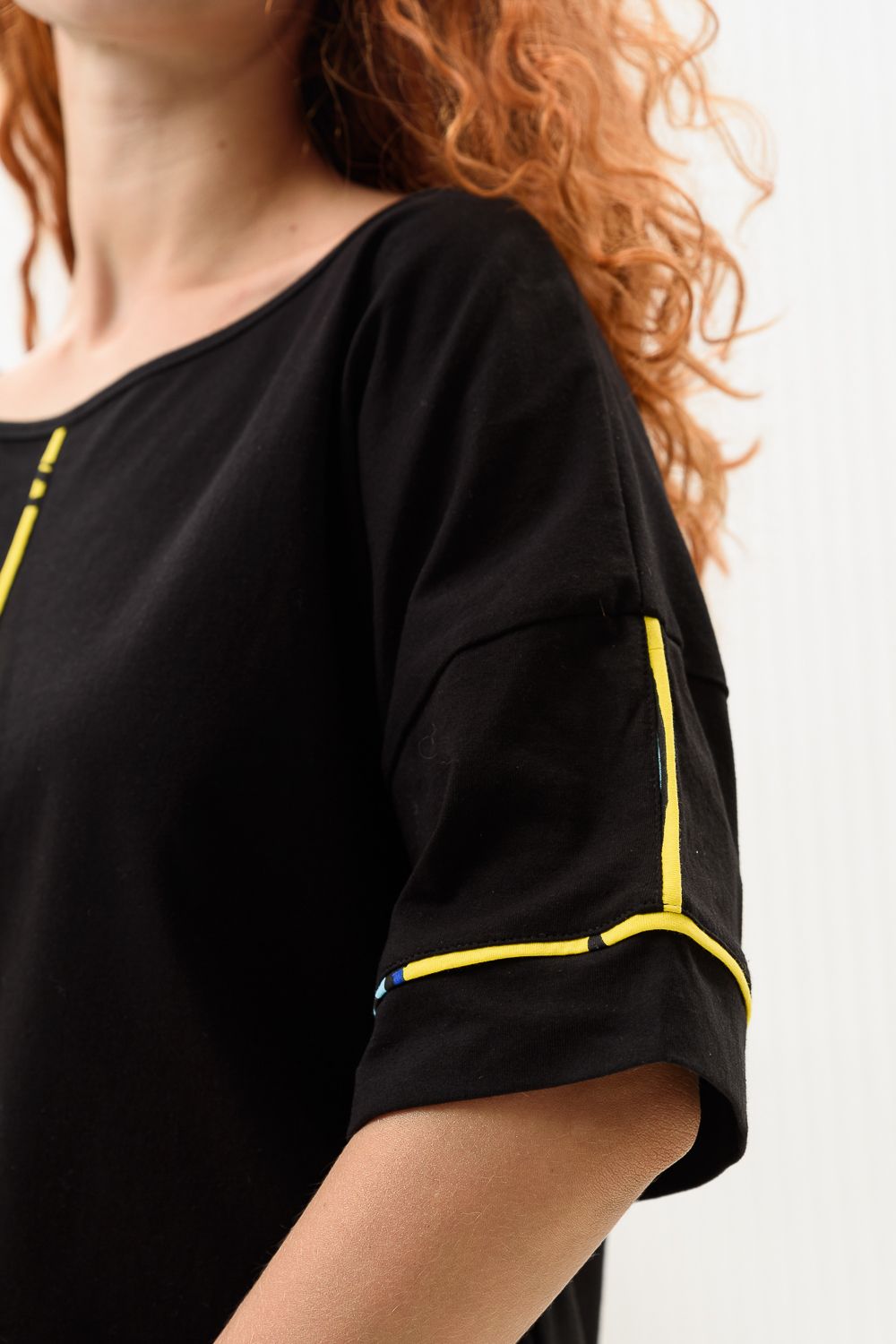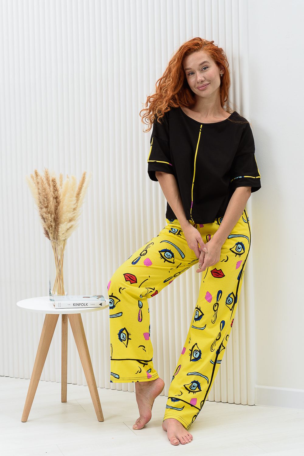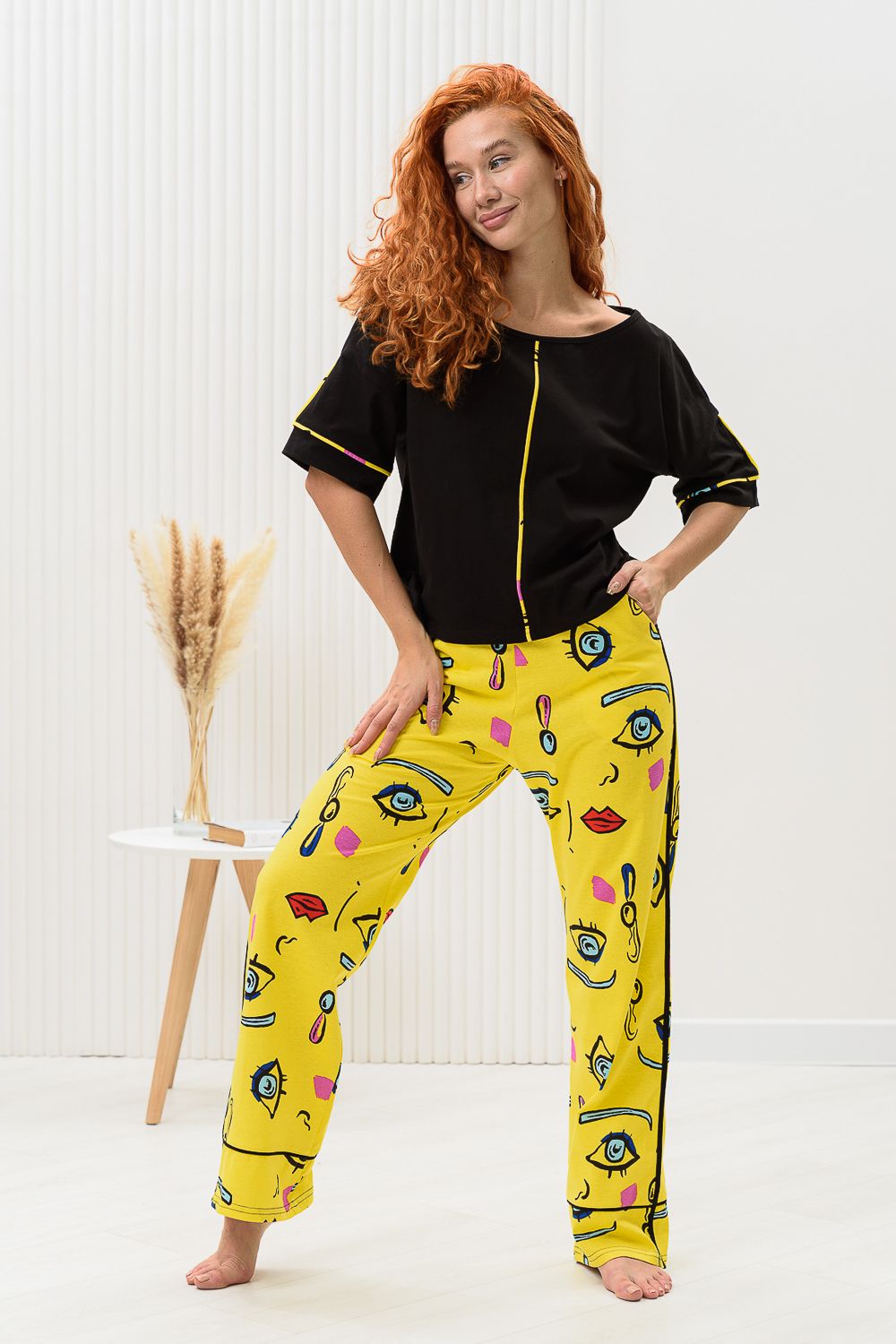Костюм состоит из туники и брюк. Туника с округлой горловиной, свободная. Рукав короткий, с манжетом. Горловина обработана бейкой из основного полотна. Брюки прямые, на поясе, с боковыми карманами, с отделочным лампасом вдоль боковых швов.