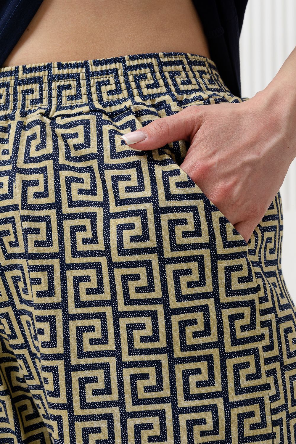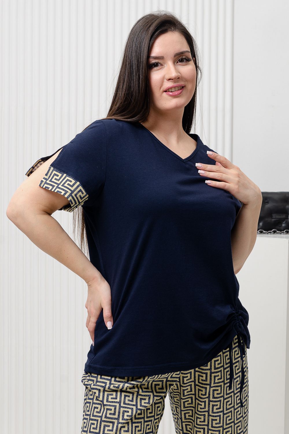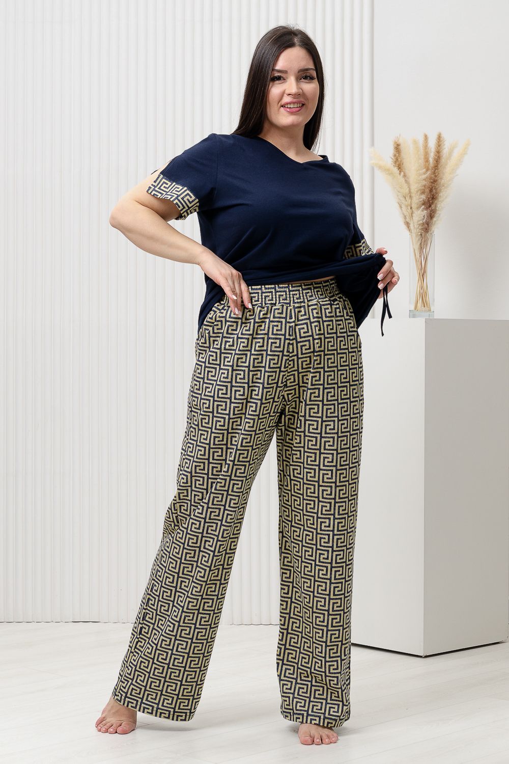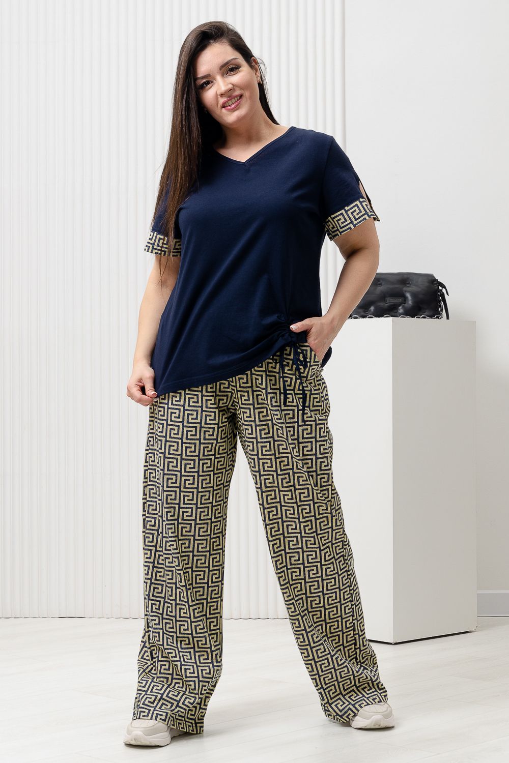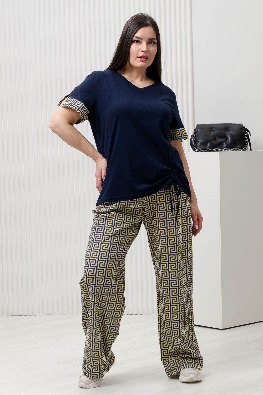 Костюм состоит из туники и брюк. Туника прямого силуэта, с V-образной горловиной. Рукав втачной, короткий, с разрезами и манжетом из отделочного полотна. В нижней части полочки обработана кулиса со шнуром. Горловина обработана бейкой из основного полотна. Брюки прямые, свободные, на поясе, с боковыми карманами.