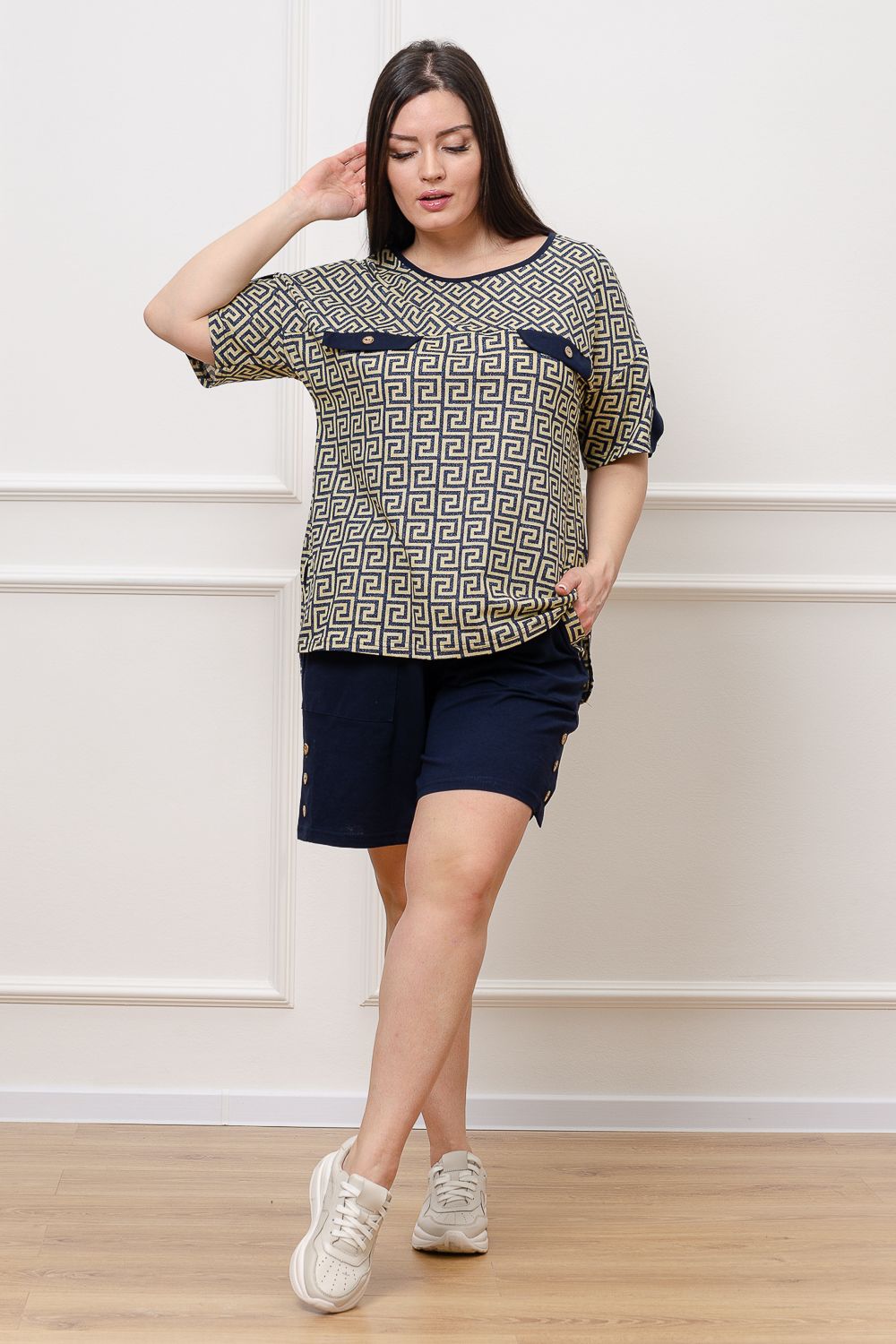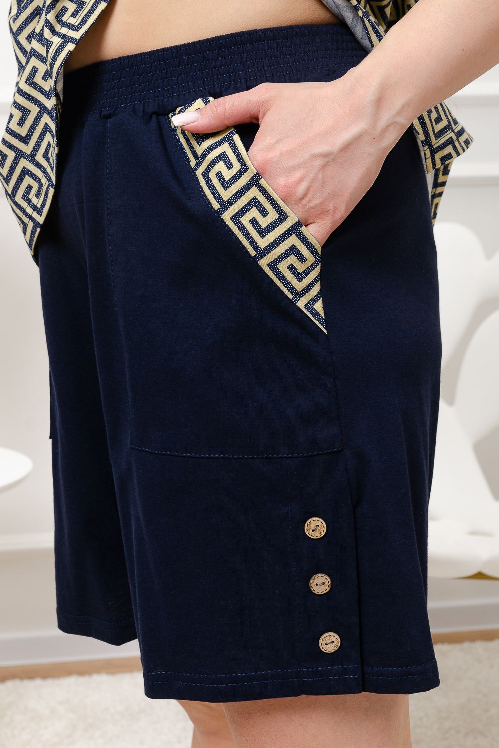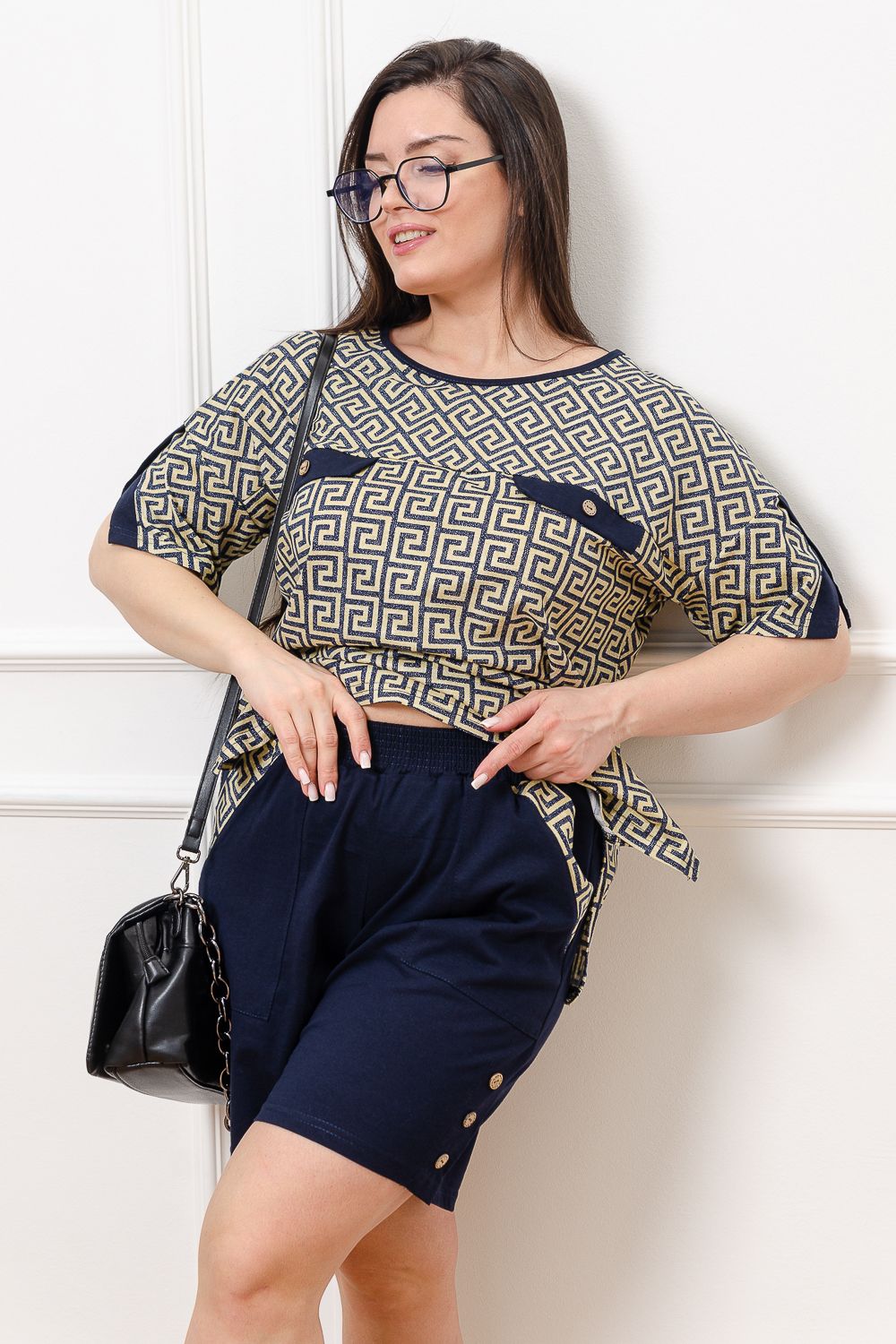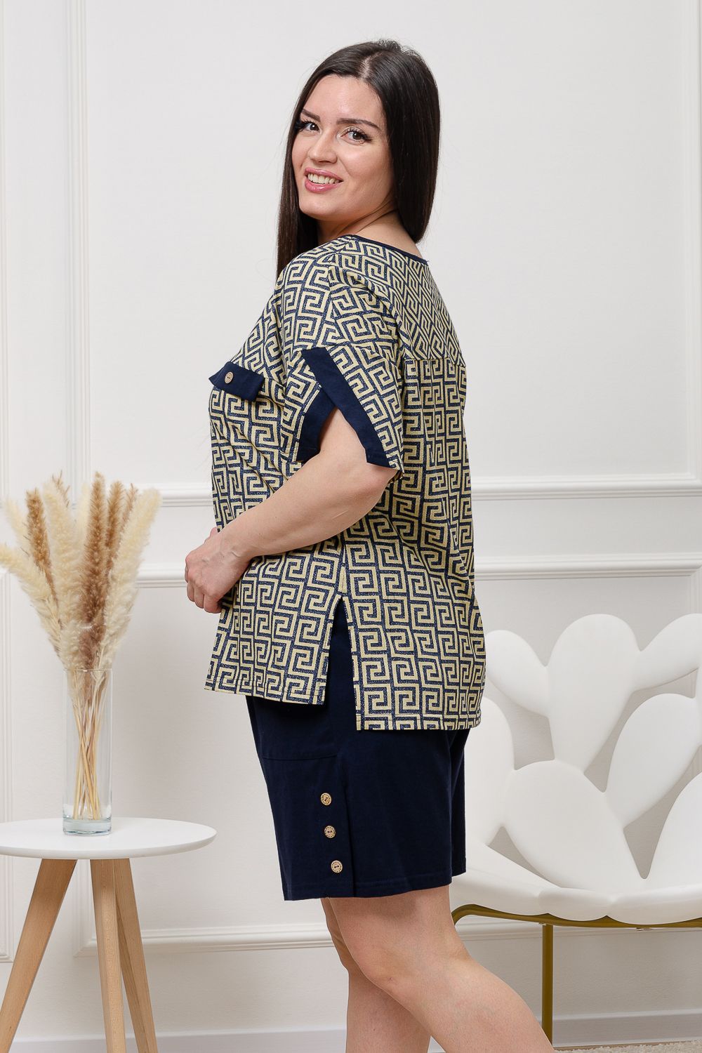 Костюм состоит из туники и шорт. Туника прямого силуэта, с округлой горловиной, длиной до середины бедра. Полочка с кокеткой и декоративными клапанами. Спинка с кокеткой, удлиненная. В нижней части боковых швов обработаны разрезы. Рукав короткий, с фигурными разрезами. Горловина обработана бейкой из отделочного полотна. Шорты "бермуды" прямые, свободные, на поясе, с боковыми накладными карманами. В нижней части боковых швов обработаны декоративные шлицы с отделочными пуговицами.