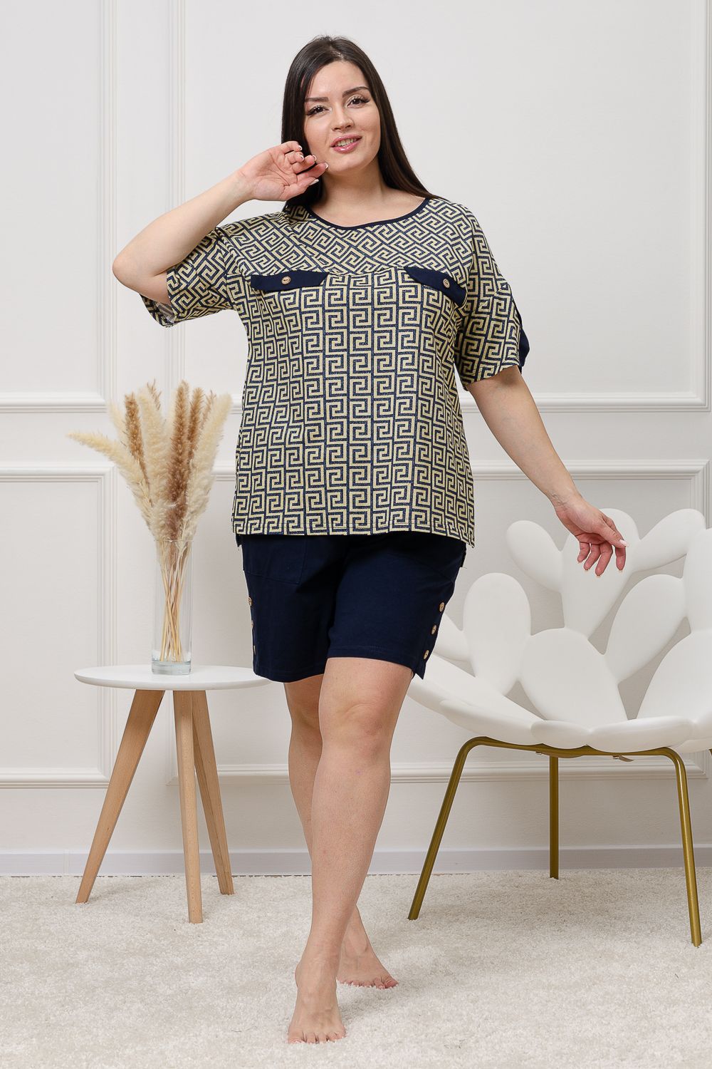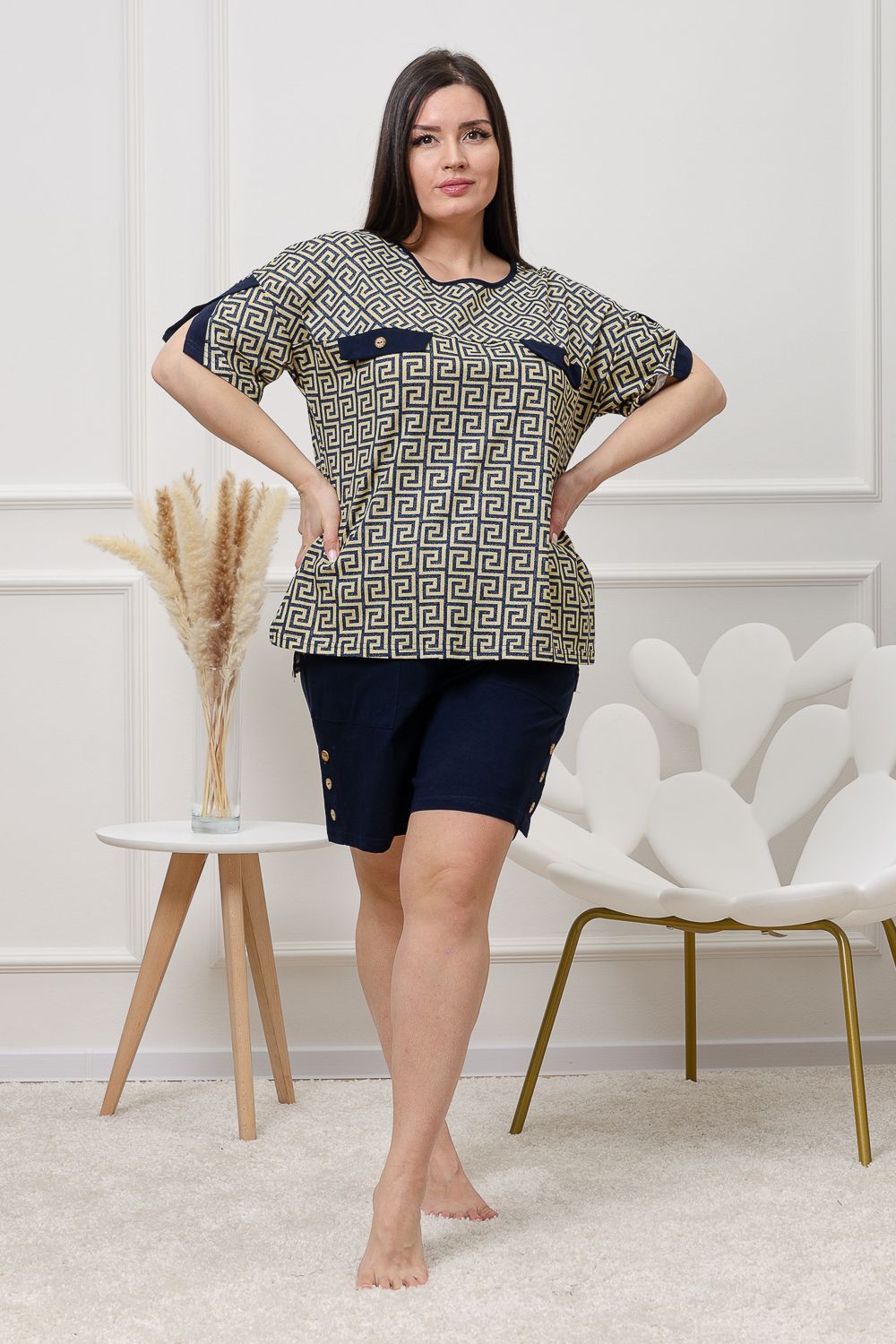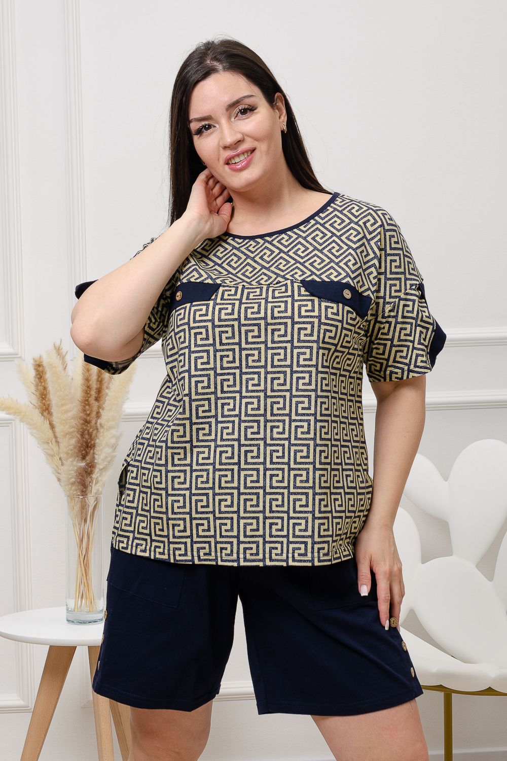 Костюм состоит из туники и шорт. Туника прямого силуэта, с округлой горловиной, длиной до середины бедра. Полочка с кокеткой и декоративными клапанами. Спинка с кокеткой, удлиненная. В нижней части боковых швов обработаны разрезы. Рукав короткий, с фигурными разрезами. Горловина обработана бейкой из отделочного полотна. Шорты "бермуды" прямые, свободные, на поясе, с боковыми накладными карманами. В нижней части боковых швов обработаны декоративные шлицы с отделочными пуговицами.