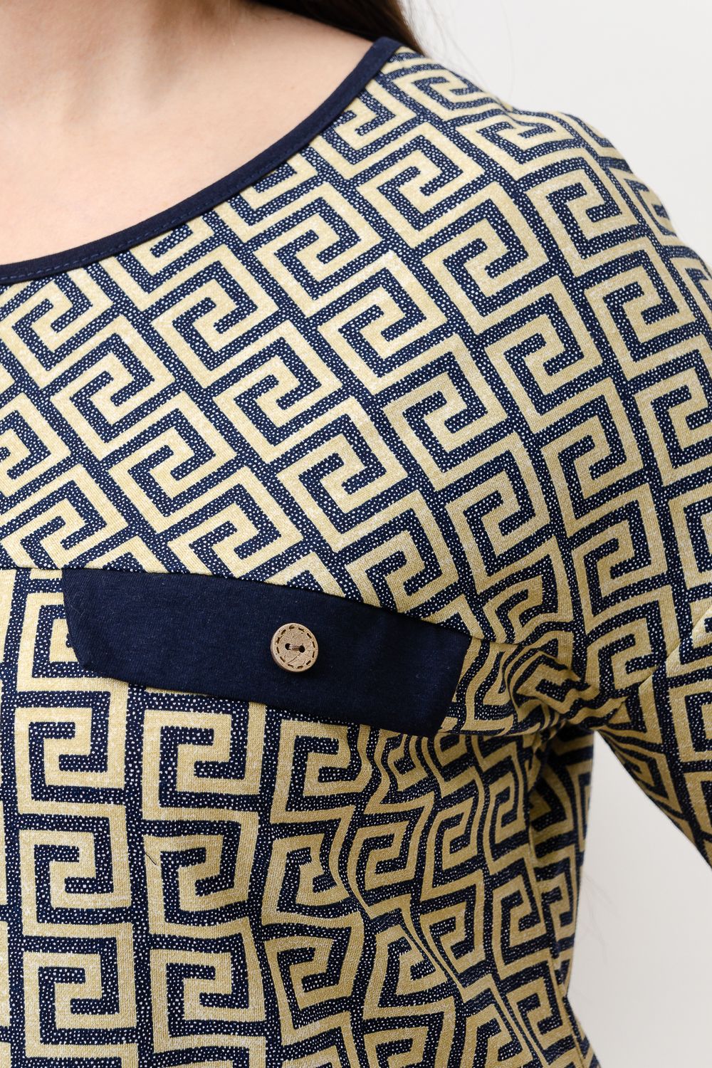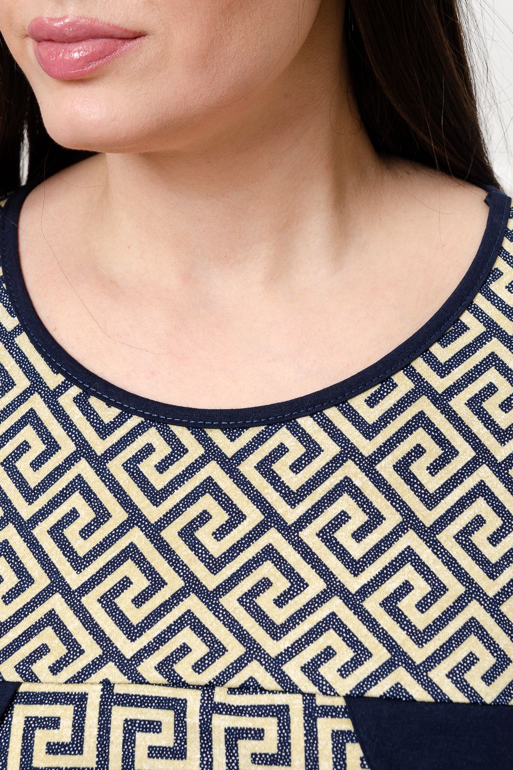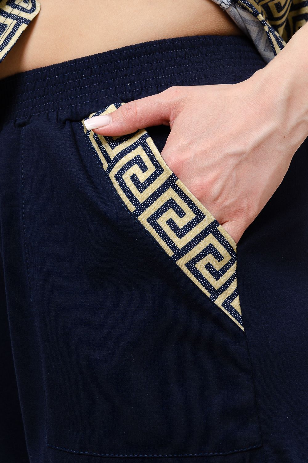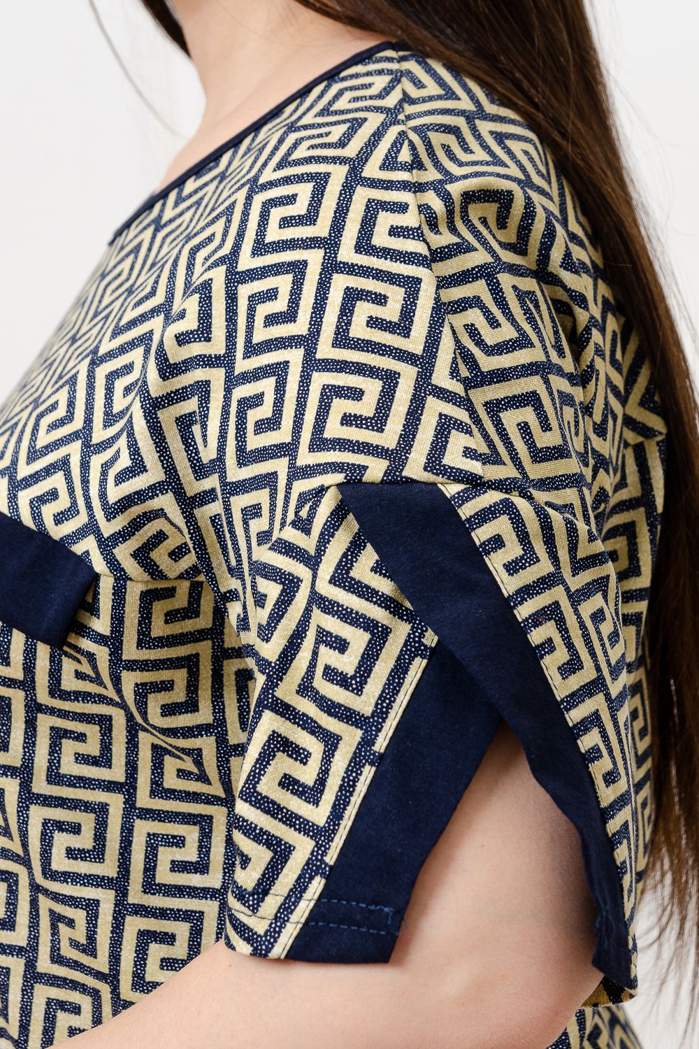 Костюм состоит из туники и шорт. Туника прямого силуэта, с округлой горловиной, длиной до середины бедра. Полочка с кокеткой и декоративными клапанами. Спинка с кокеткой, удлиненная. В нижней части боковых швов обработаны разрезы. Рукав короткий, с фигурными разрезами. Горловина обработана бейкой из отделочного полотна. Шорты "бермуды" прямые, свободные, на поясе, с боковыми накладными карманами. В нижней части боковых швов обработаны декоративные шлицы с отделочными пуговицами.