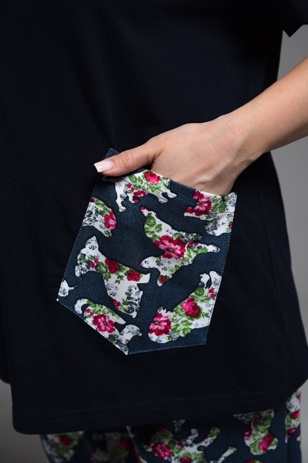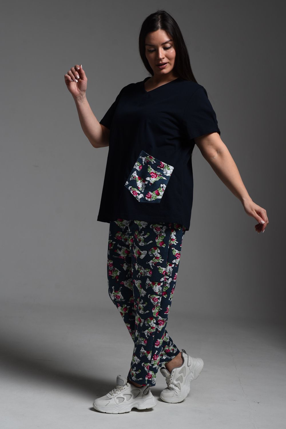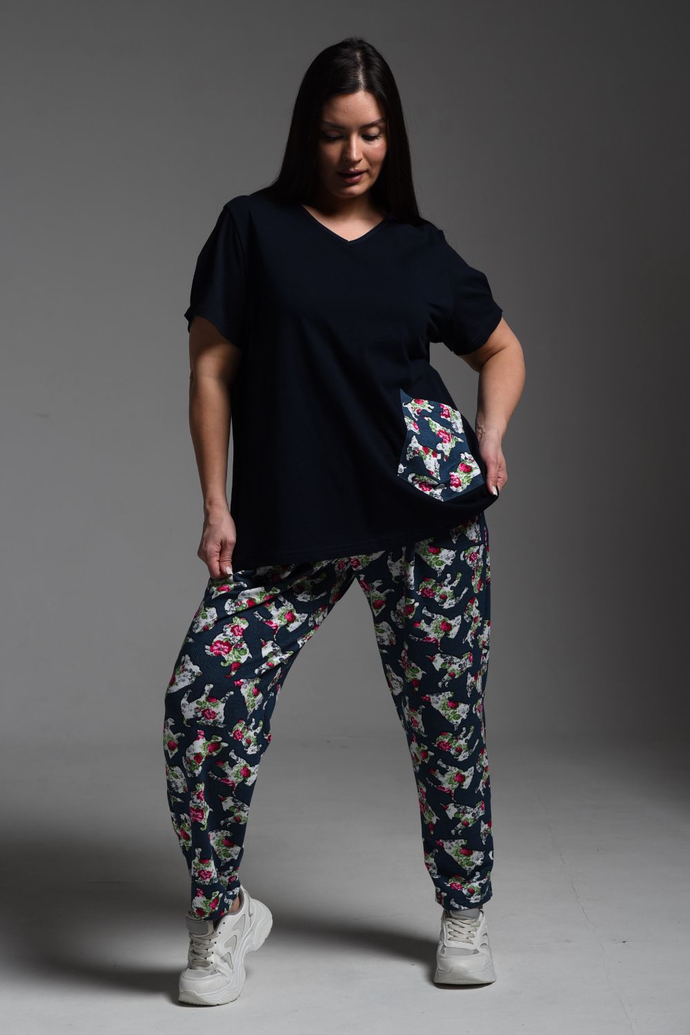 Костюм состоит из туники и брюк. Туника прямого силуэта, с V-образной горловиной. Рукав втачной, короткий, с декоративным защипом. В нижней части полочки расположен накладной карман из отделочного полотна. Горловина обработана бейкой из основного полотна. Брюки на поясе, с боковыми карманами, спереди со складками по шву притачивания пояса.