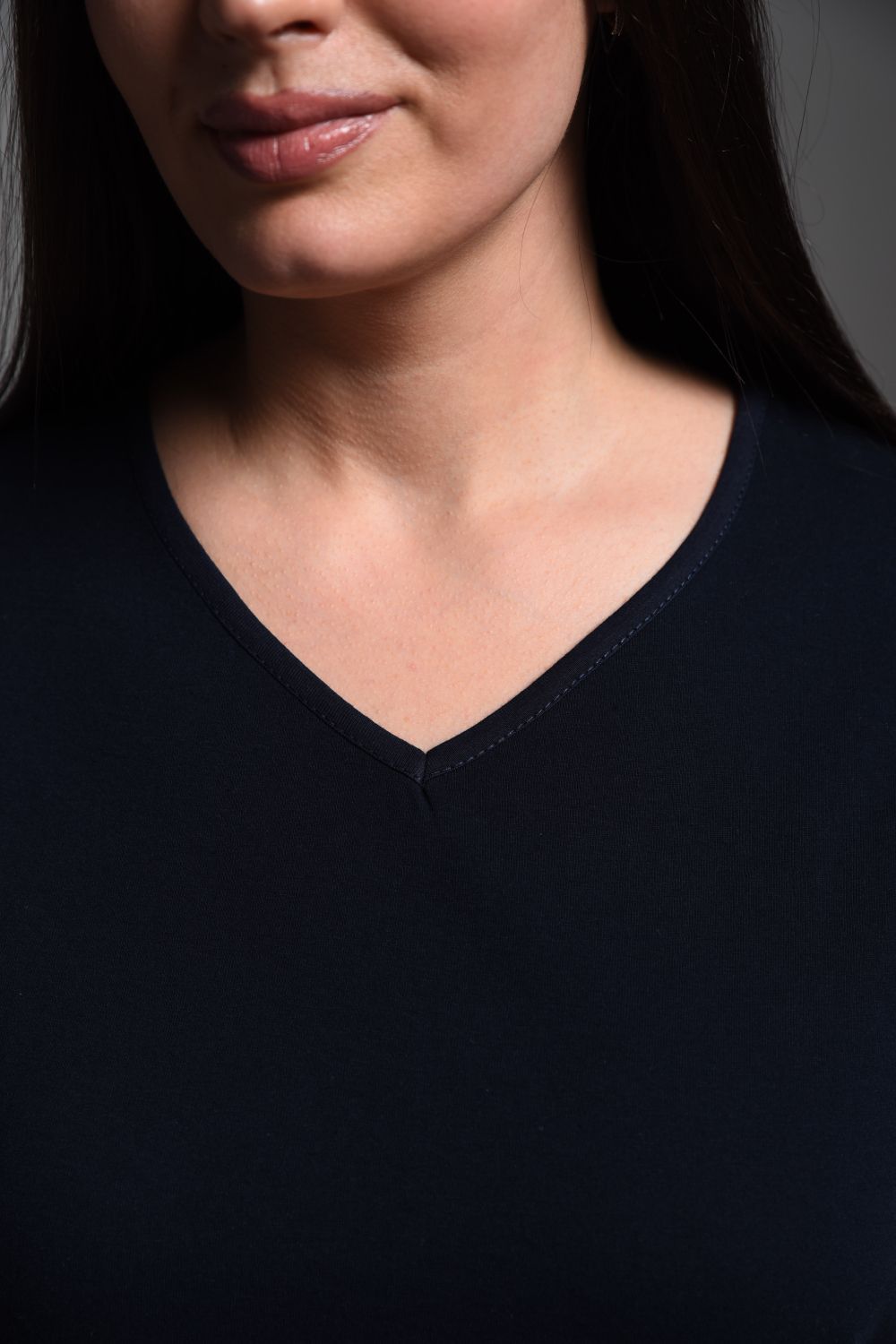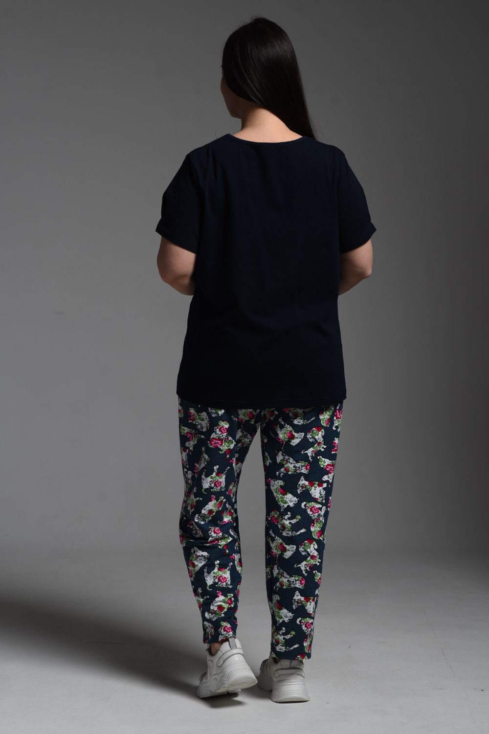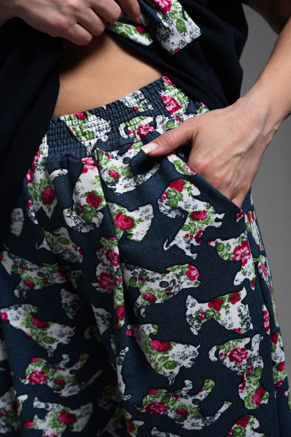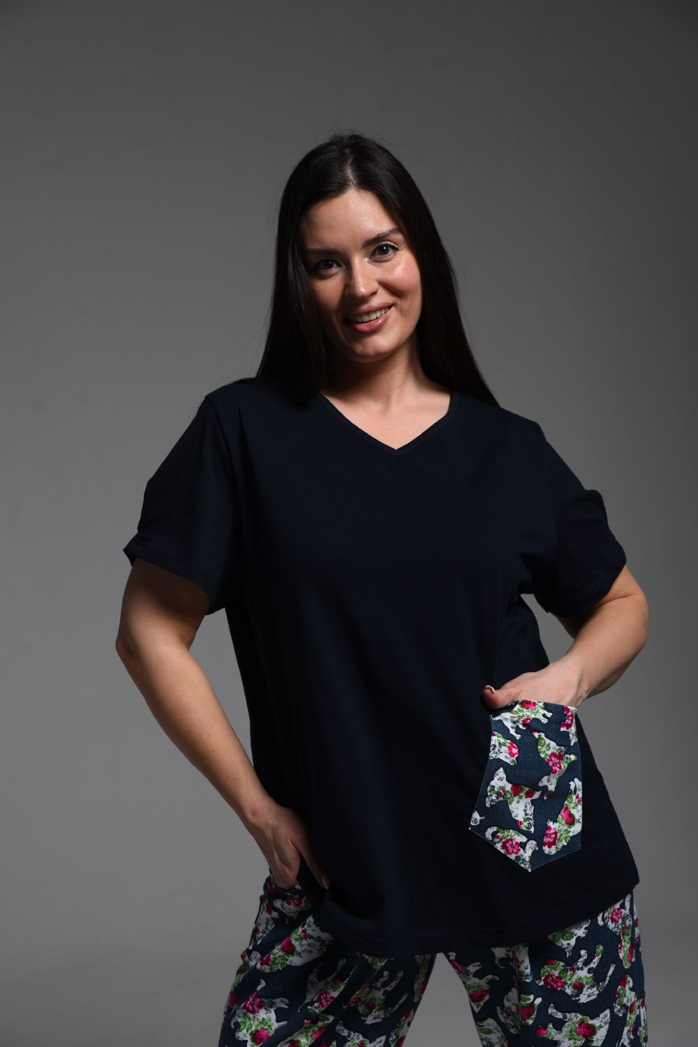 Костюм состоит из туники и брюк. Туника прямого силуэта, с V-образной горловиной. Рукав втачной, короткий, с декоративным защипом. В нижней части полочки расположен накладной карман из отделочного полотна. Горловина обработана бейкой из основного полотна. Брюки на поясе, с боковыми карманами, спереди со складками по шву притачивания пояса.