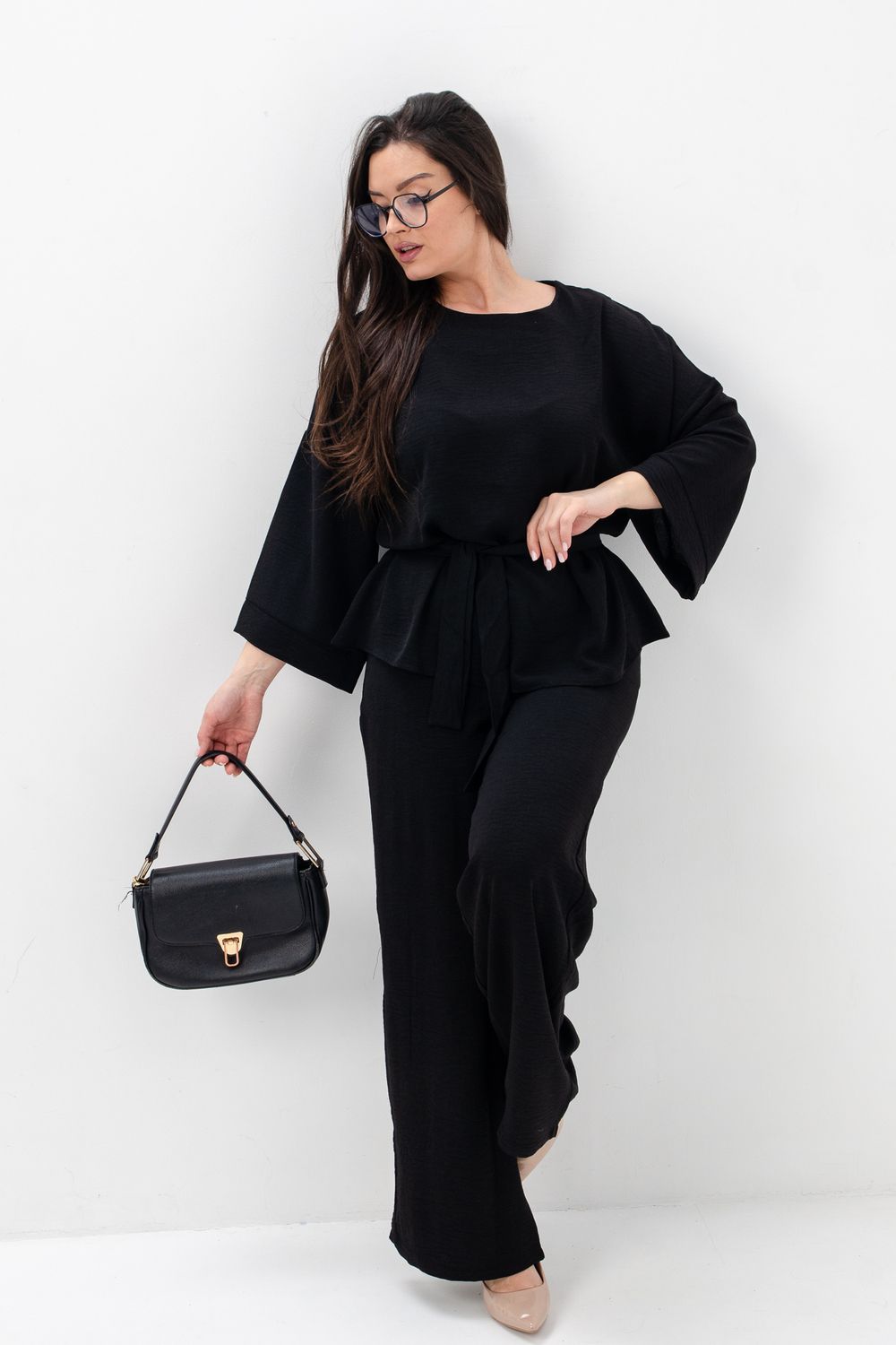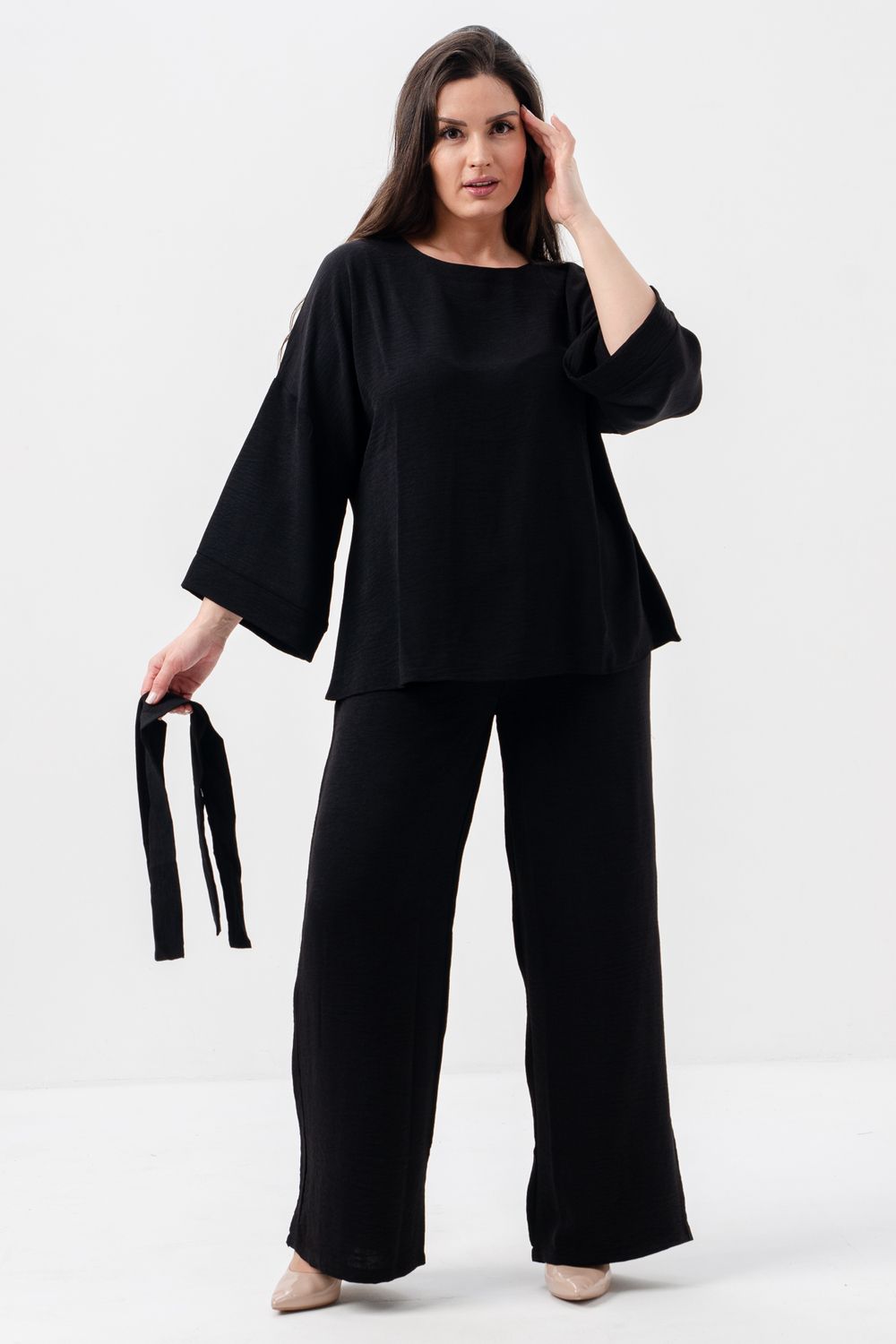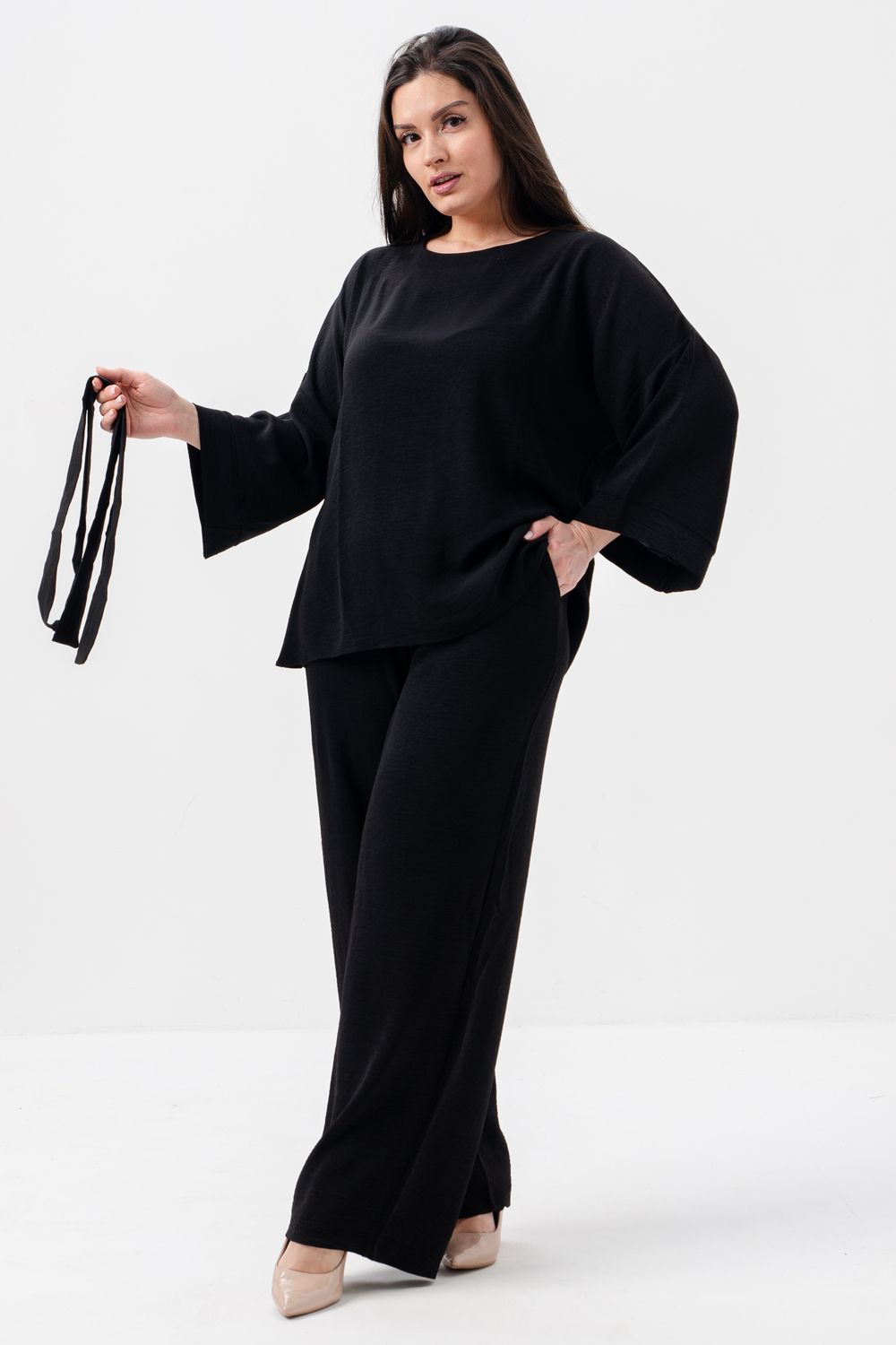 Женский брючный костюм из сингапура-это элегантное и удобное решение для тех, кто ценит стиль и комфорт. Он состоит из блузки и брюк свободного кроя на резинке с карманами.