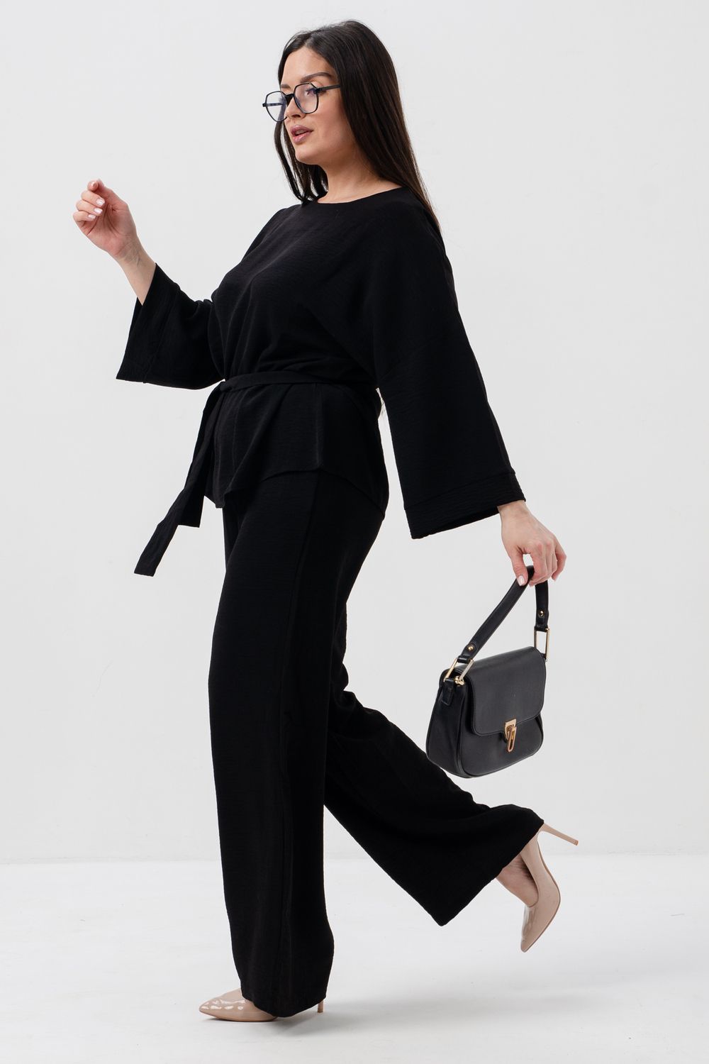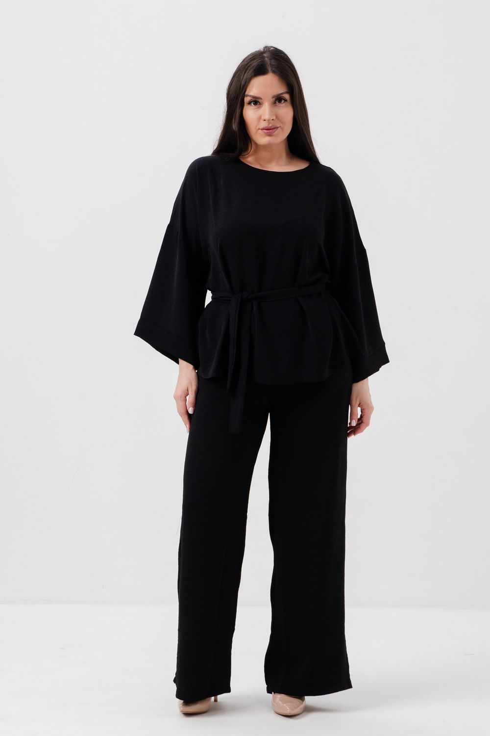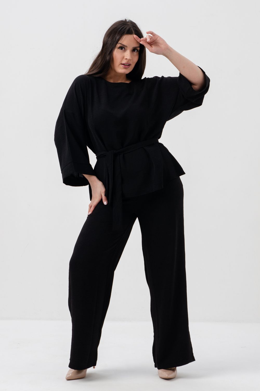 Женский брючный костюм из сингапура-это элегантное и удобное решение для тех, кто ценит стиль и комфорт. Он состоит из блузки и брюк свободного кроя на резинке с карманами.