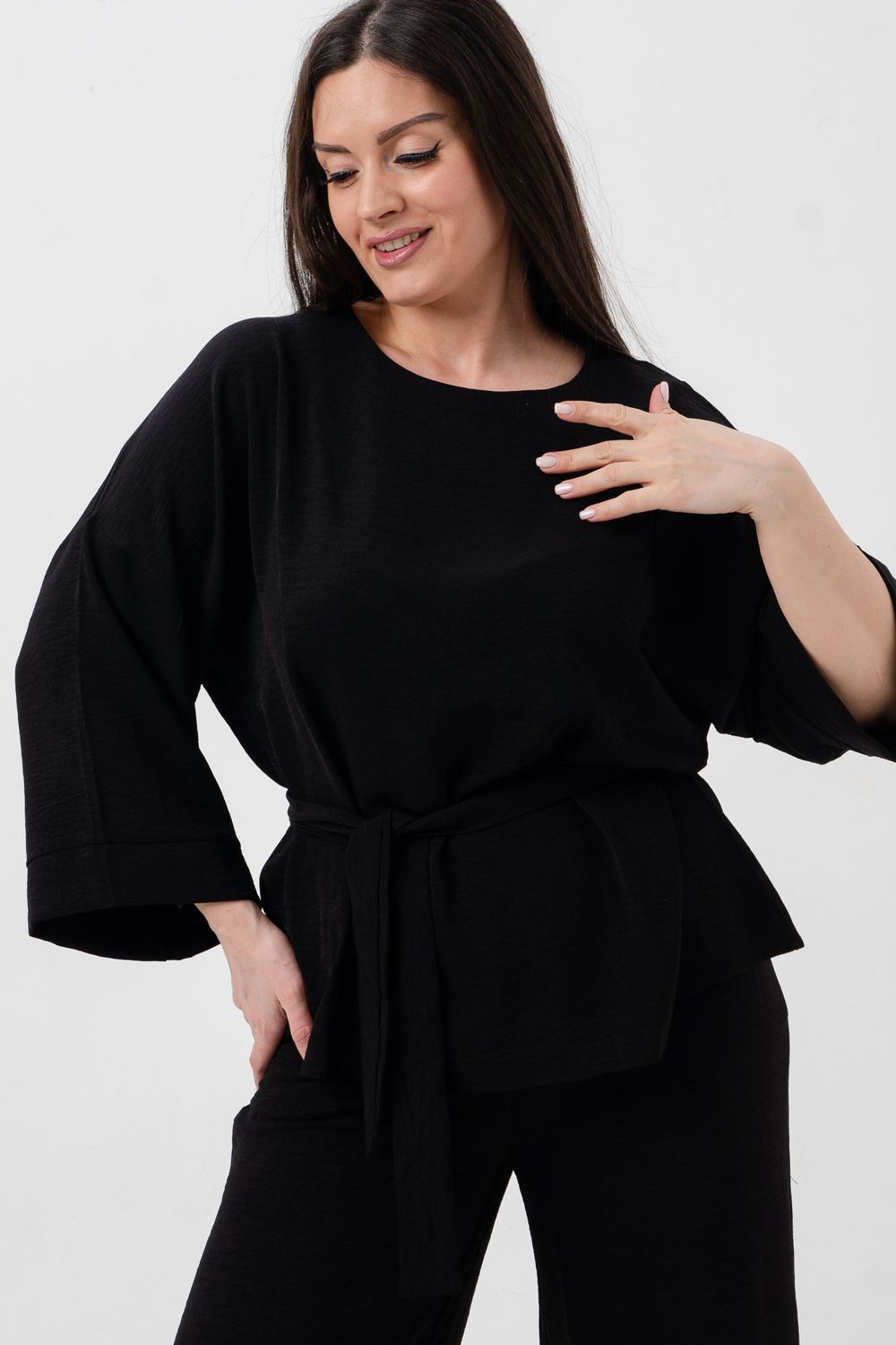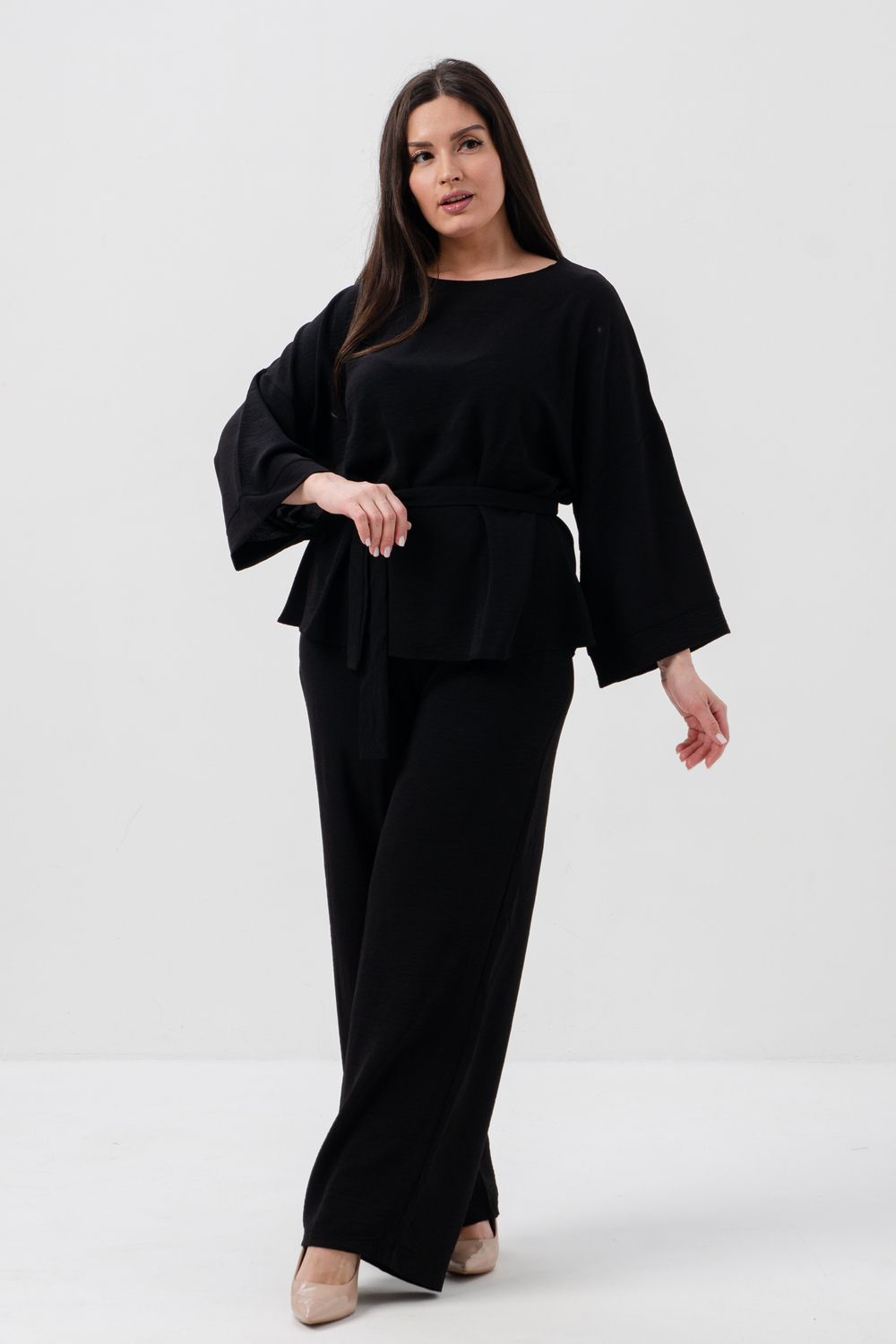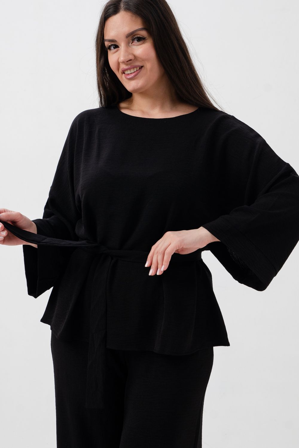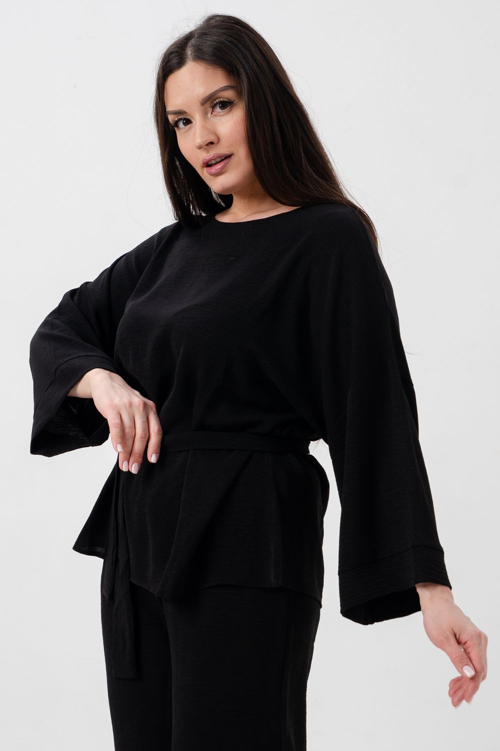 Блузка привлекает внимание длинным расклёшенным рукавом на манжете, что придаёт наряду изысканность и утончённость. Наличие пояса подчёркивает талию и добавляет изящества образу.