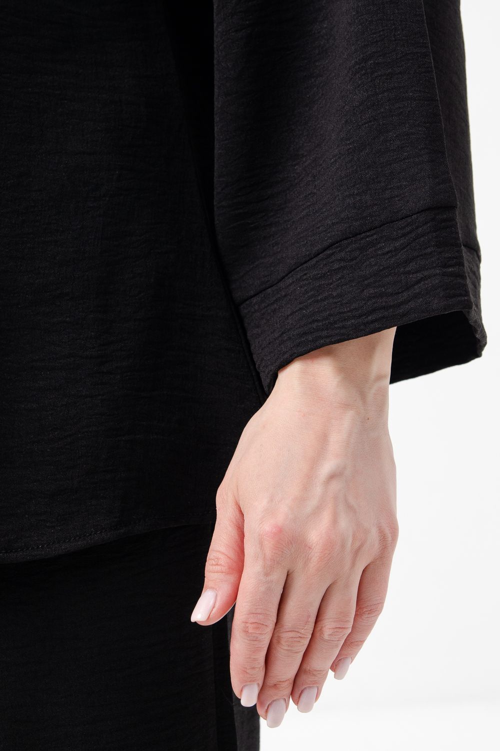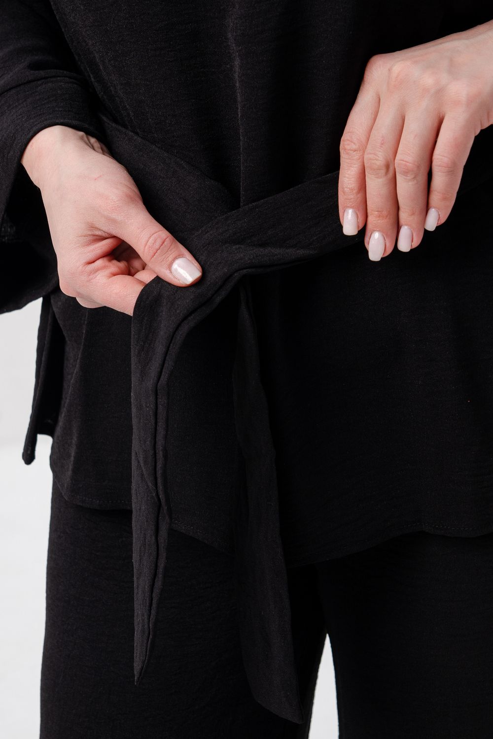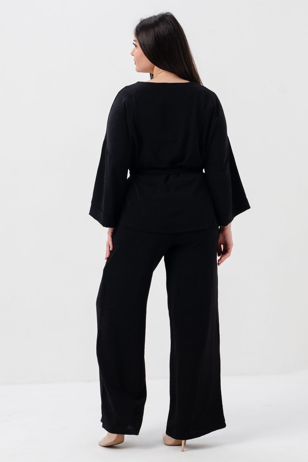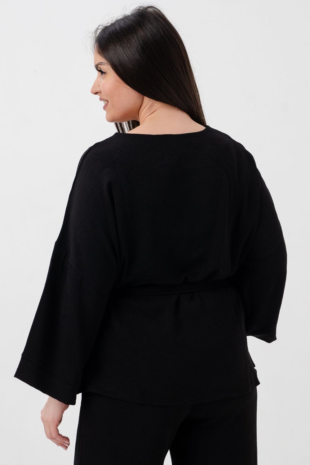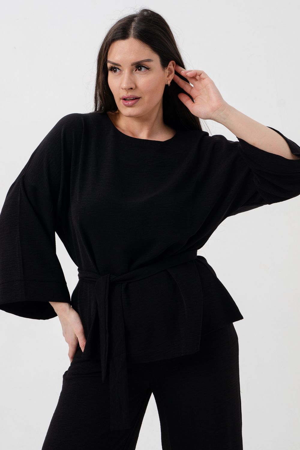 Блузка привлекает внимание длинным расклёшенным рукавом на манжете, что придаёт наряду изысканность и утончённость. Наличие пояса подчёркивает талию и добавляет изящества образу.