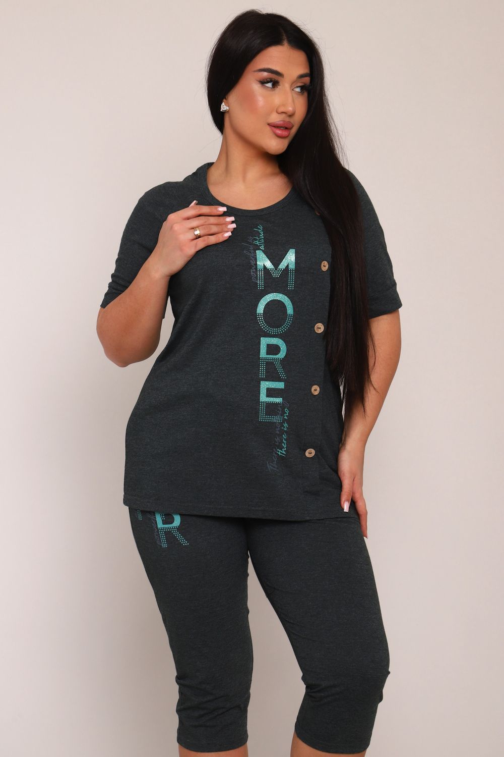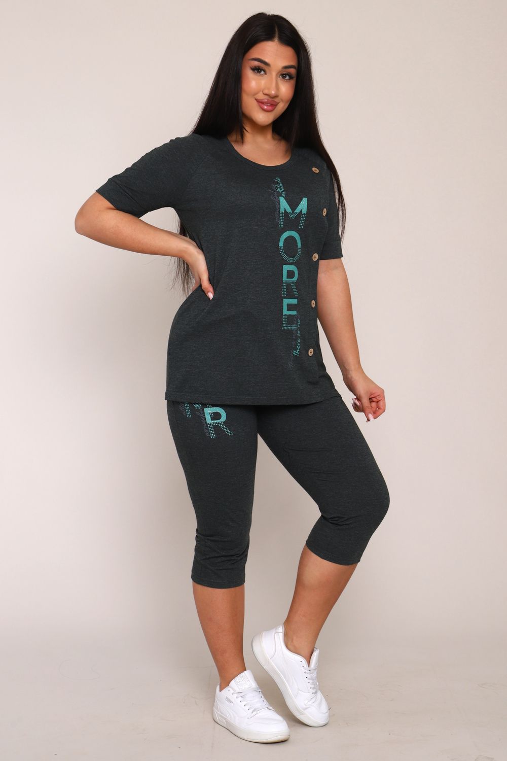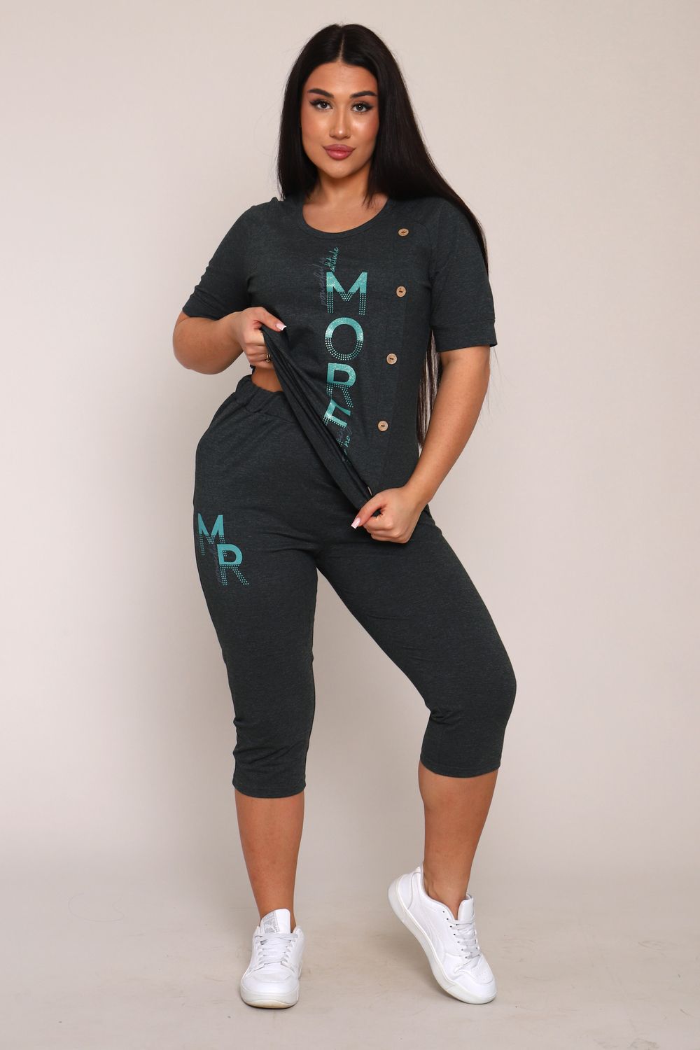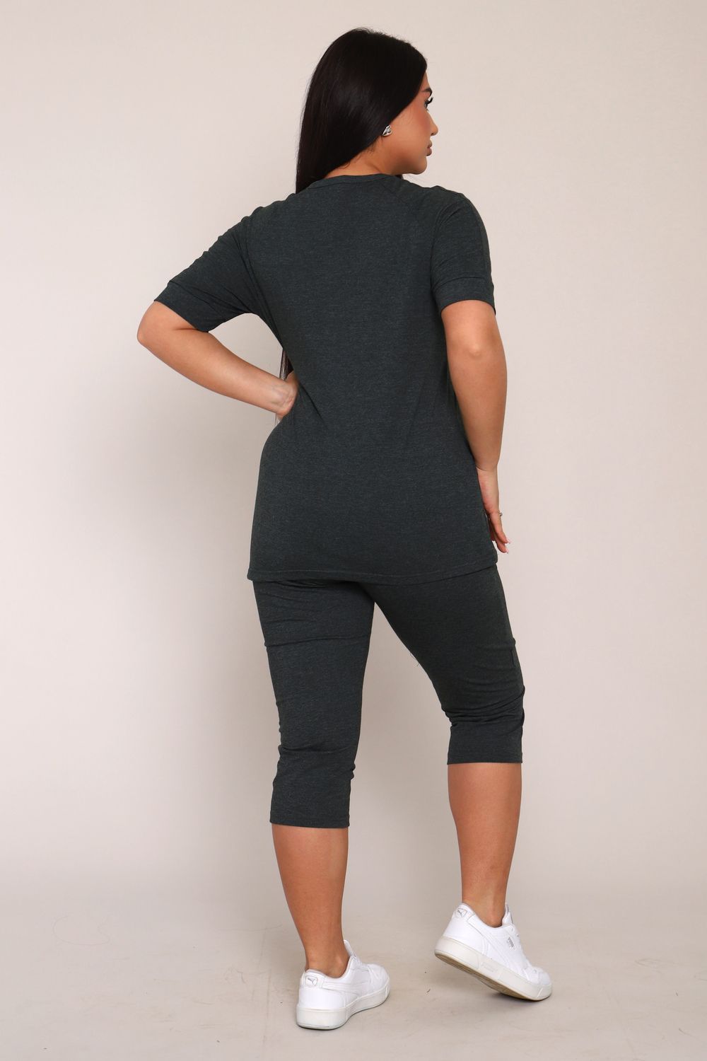 Комплект состоит из футболки и бриджей. Свободная футболка. Бриджи плотно прилегающие. Комплект подойдет на любой тип фигуры.