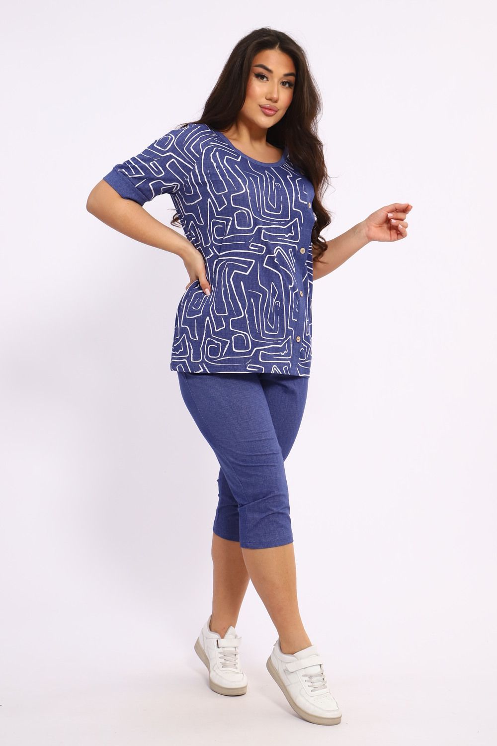 Костюм женский выполнен из трикотажного полотна кулирка. Костюм состоит из футболки и бридж. Футболка свободного силуэта. Бриджи свободного кроя чуть ниже колен.