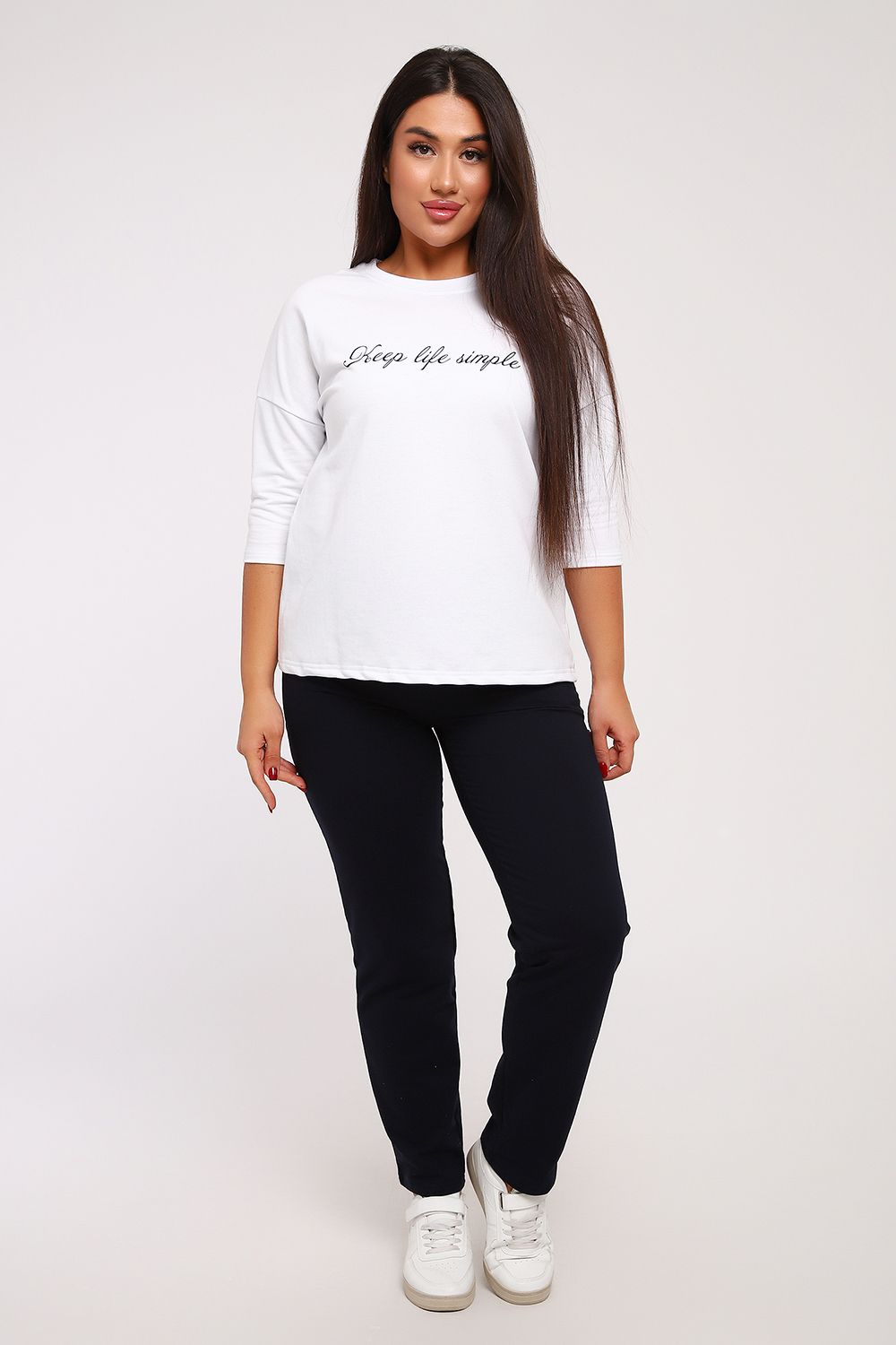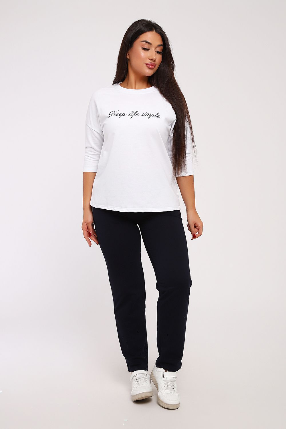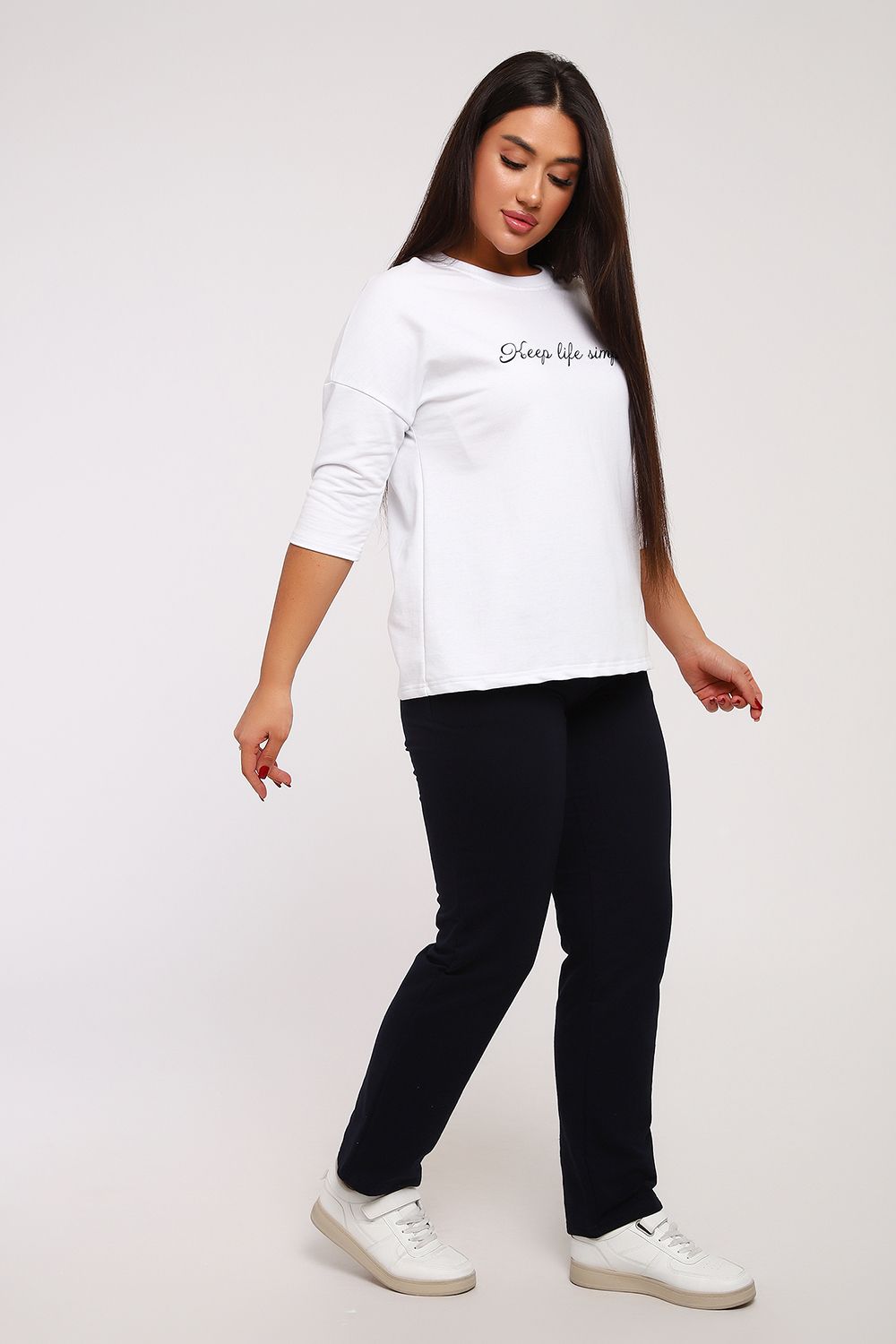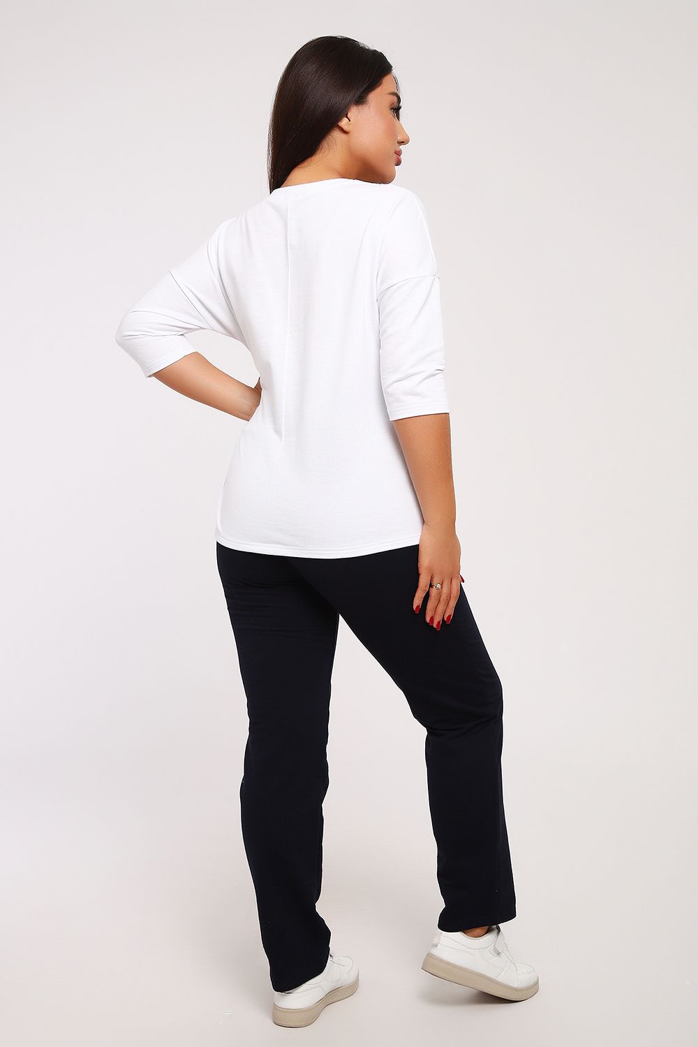 Стильный женский повседневный костюм с брюками из легкой дышащей ткани. Выполнен из мягкого футера двухнитка высокого качества. Классические прямые брюки с высокой посадкой хорошо сядут на любой тип фигуры. Футболка со спущенным рукавом придаст вам женственность и легкость. При выборе лучше ориентироваться на российские размеры, ну а если хотите по свободнее, то берите на размер больше.