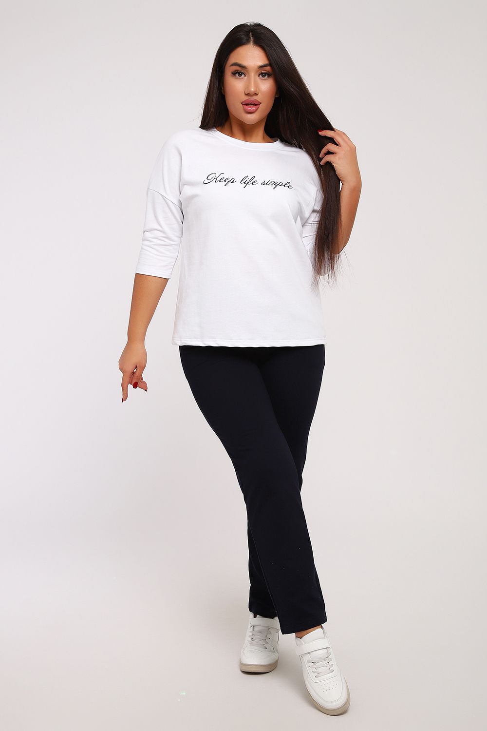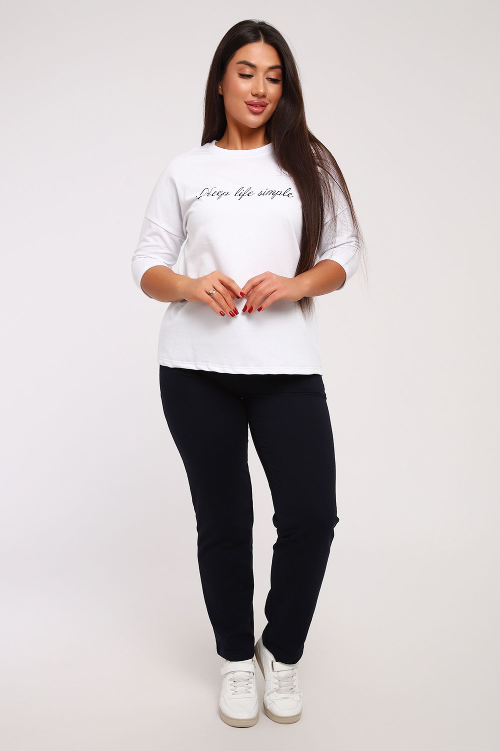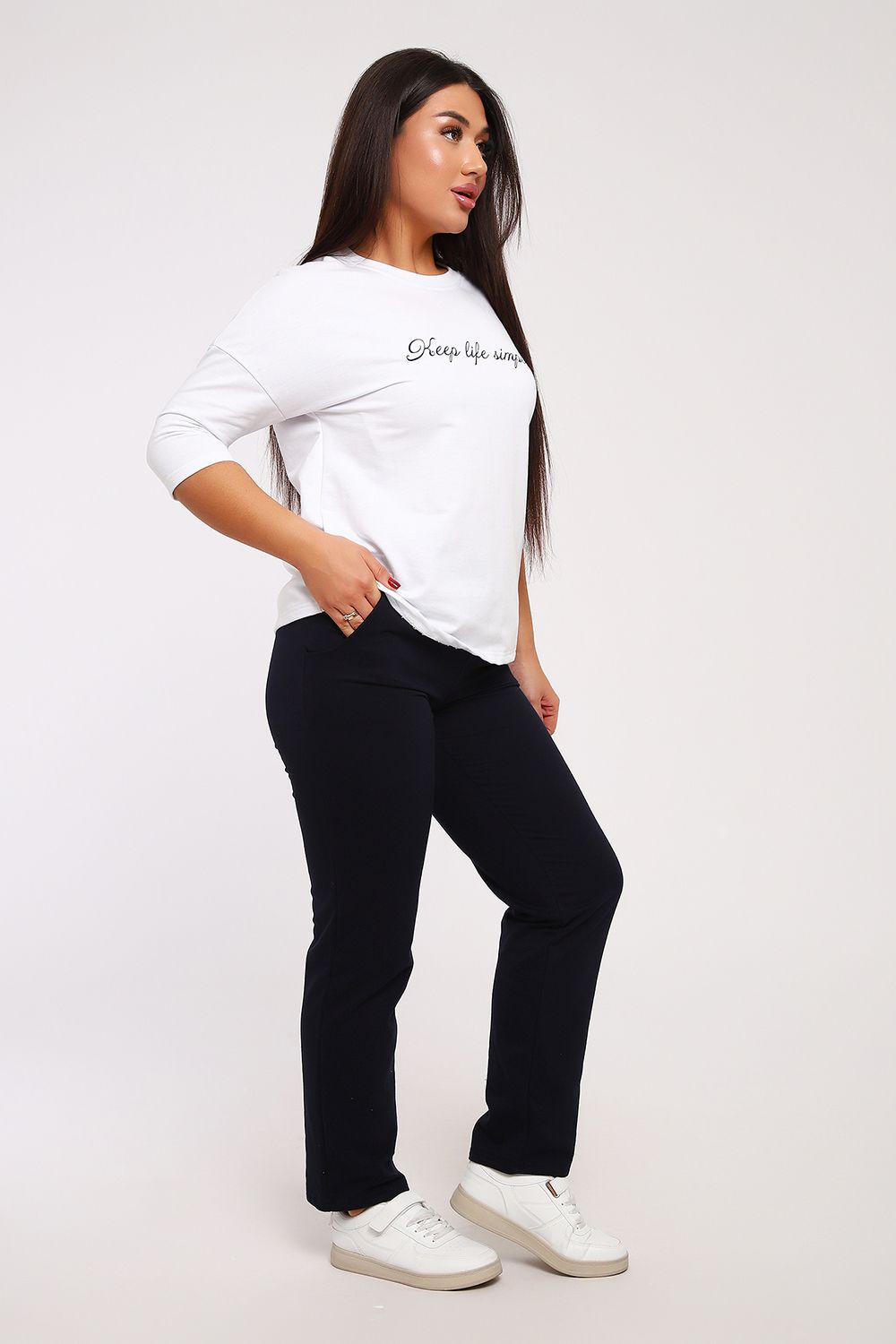 Стильный женский повседневный костюм с брюками из легкой дышащей ткани. Выполнен из мягкого футера двухнитка высокого качества. Классические прямые брюки с высокой посадкой хорошо сядут на любой тип фигуры. Футболка со спущенным рукавом придаст вам женственность и легкость. При выборе лучше ориентироваться на российские размеры, ну а если хотите по свободнее, то берите на размер больше.