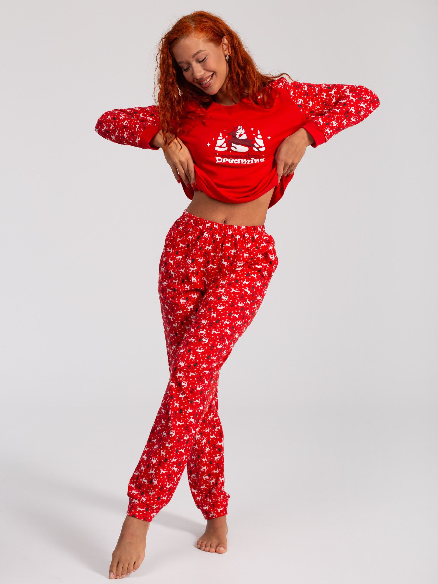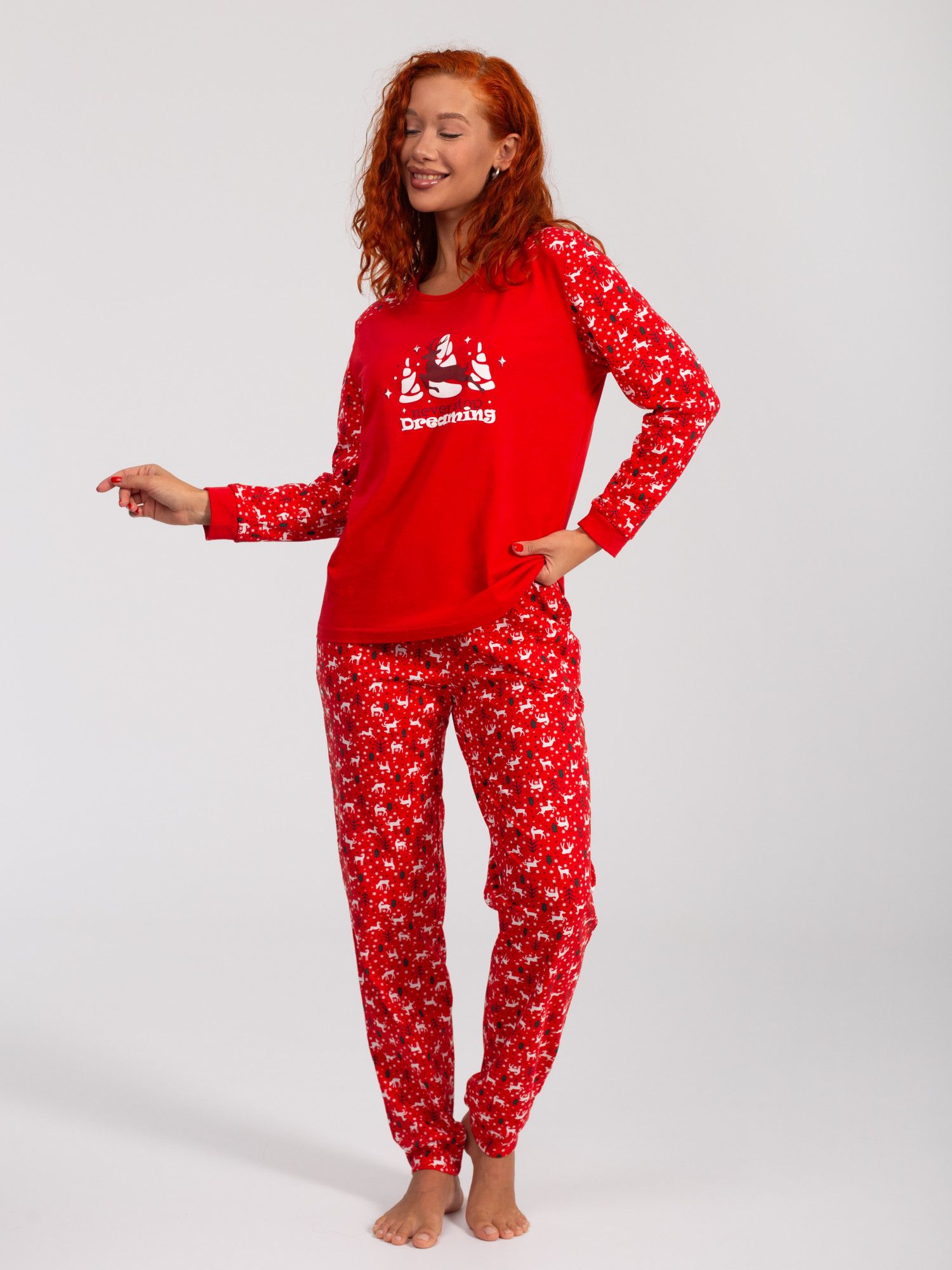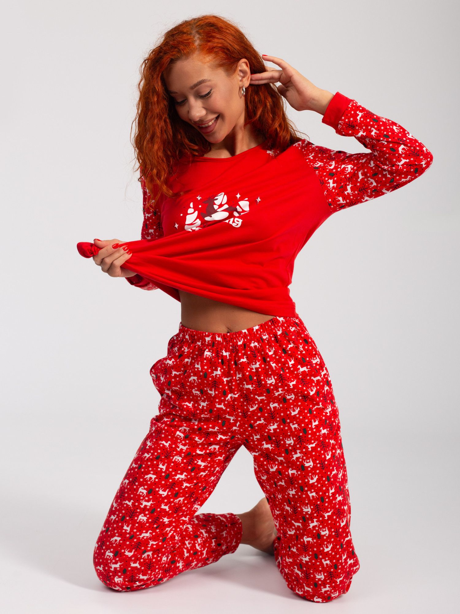 Костюм женский кулирка с брюками "ЗИМНИЙ ЛЕС" КРАСНЫЙ