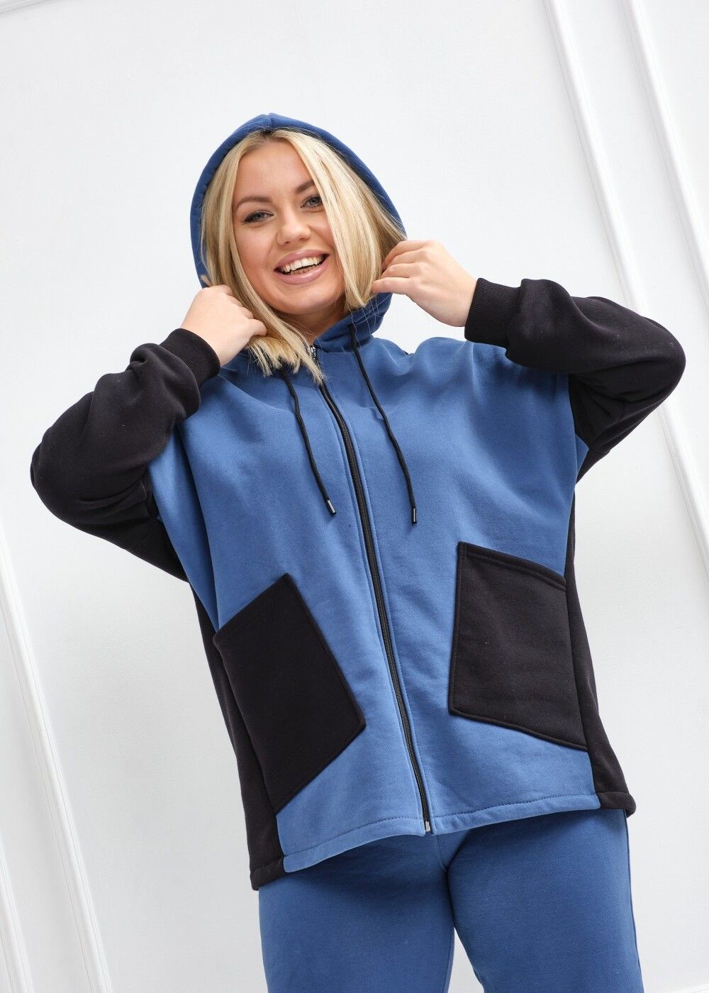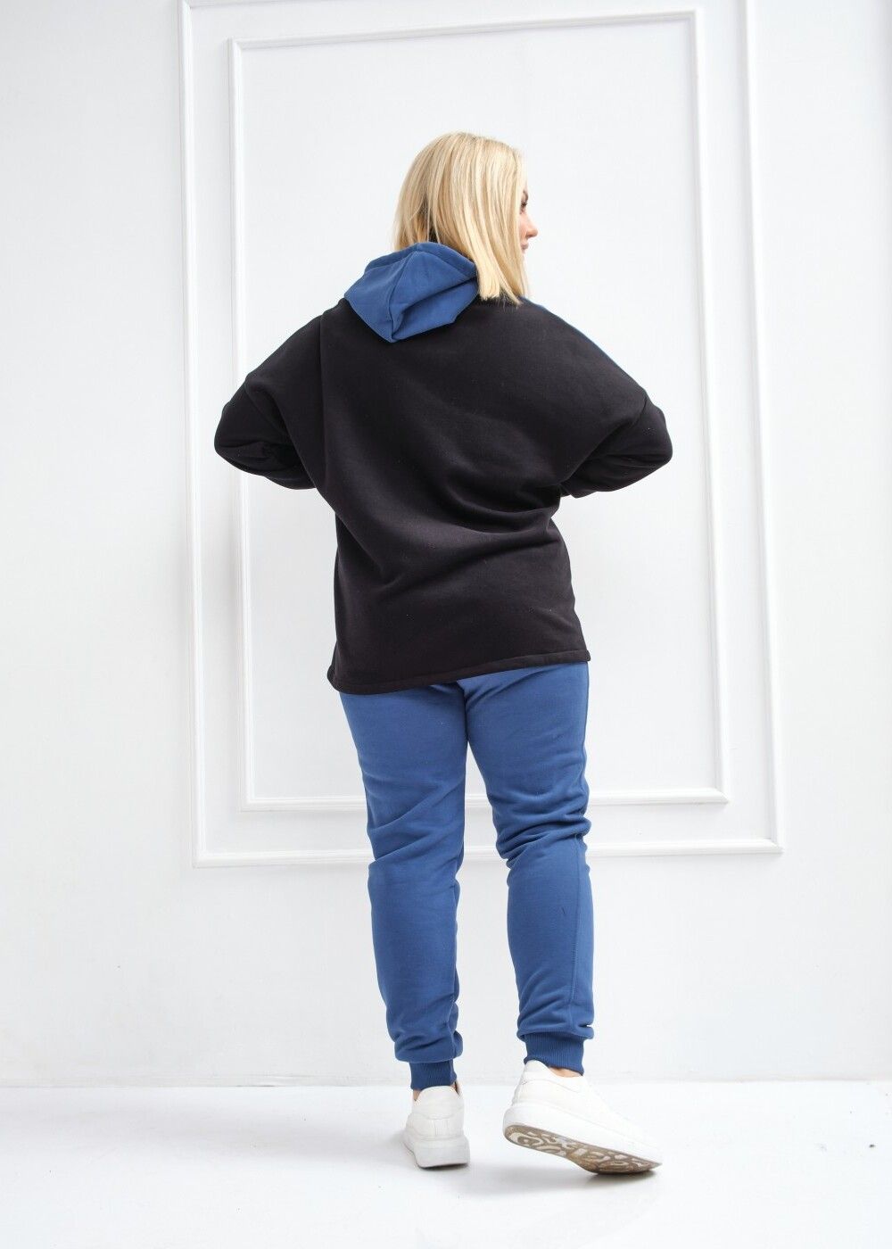 Костюм женский с начесом состоит из толстовки и брюк. Толстовка с капюшоном, на молнии, прямого силуэта, с длинным спущенным рукавом из контрасной ткани. На полочке толстовки настрочены накладные карманы из контрасной ткани. Брюки на поясе, заужены к низу, на манжете.