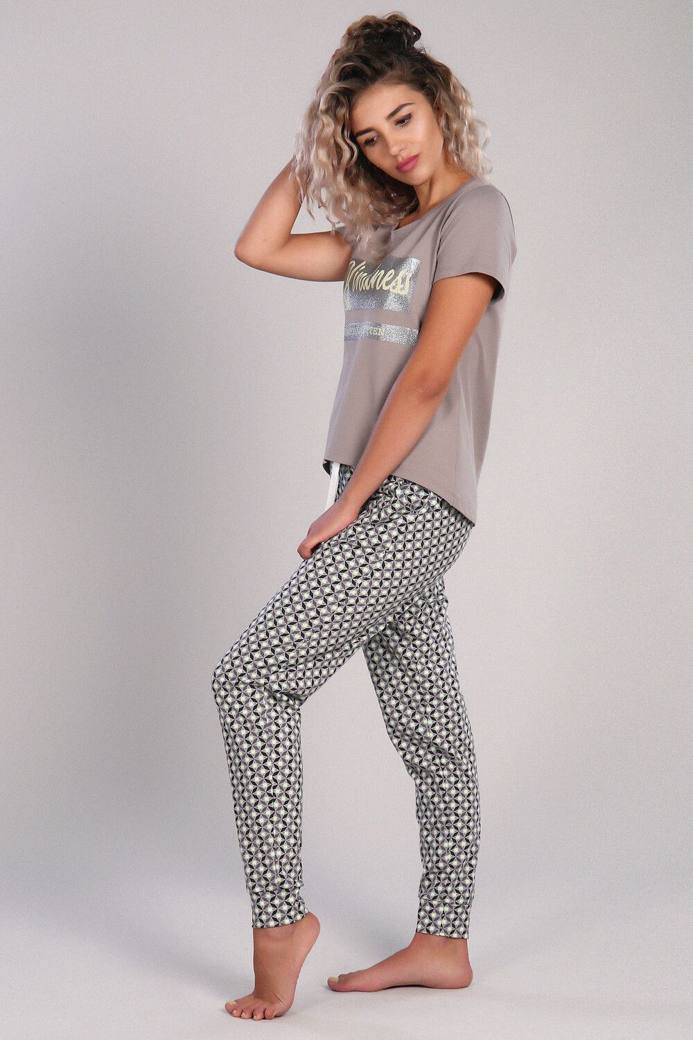 Костюм женский с брюками и футболкой. Футболка свободного кроя с блестящим эскизом и мягкой тканью. Брюки с модным мелким рисунком, эластичным поясом со шнурками для регулировки удобства во время носки. Модель выполнена из высококачественного кулирного гладья с добавлением лайкры.