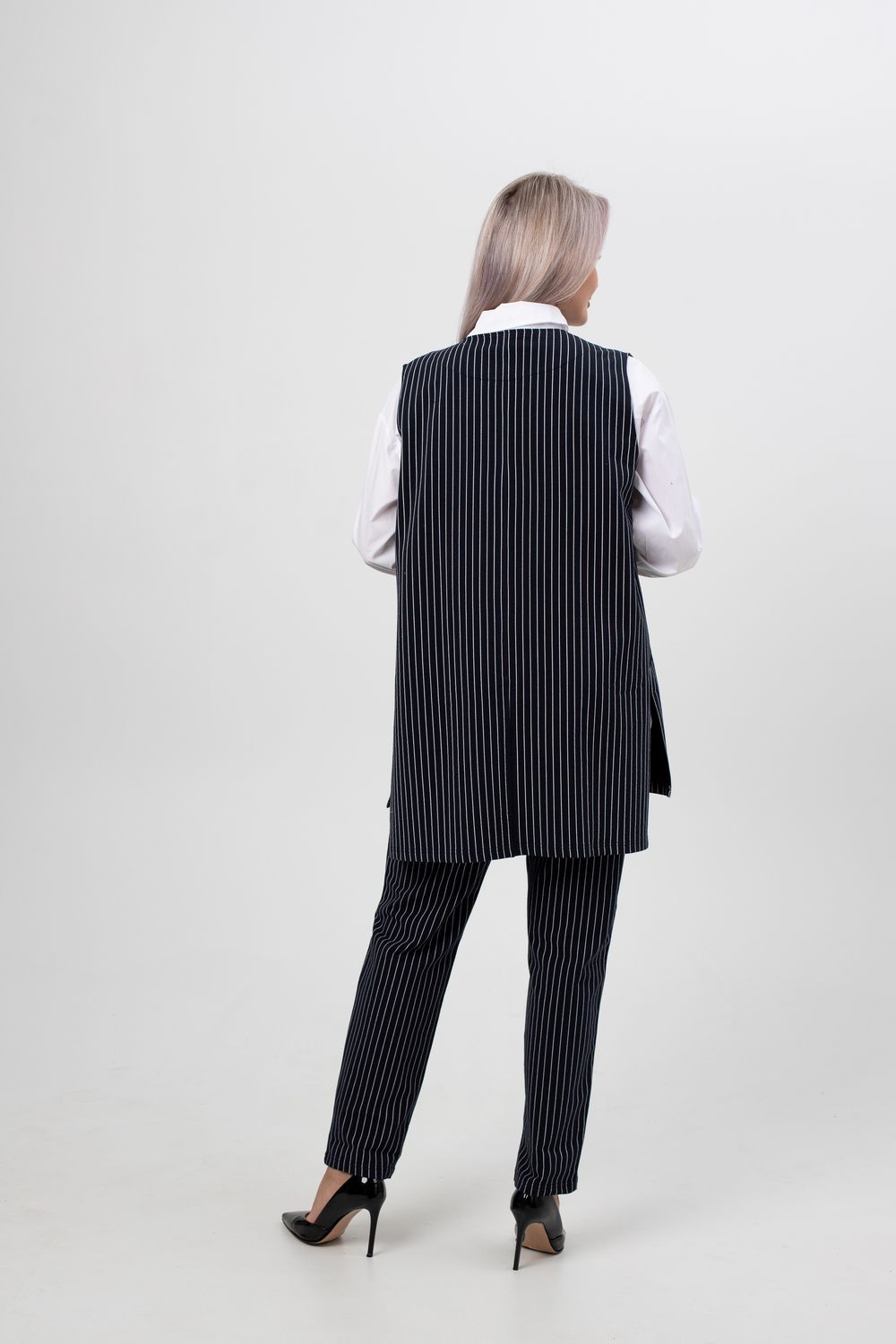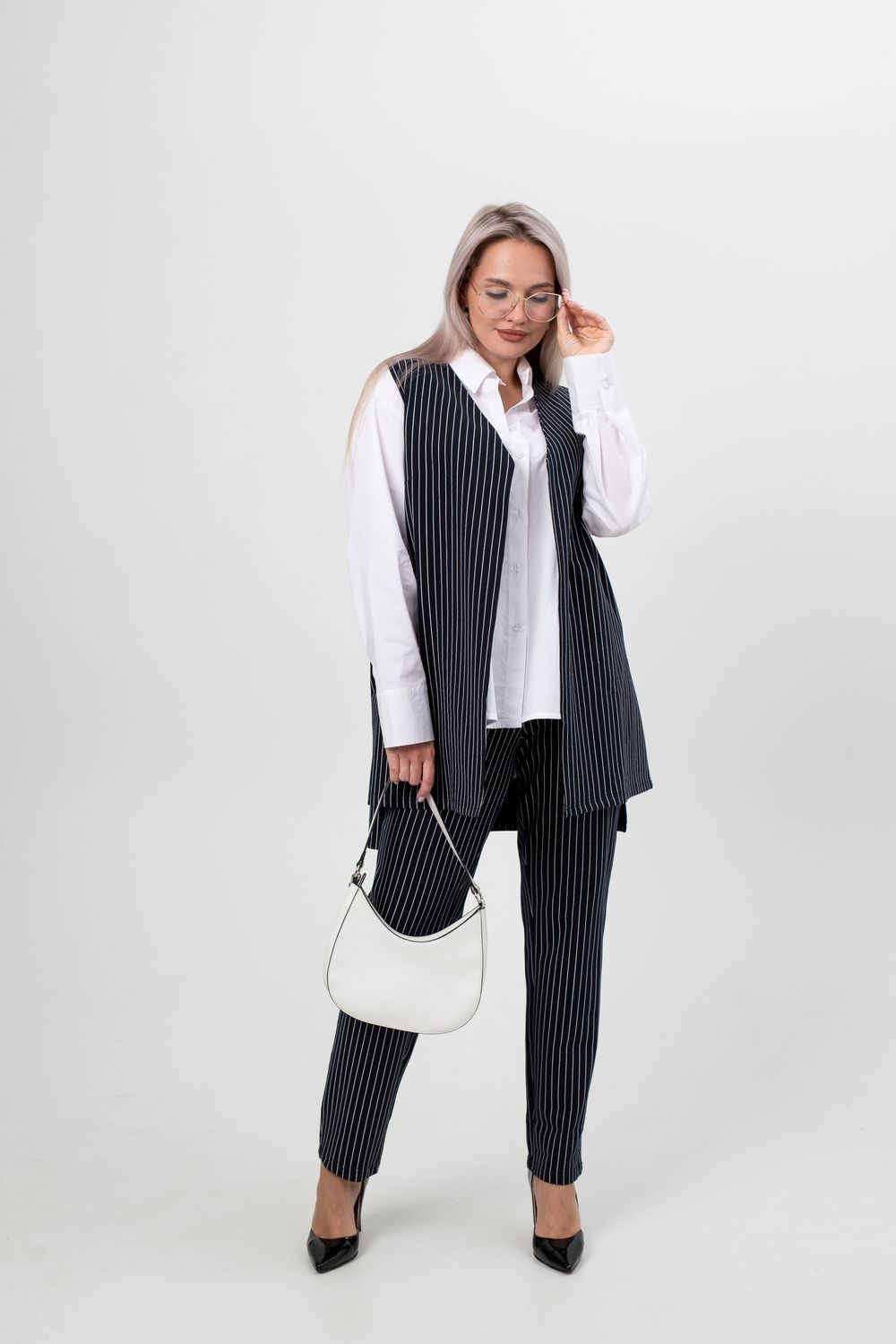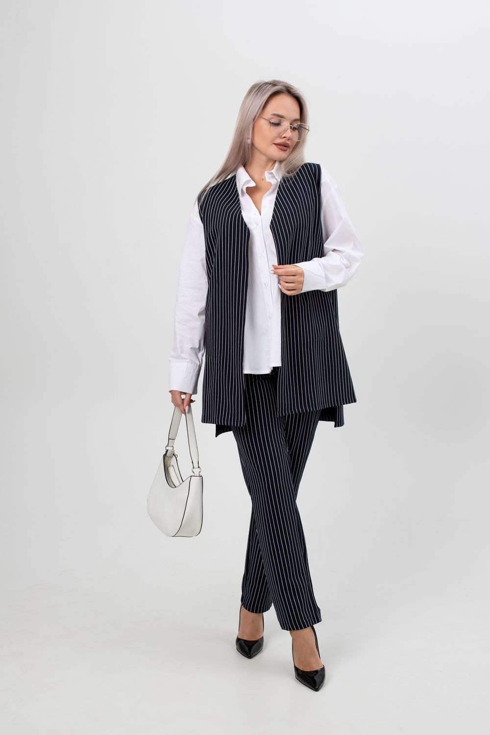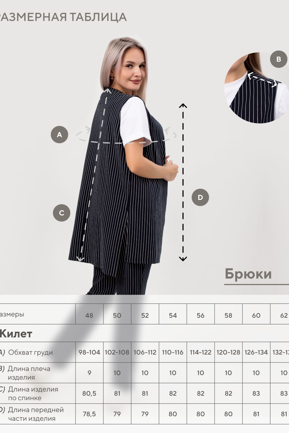 Костюм женский брючный праздничный - идеальный выбор для тех, кто ценит элегантность и комфорт. Двойка из жилетки и брюк подойдет для создания делового образа. Свободный крой и деловой стиль позволяет носить эту уникальную одежду как в офис, так и на праздничные мероприятия. Прямые брюки с прорезными карманами добавляют стильности, а резинка в поясе обеспечивает удобную посадку. Состав из хлопка делает костюм практичным решением для осени. Трикотажная ткань футер мягкая и приятная на ощупь, отлично согревает в холодную погоду. Это помогает чувствовать себя уютно даже в зимний период. Жилет в полоску завершает классический вид комплекта, подчеркивая утонченность и разнообразие гардероба. Нарядный характер одежды предоставляет возможность использовать её не только в будни, но и для вечерних выходов. Утонченный дизайн подходит для женщин и девушек с нестандартной фигурой, предлагая оптимальное решение для больших размеров. Элегантность этой двойки заключается в строгих линиях кроя и внимании к деталям. Красиво садится на любую фигуру благодаря универсальности фасона. Брюки со штанами подходят как для полных, так и для беременных дам. Комплект в полоску заново открывает возможности изменить обыденный наряд до праздничного уровня. Темно-синий цвет не только модный тренд нынешнего сезона, но и верное выражение офисного дресс-кода без скучных шаблонов. Стильное сочетание цветов выглядит выгодно и современно одновременно. Неотразимый образ на деловых встречах или корпоративных событиях. Классические акценты следует дополнить своими любимыми аксессуарами. Таким образом образ становится цельным и полностью завершающим выбранный вами стиль одежды! Этот вариант соединяет лучшие качества строгого стиля с нескучным повседневным использованием гардероба. Будьте уверены: он никогда не выйдет из моды, оставаясь актуальным долгое время независимо от переменчивых веяний фэшн-трендов!