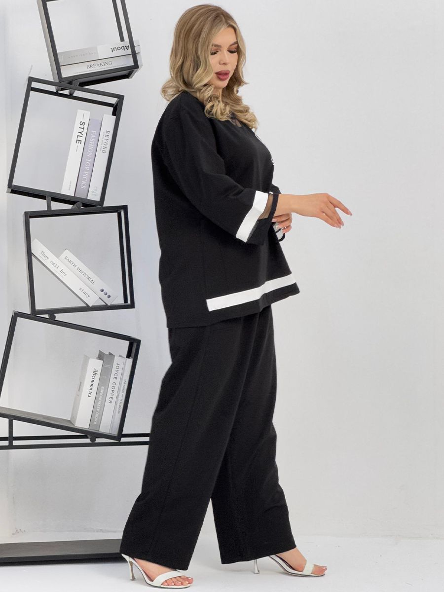 Женский брючный костюм из супрем отличается оригинальным дизайном.