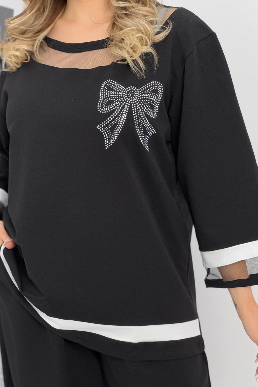 Костюм состоит из блузки и свободных брюк. Блузка имеет круглый вырез с сетчатой вставкой, рукава 3 четверти с белой полосой и сетчатой вставкой на манжетах, которые придают наряду легкость и изящество. На груди блузки прикреплен блестящий бант. Брюки черные, свободного кроя на резинке и с карманами.