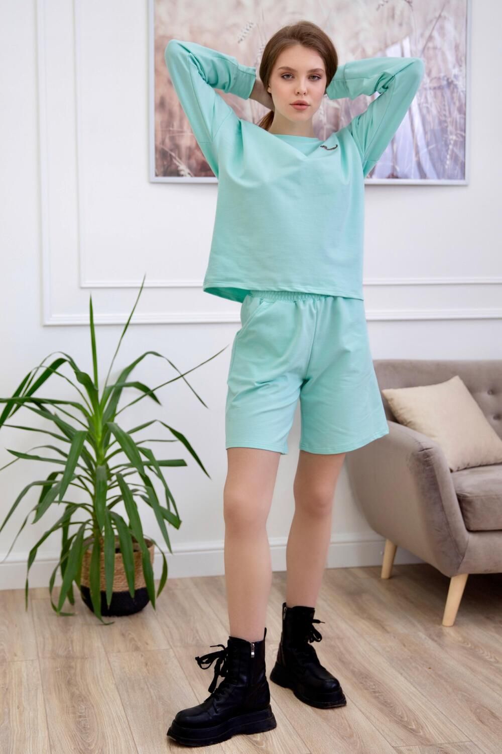 Модный женский костюм Таша состоит из свободного свитшота и шорт из футера 2‑х ниточного. Женская футболка и шорты имеют прямой свободный силуэт, подходящий девушкам, женщинам и подросткам. Идеально садится на высоких и не очень высоких девушек. Домашний костюм с шортами не захочется снимать, настолько он комфортный. Классный вариант для прогулок, в отпуск или поездок на море.