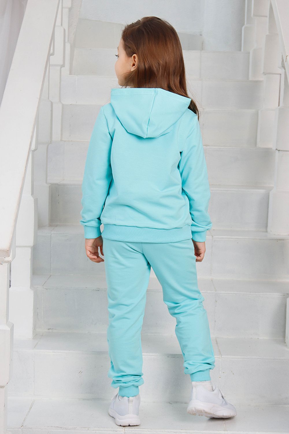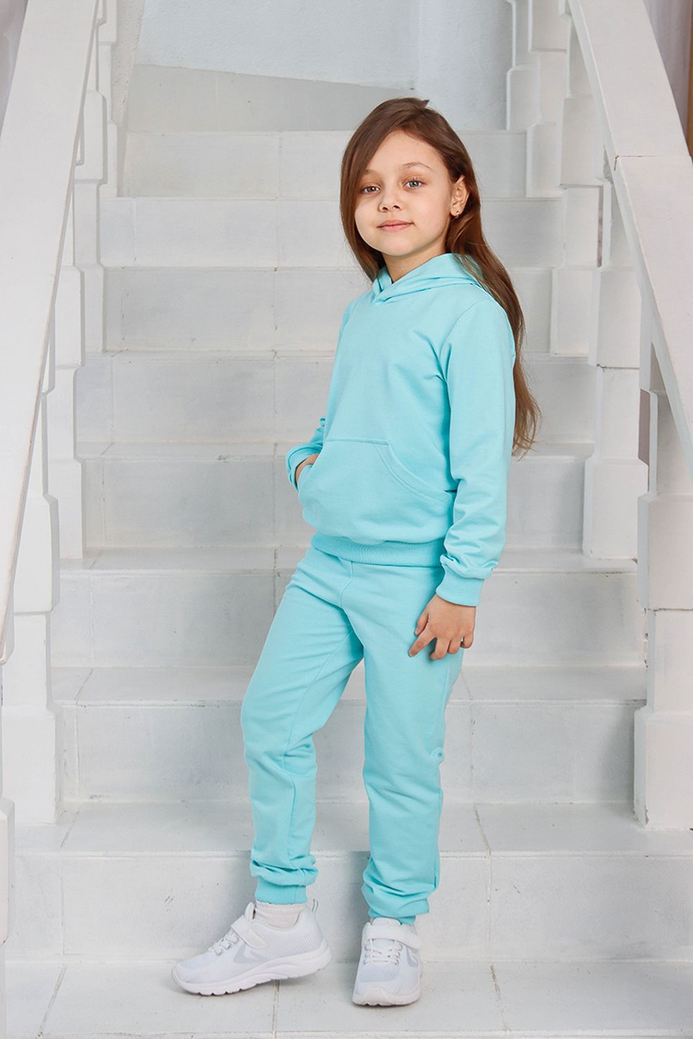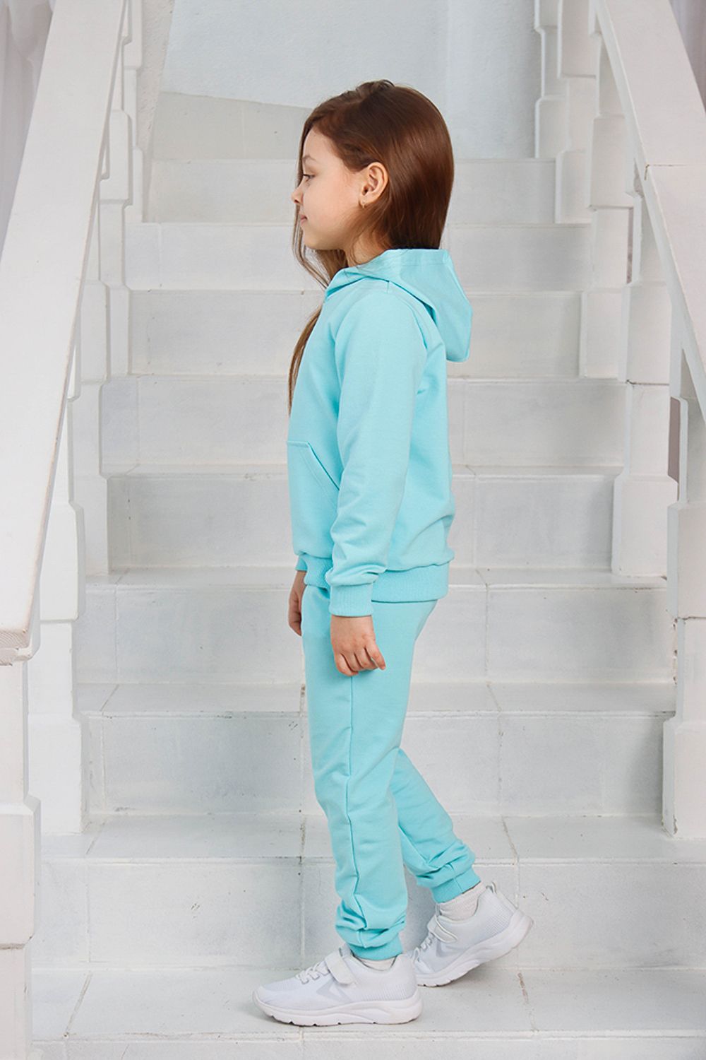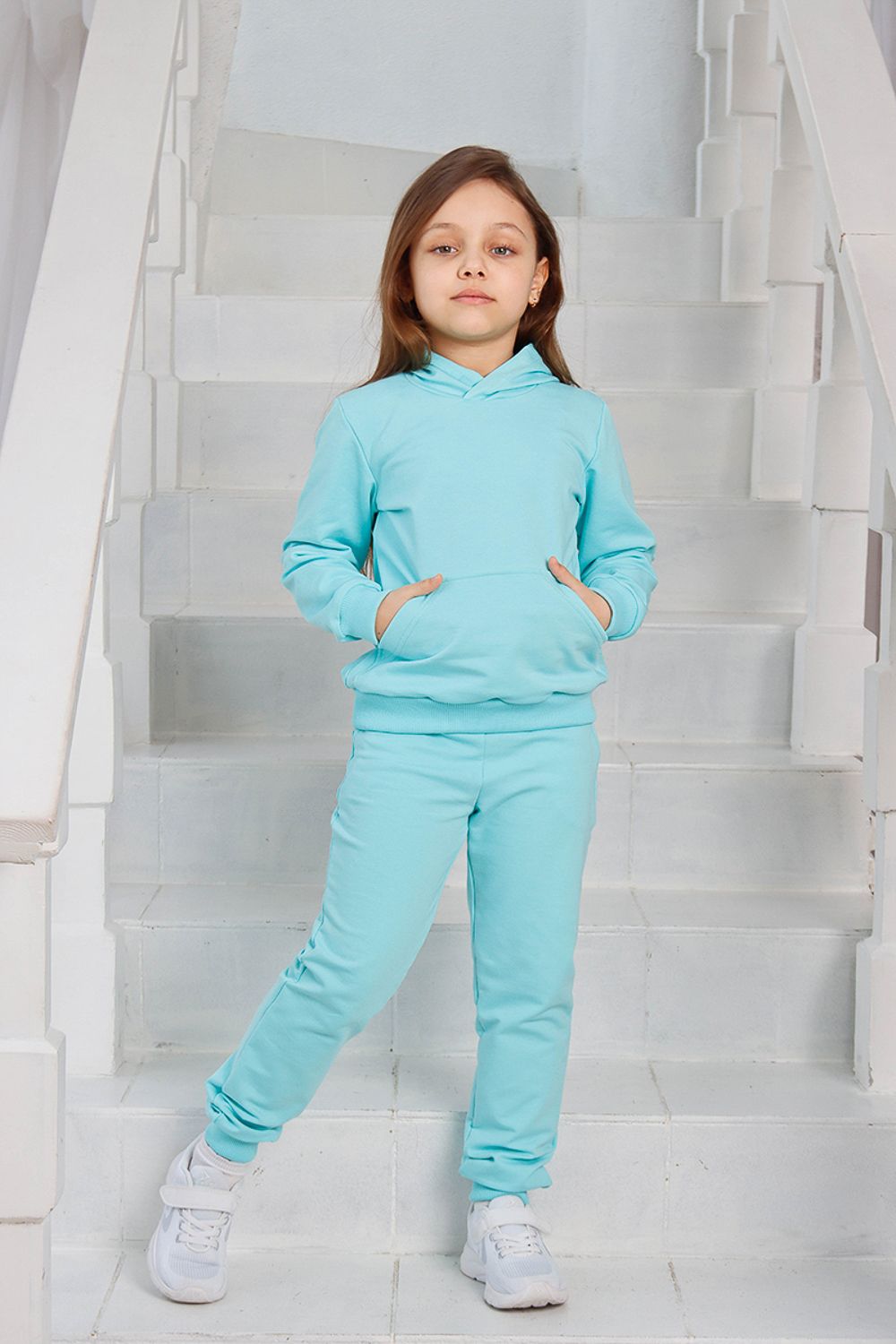 Костюм для девочек дошкольного и младшего школьного возраста. Костюм состоит из толстовки и штанов. Костюм из трикотажного эластичного хлопкового однотонного полотна футер . Толстовка с капюшоном, с длинным рукавом на манжете и поясе из основного полотна. На переде толстовки расположен карман-кенгуру. Штаны с боковыми карманами, на манжетах и поясе из основного полотна.