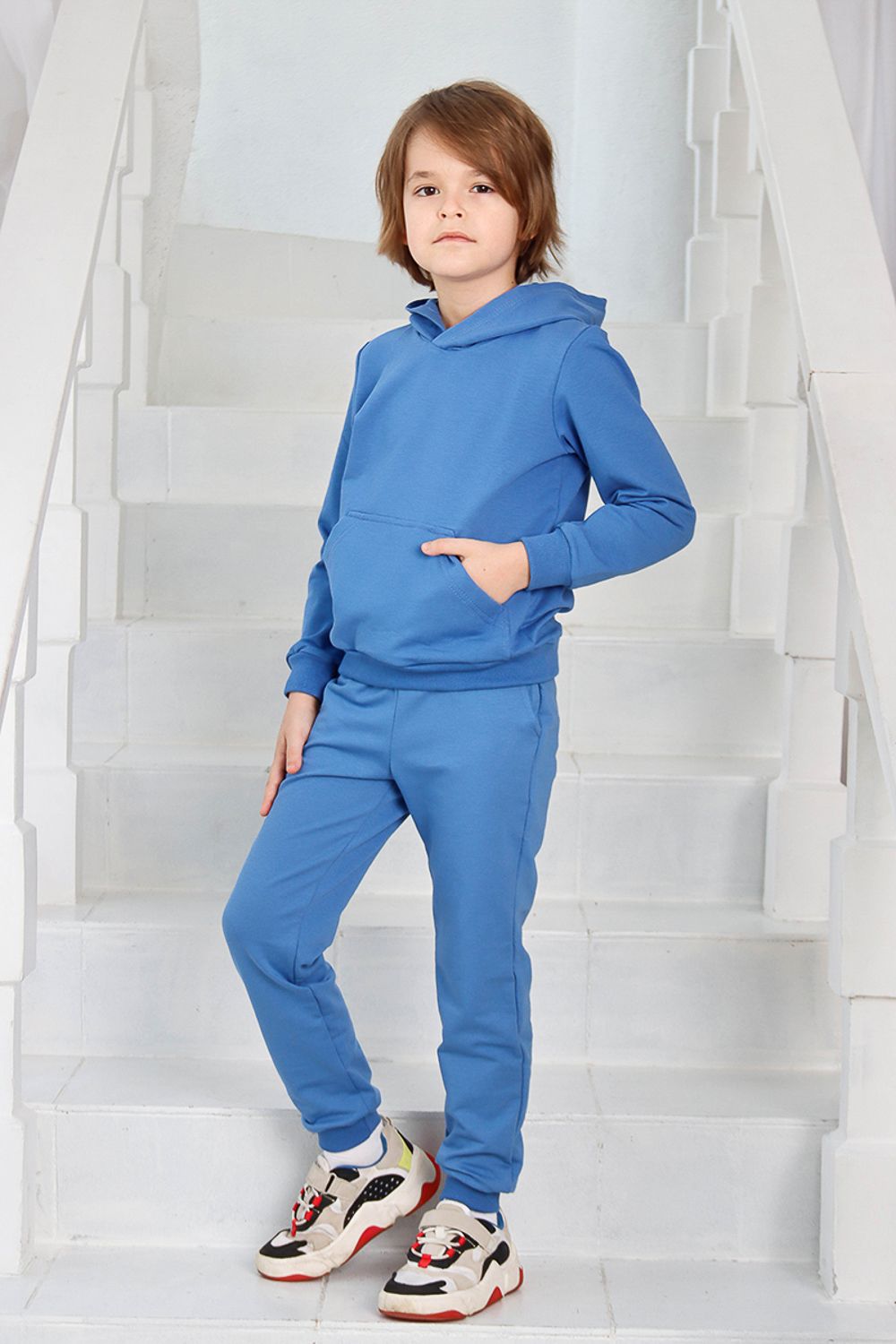 Костюм для девочек и мальчиков дошкольного и младшего школьного возраста. Костюм состоит из толстовки и брюк. Костюм из эластичного хлопкового однотонного футера. Толстовка с капюшоном, с длинным рукавом на манжете и поясе из основного полотна. На переде толстовки расположен карман-кенгуру. Брюки с боковыми карманами, на манжетах и поясе из основного полотна.