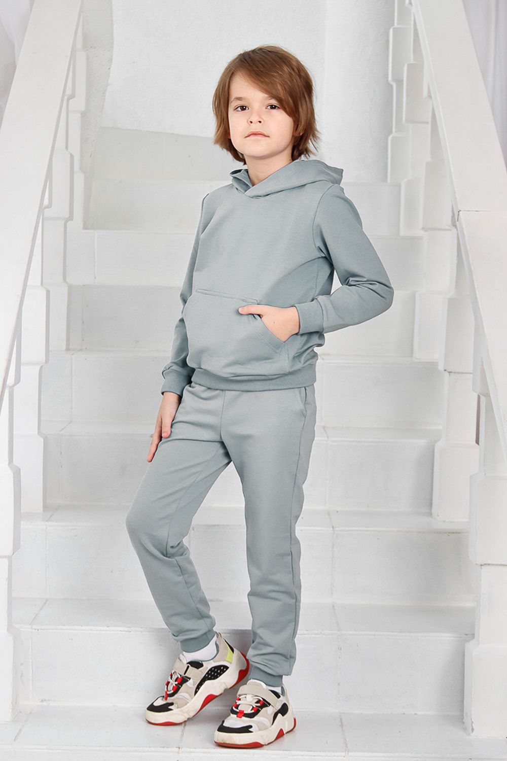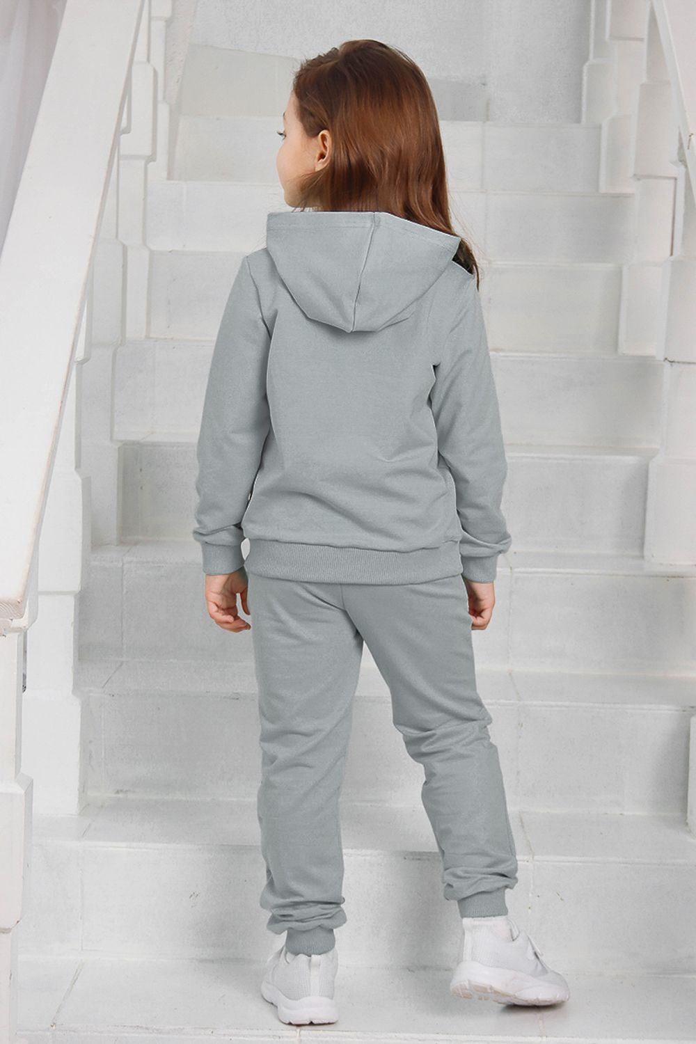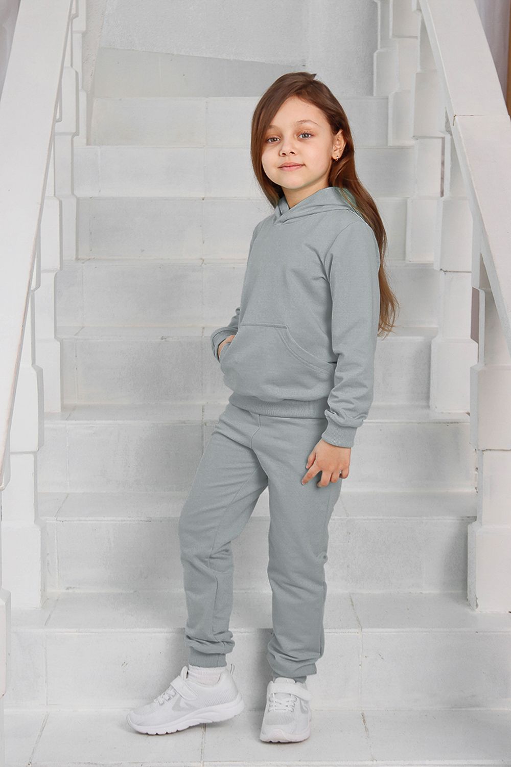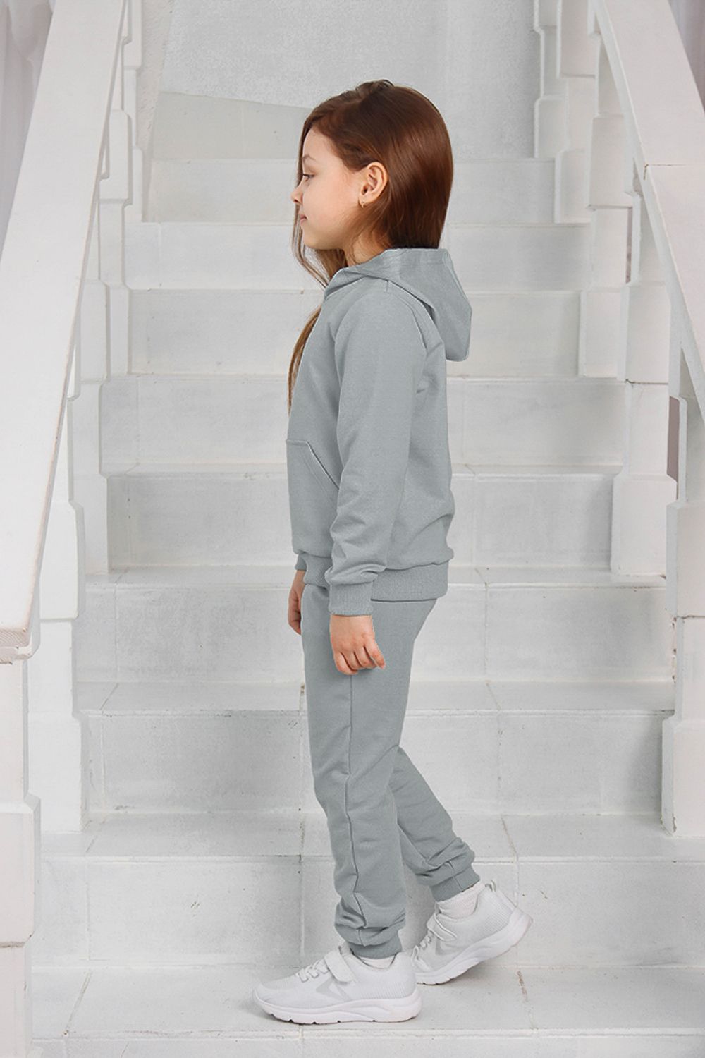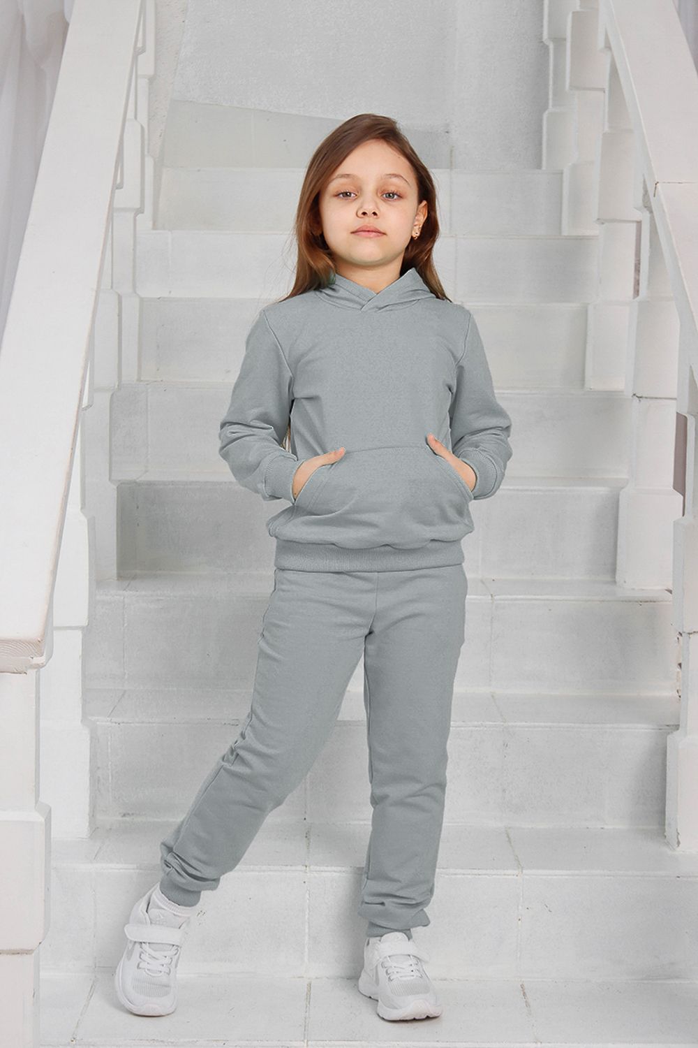 Костюм для девочек дошкольного и младшего школьного возраста. Костюм состоит из толстовки и штанов. Костюм из трикотажного эластичного хлопкового однотонного полотна футер. Толстовка с капюшоном, с длинным рукавом на манжете и поясе из основного полотна. На переде толстовки расположен карман-кенгуру. Штаны с боковыми карманами, на манжетах и поясе из основного полотна.
