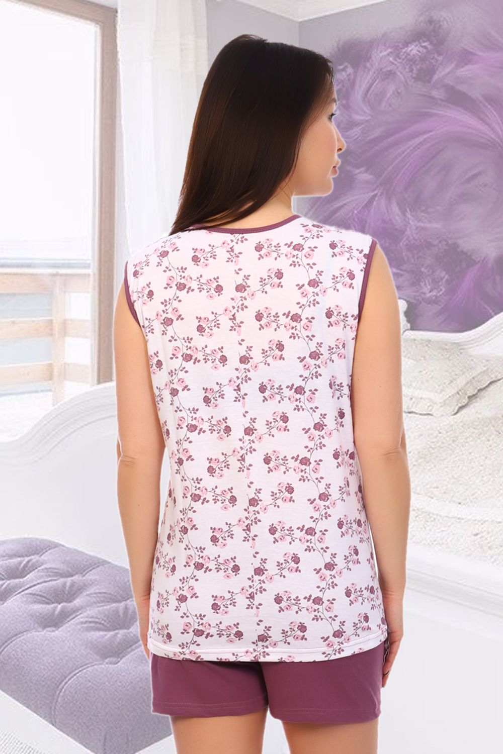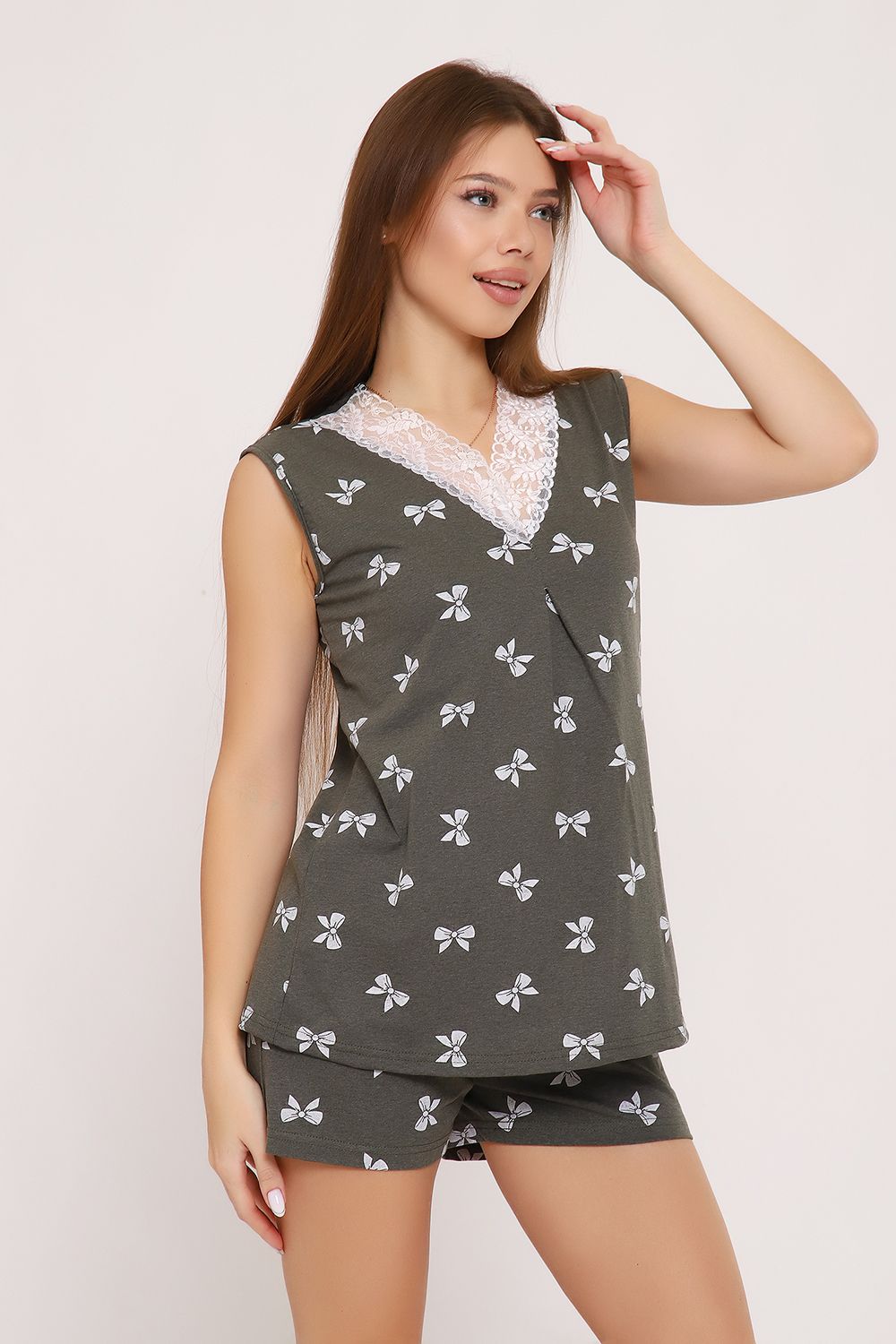 Костюм майка и шорты. Шорты полуприлегающего силуэта, выполнены из однотонной ткани. Майка свободного покроя за счет складки по центру полочки. Горловина обработана кружевом.