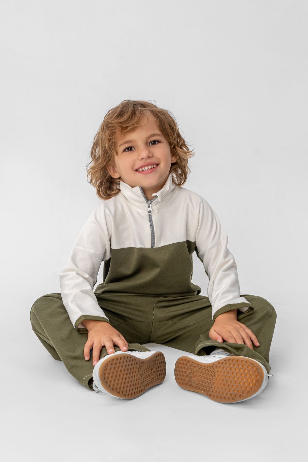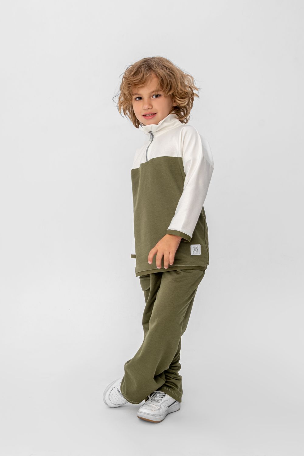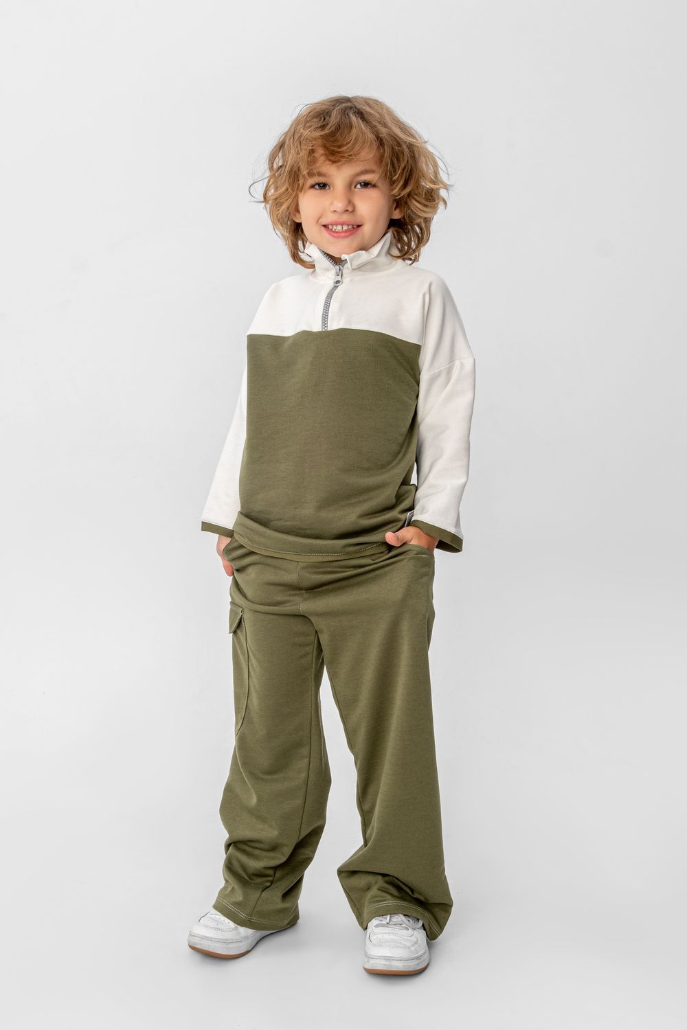 Костюм из футера двунитки. Свитшот и брюки. Свитшот дополнен нашитыми световозвращающими элементами. Брюки прямого кроя с боковыми карманами и накладным карманом на брючине.