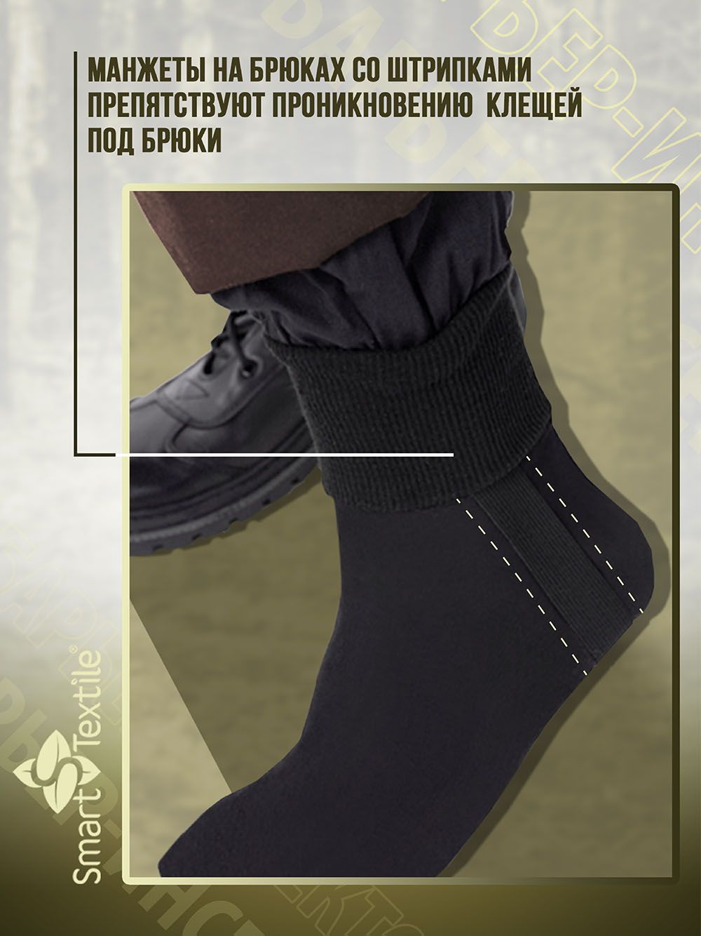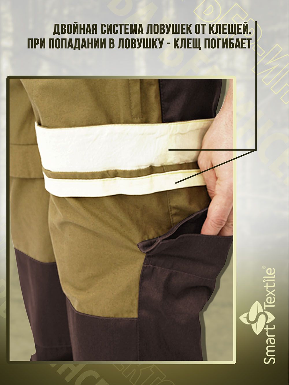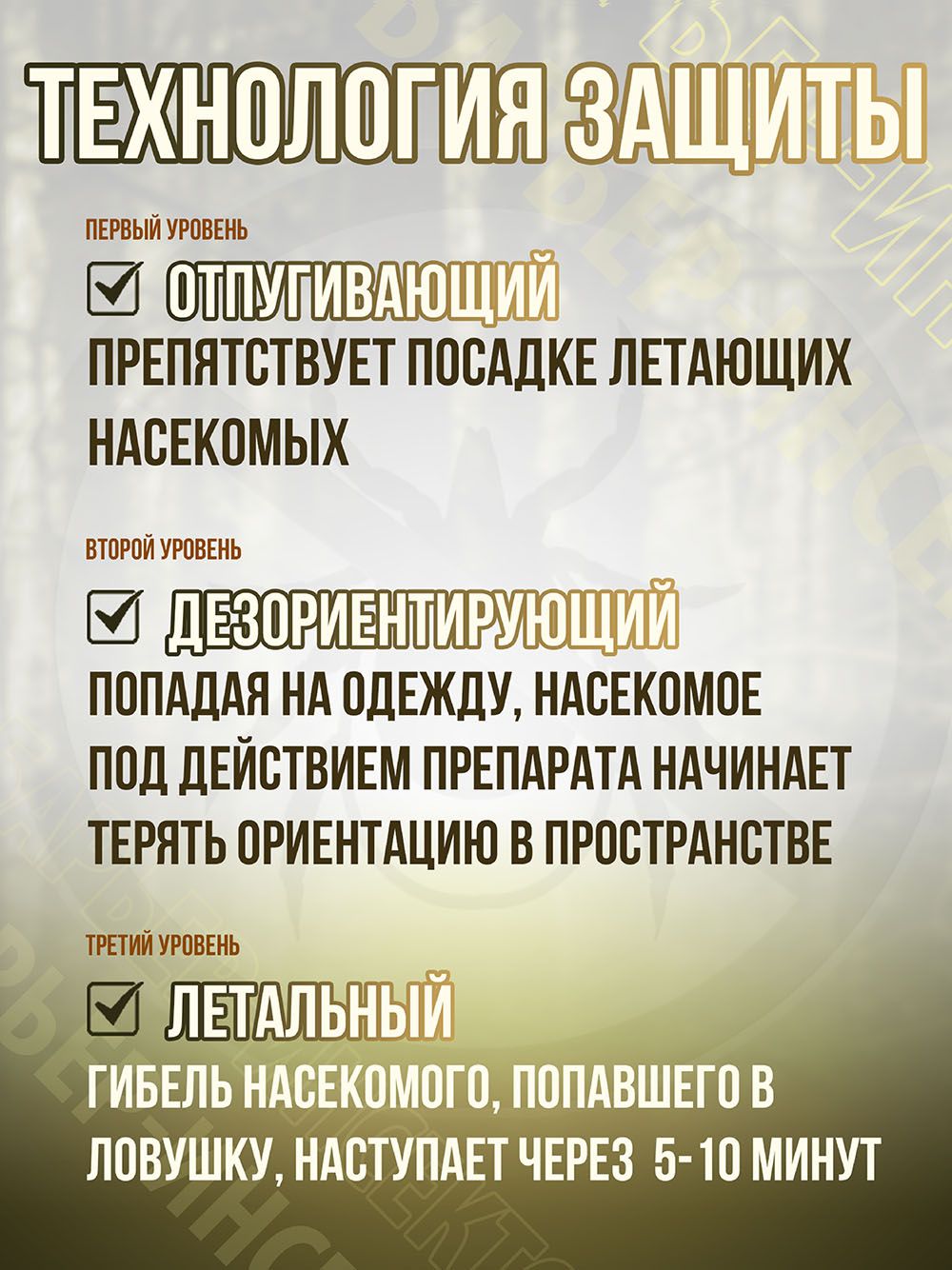 Костюм не только имеет физические параметры защиты, но и специальную акарицидно-репеллентную обработку ловушек. Эта обработка оказывает тройное действие на насекомых: