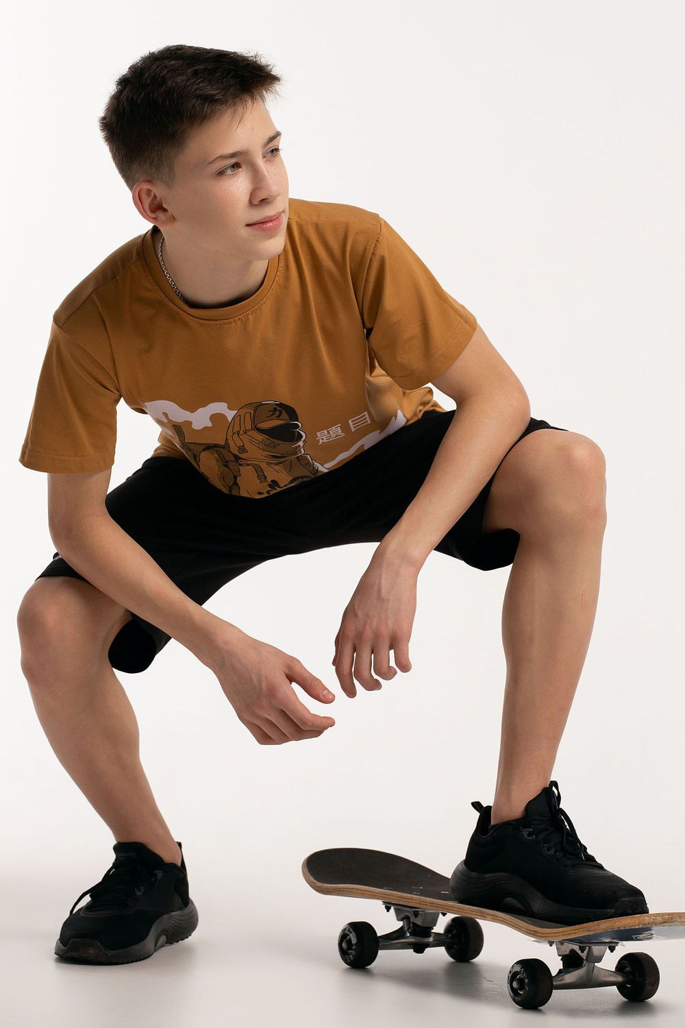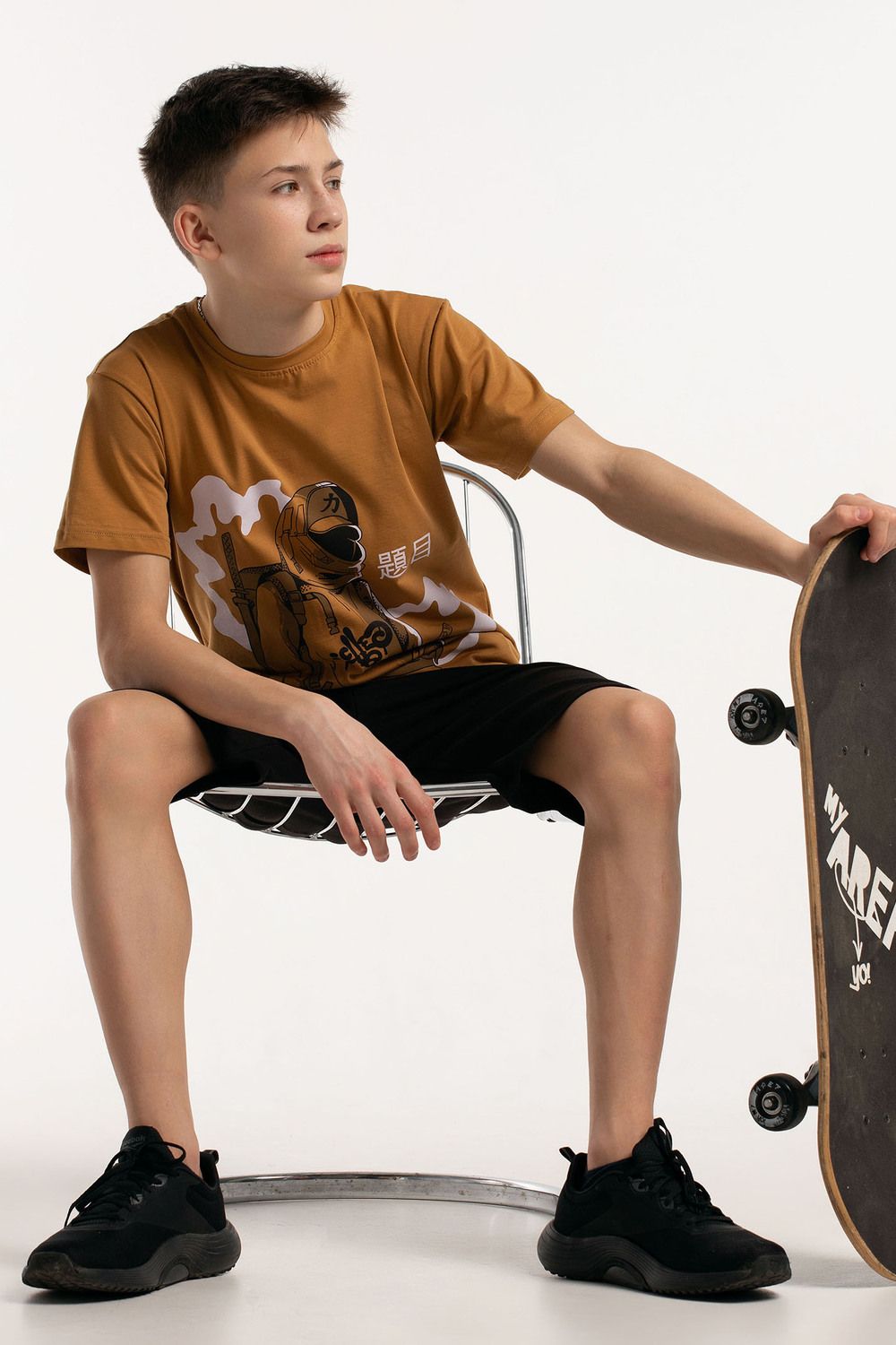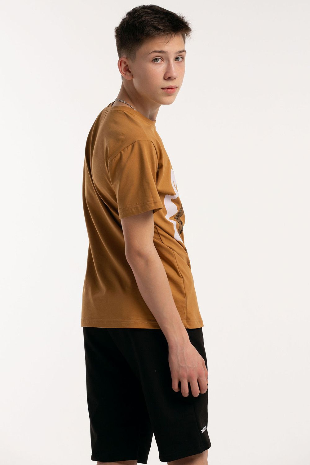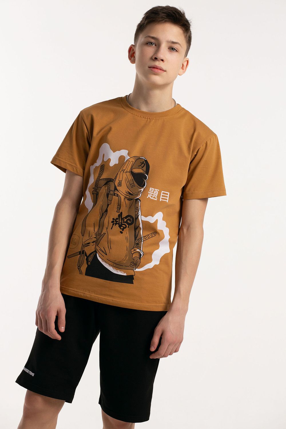 Костюм для подростков состоит из двух изделий - футболки и шорт. Футболка выполнена из ткани с абстрактным принтом. Футболка прямого свободного кроя, круглый вырез горловины, втачной рукав. Шорты выполнены из футера 2-х нитки, прямого кроя, с удобной посадкой. На передней половинке шорт - печать.